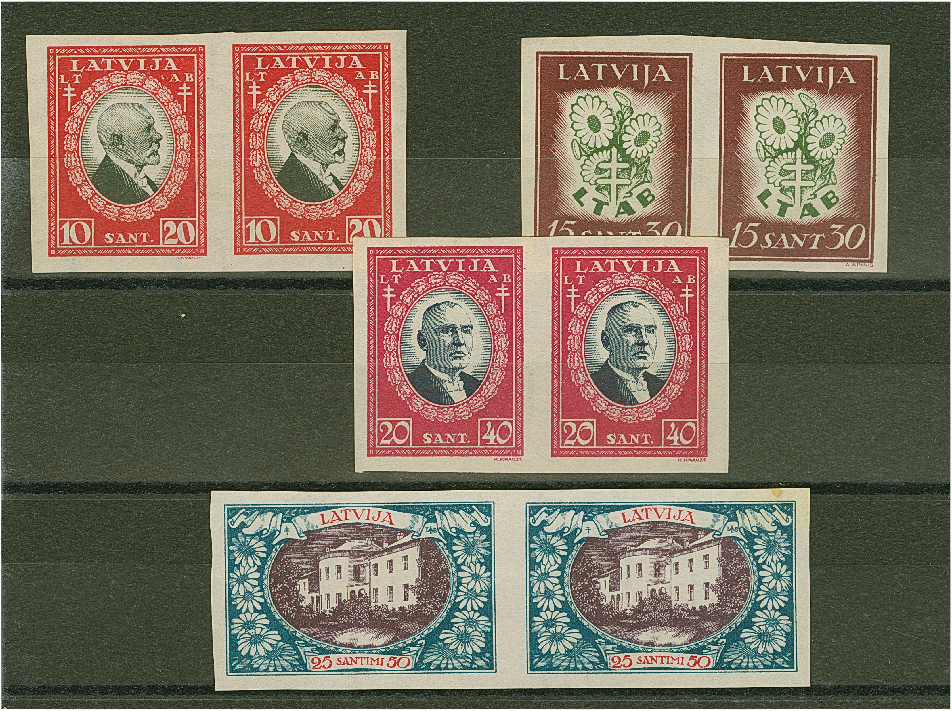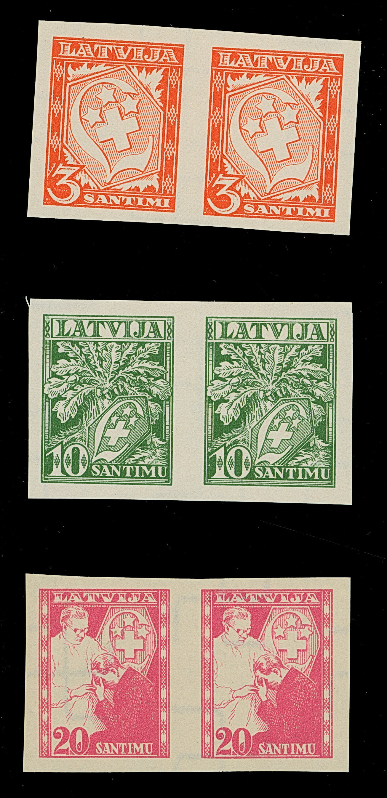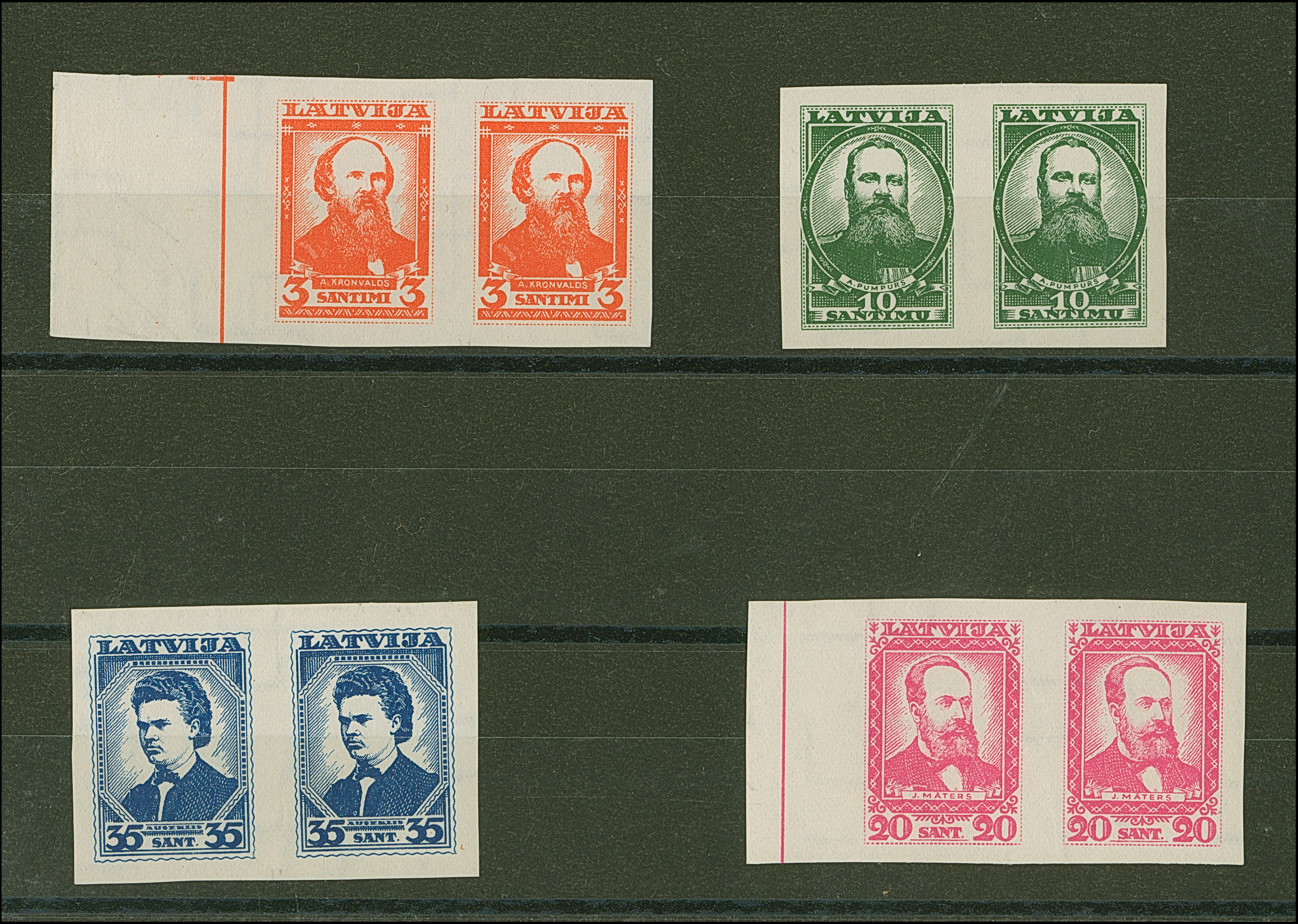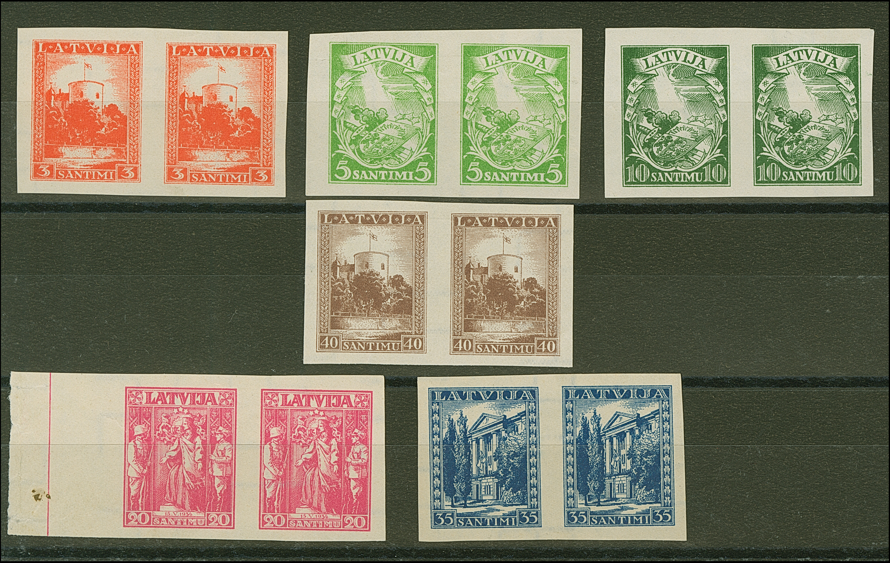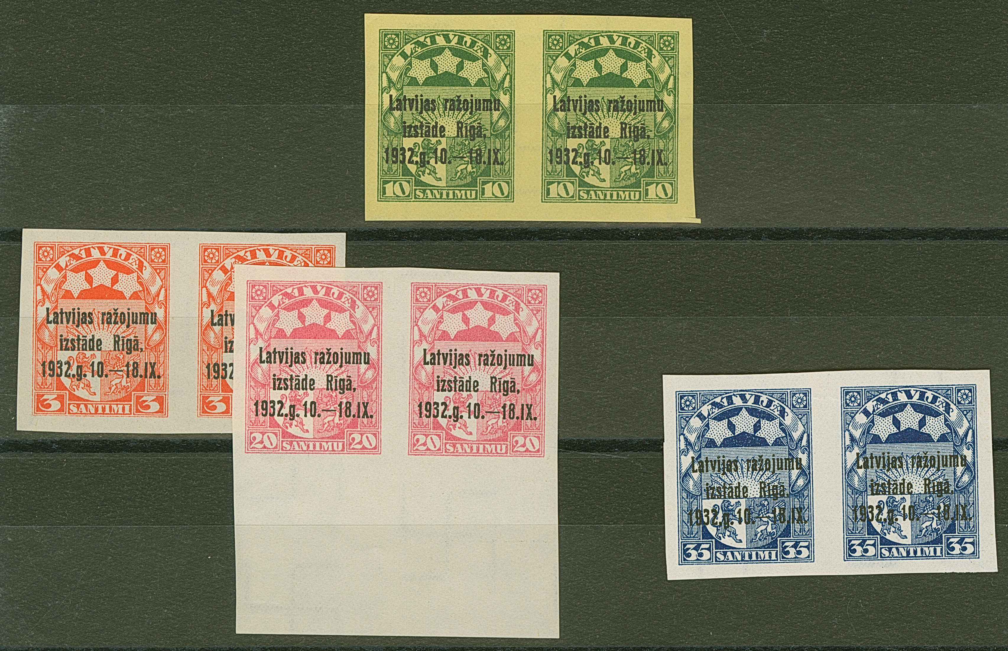 1932, Riga Exhibition 3-35 santimi, archive proofs, imperforated horizontal pairs, without gum, scarce, fine