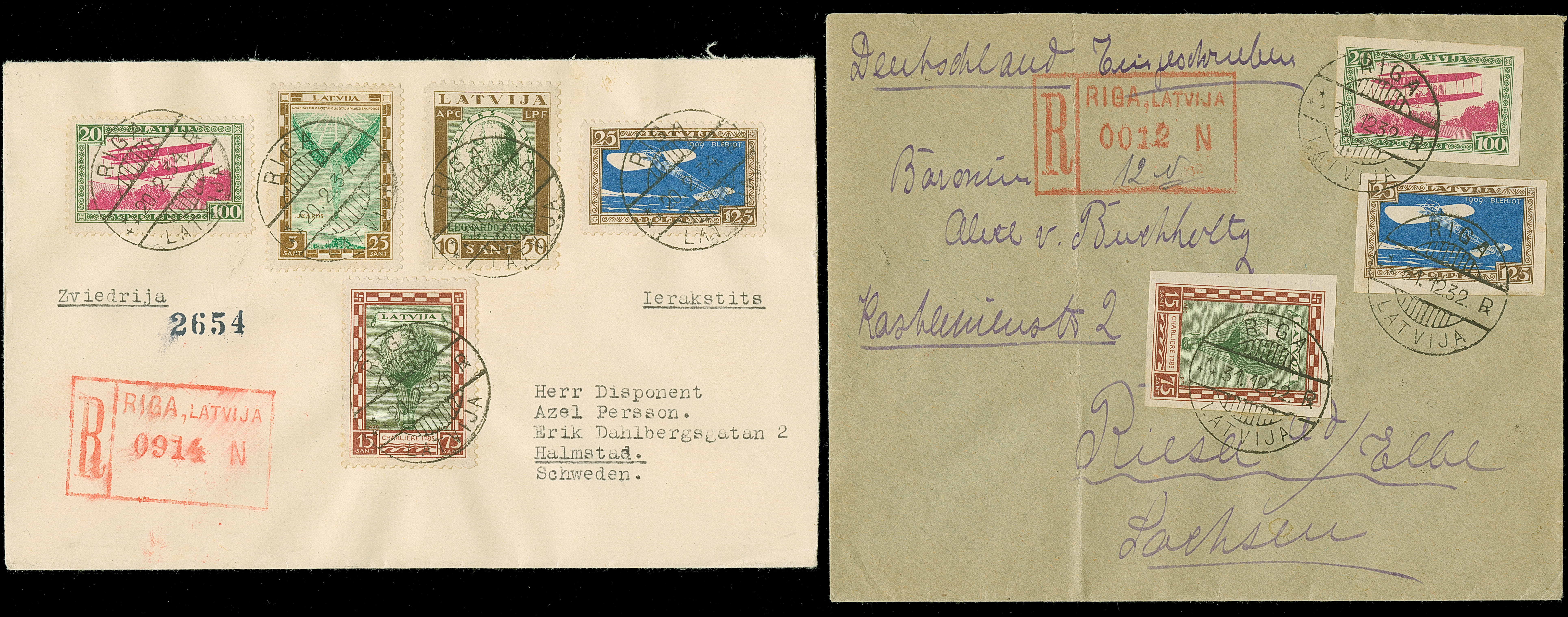 1932, Relief fund 5-25 santimi, perforated and imperforated, each as complete set tied by cds. “RIGA” to registered covers to Sweden and German, the one to Germany folded once, otherwise fine