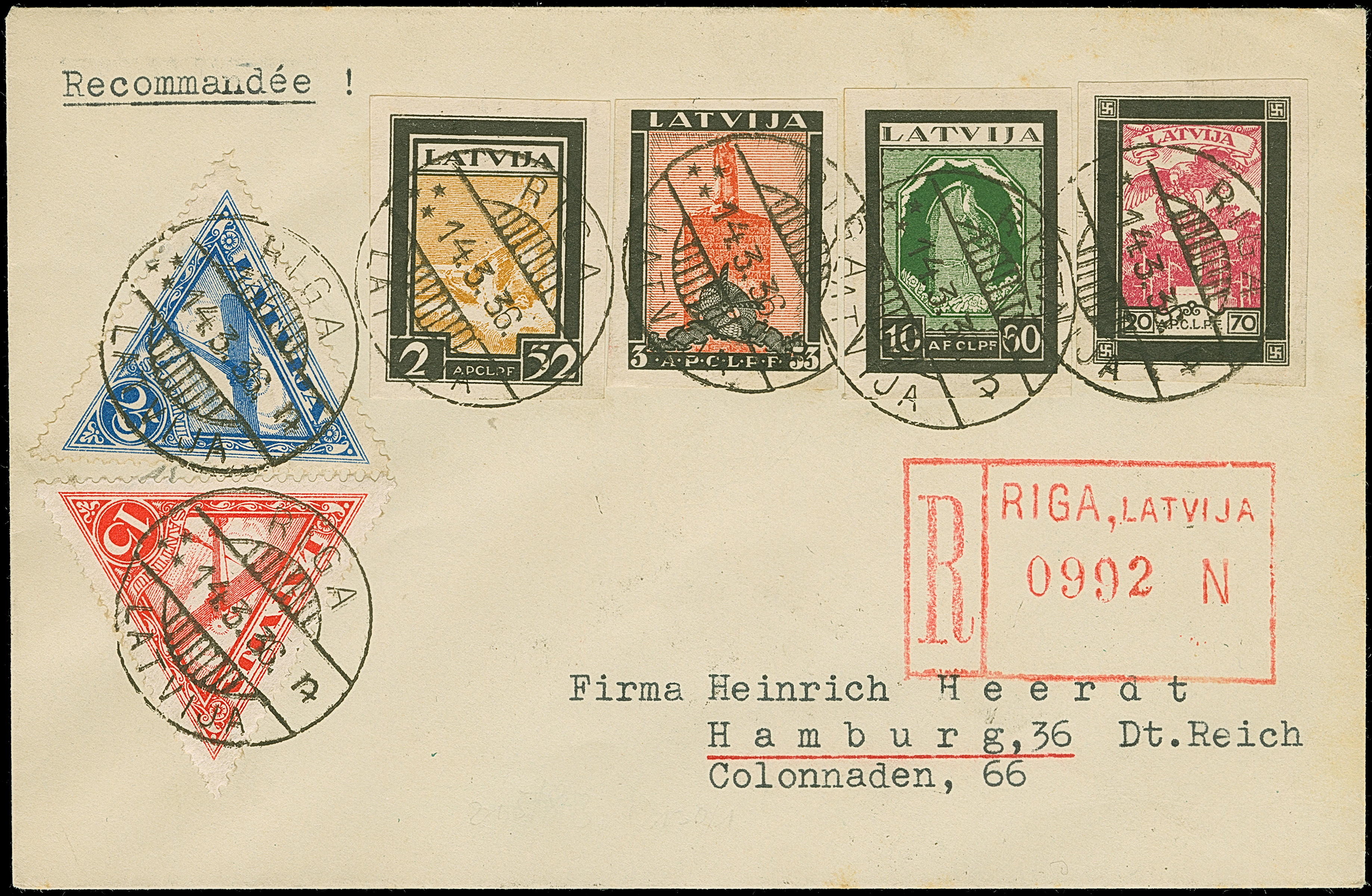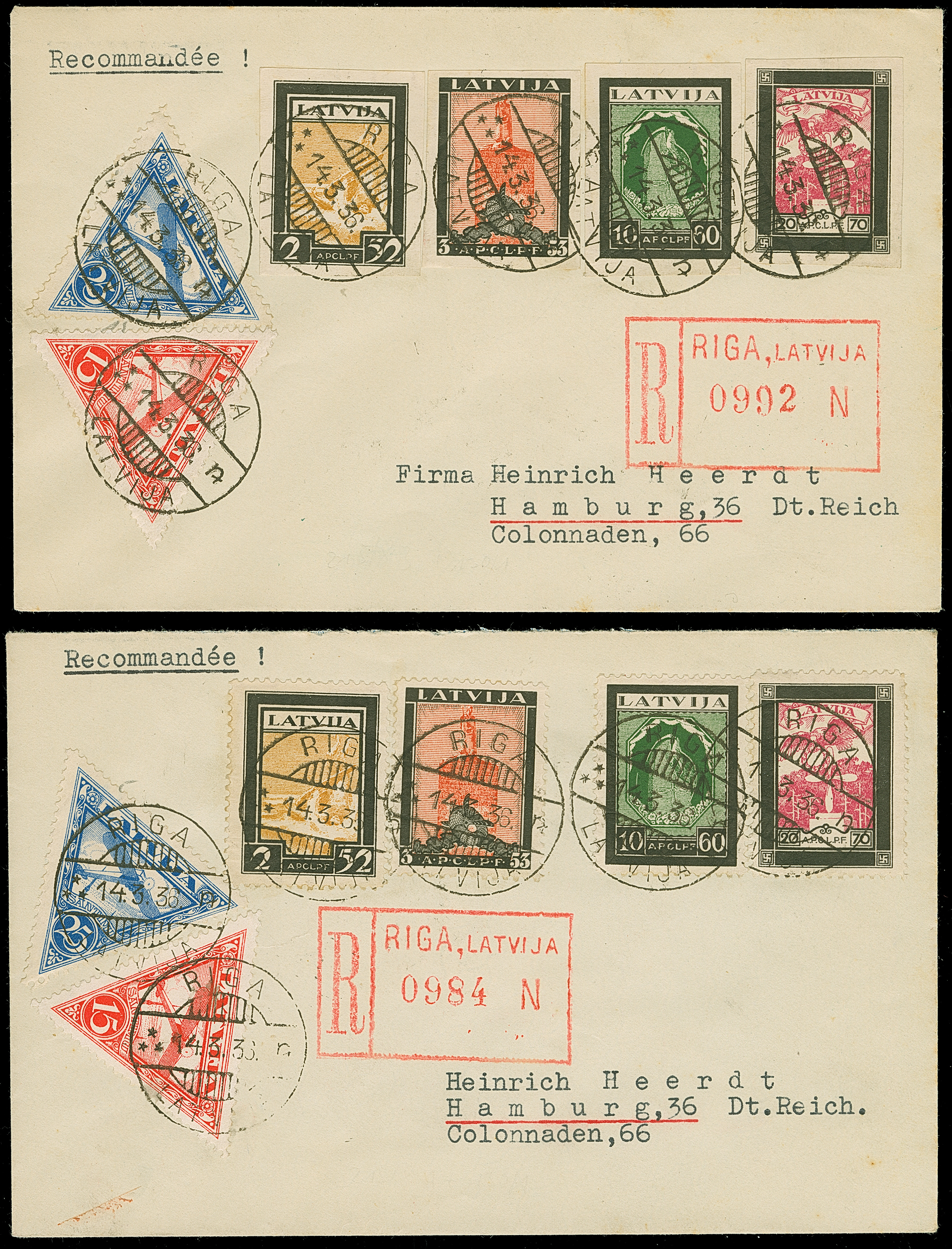 1932, Relief fund 2-20 santimi, perforated and imperforated, each as complete set with additional franking, tied by cds. “RIGA” to registered covers to Hamburg, fine