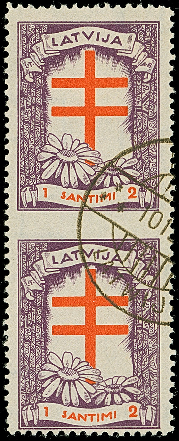 1930, Anti-Tuberculosis 1+2 santimi violett/red, vertical pair, imperforated horizontally, used, a scarce variety, especially so in used condition, fine