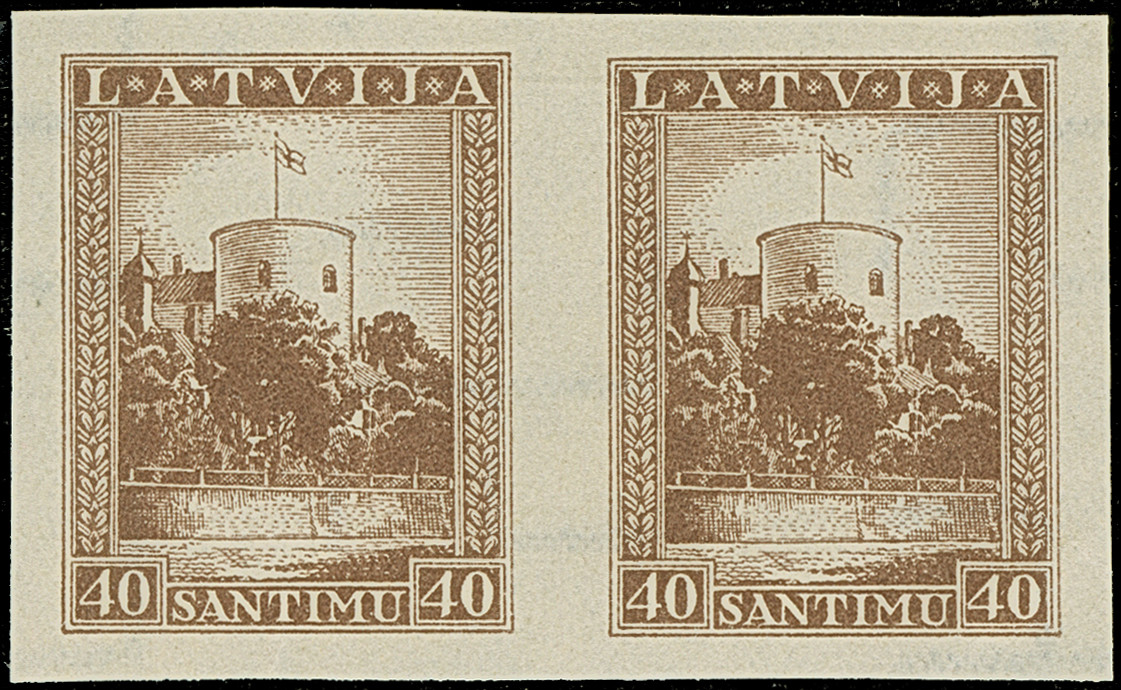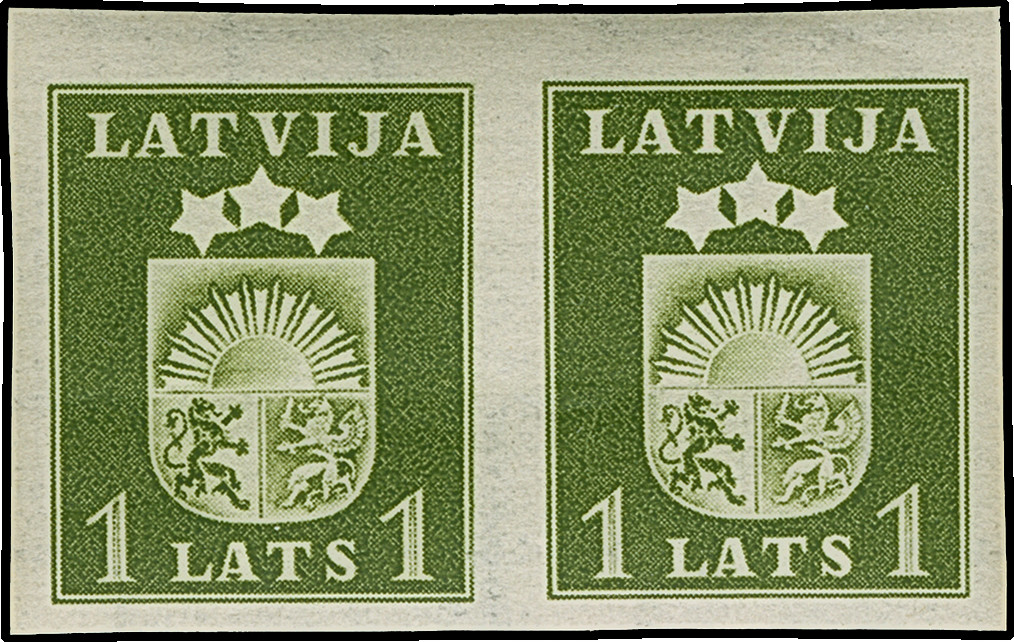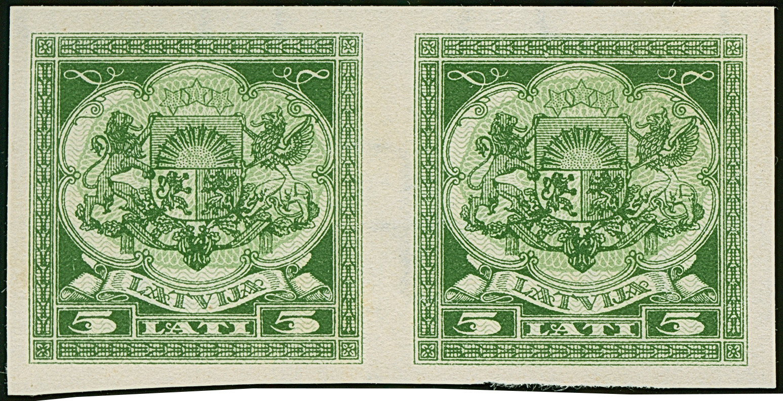 1933, Coat of arms 5 lats green, archive proof, imperforated horizontal pairs, both watermarks, without gum, scarce, fine