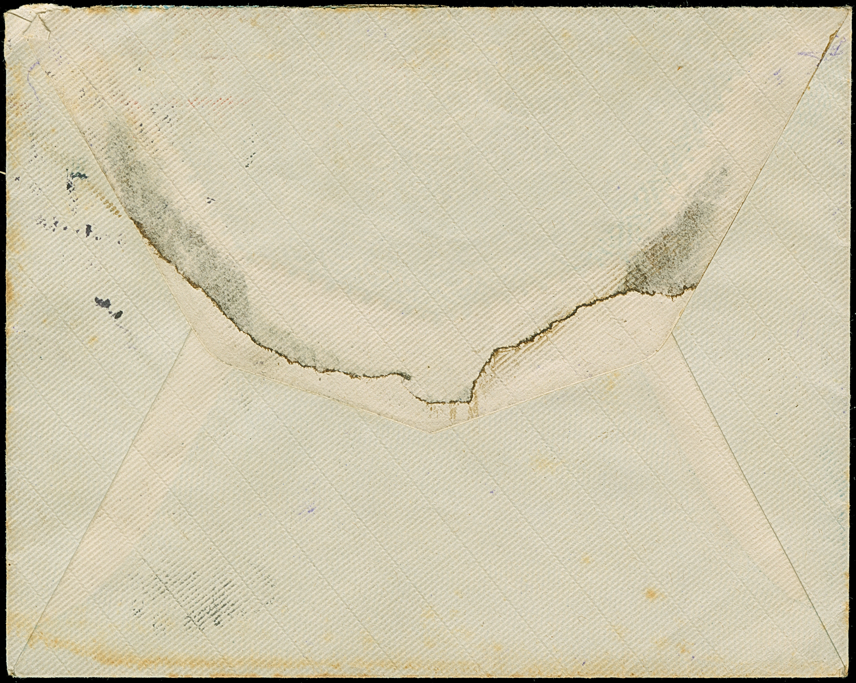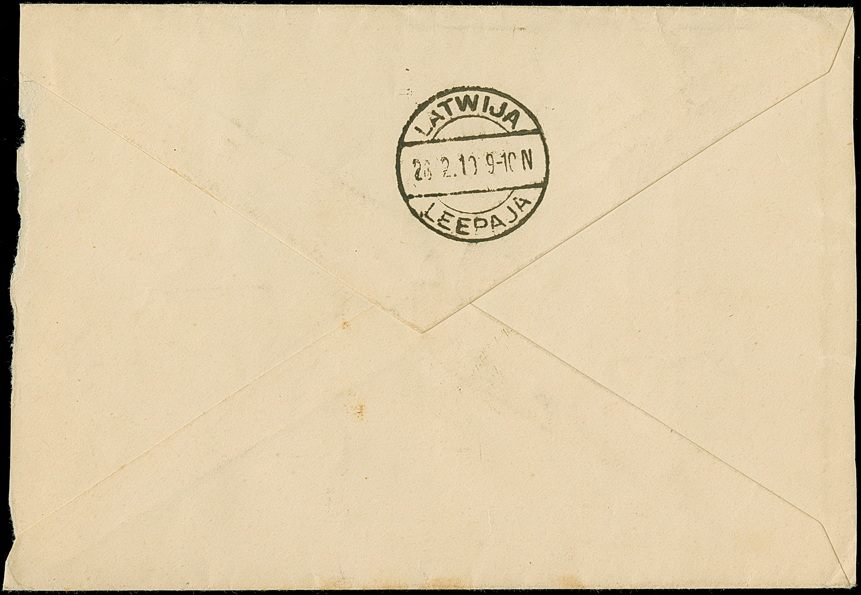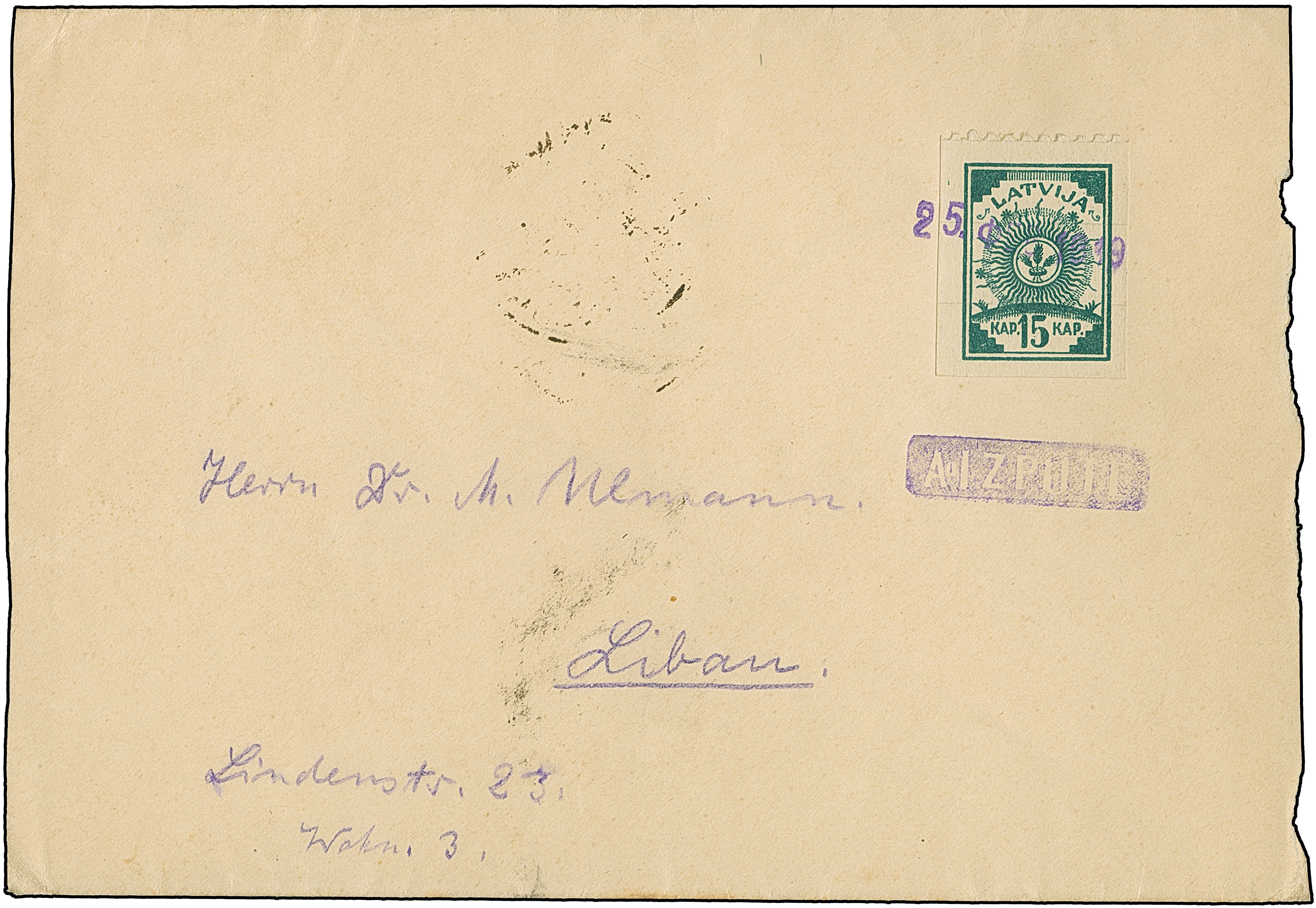 “25. ФЕВ 1919” on Ear of corn 15 kap green on cover to Libau with adjacent negativ-cancel “AIZPUTE”, roughly opened at right, otherwise fine (H.v.H 004.1, 004.2)