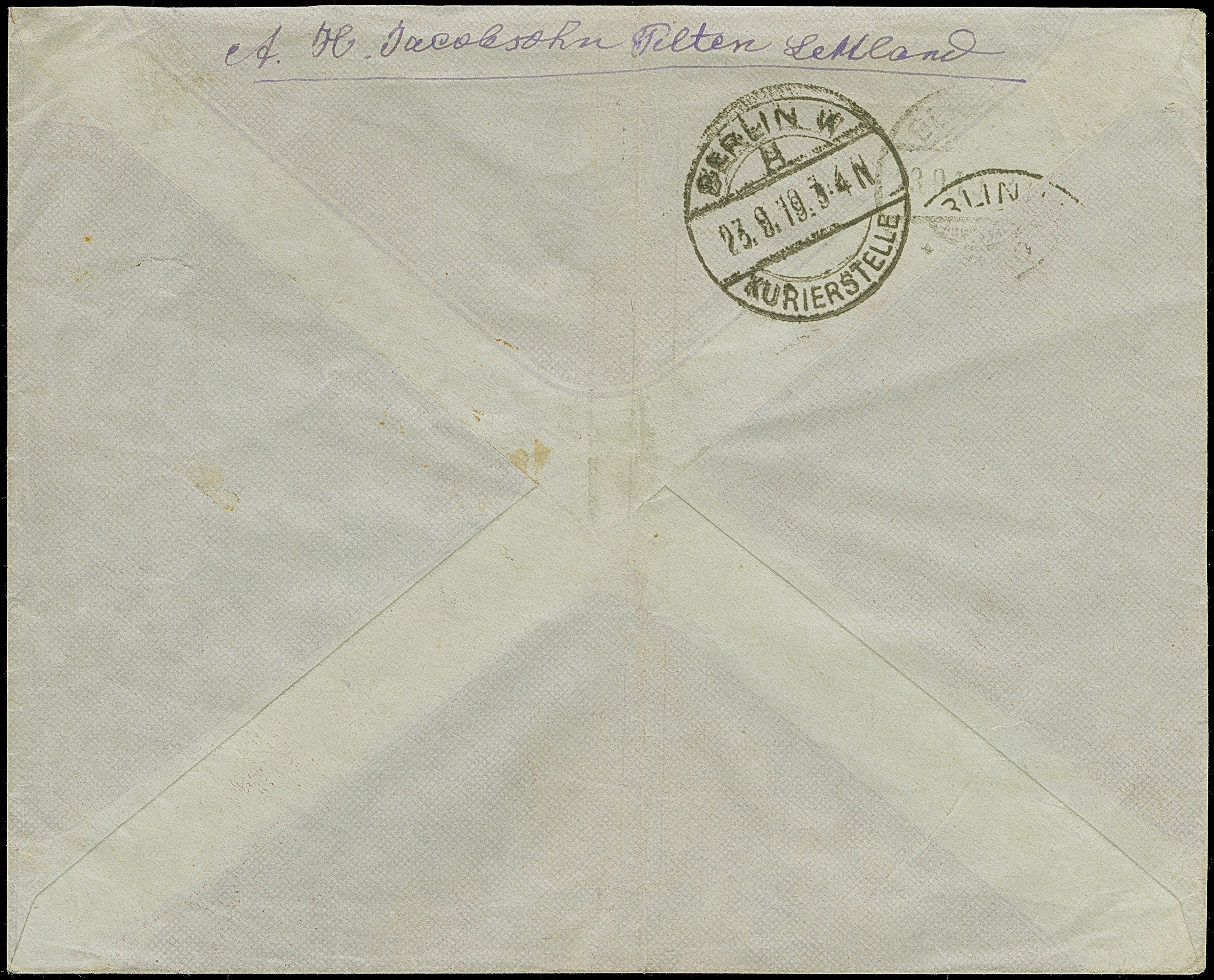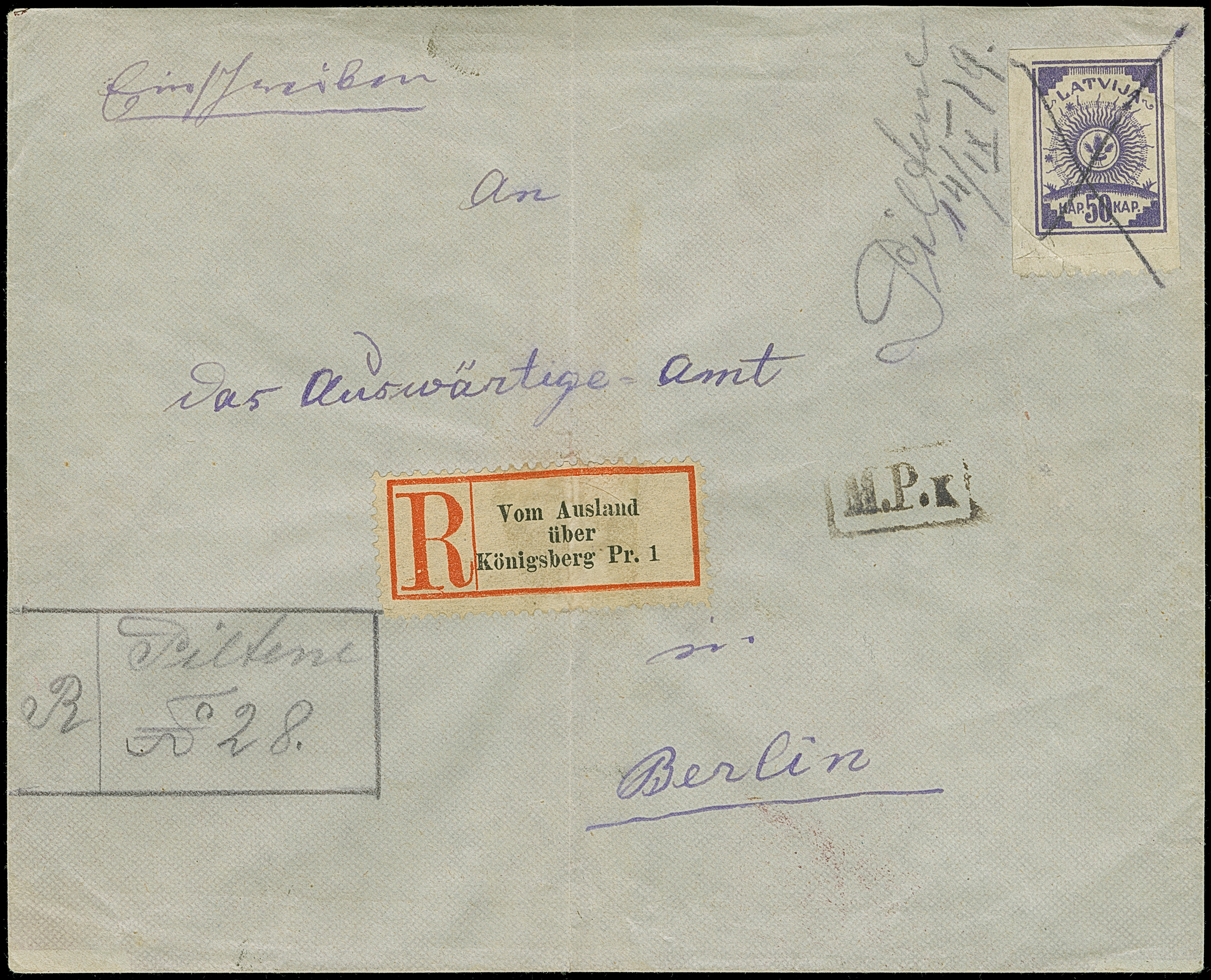 “Piltene 14/IX 19”, manuscript cancellation next to Ear of corn 50 kap violet, tied by pen cross, on registered cover with provisional r-label “Piltene 528” tp Berlin, transit-r-label “Vom Ausland über Königsberg” and censor mark applied, folded once, otherwise fine, scarce