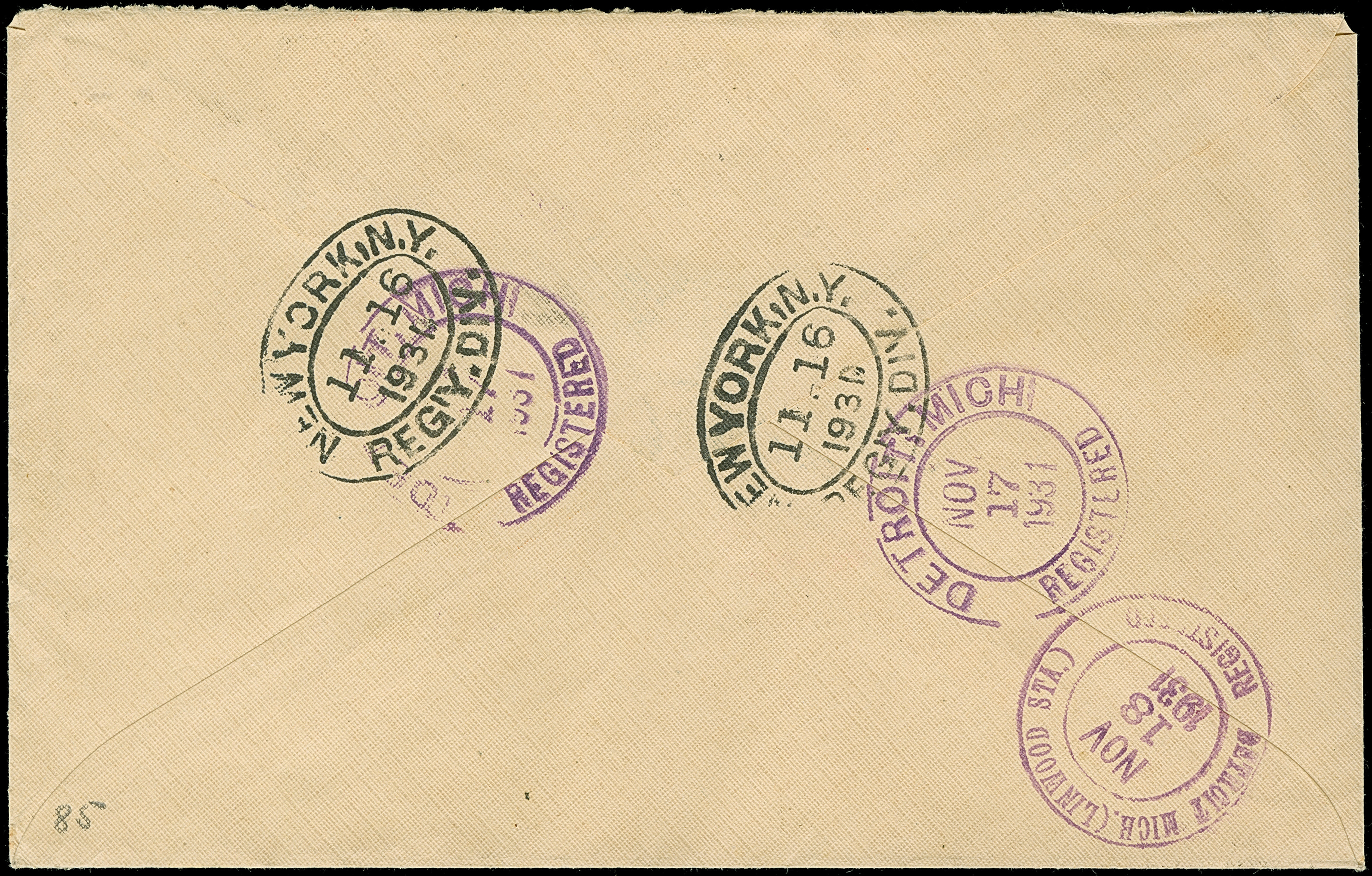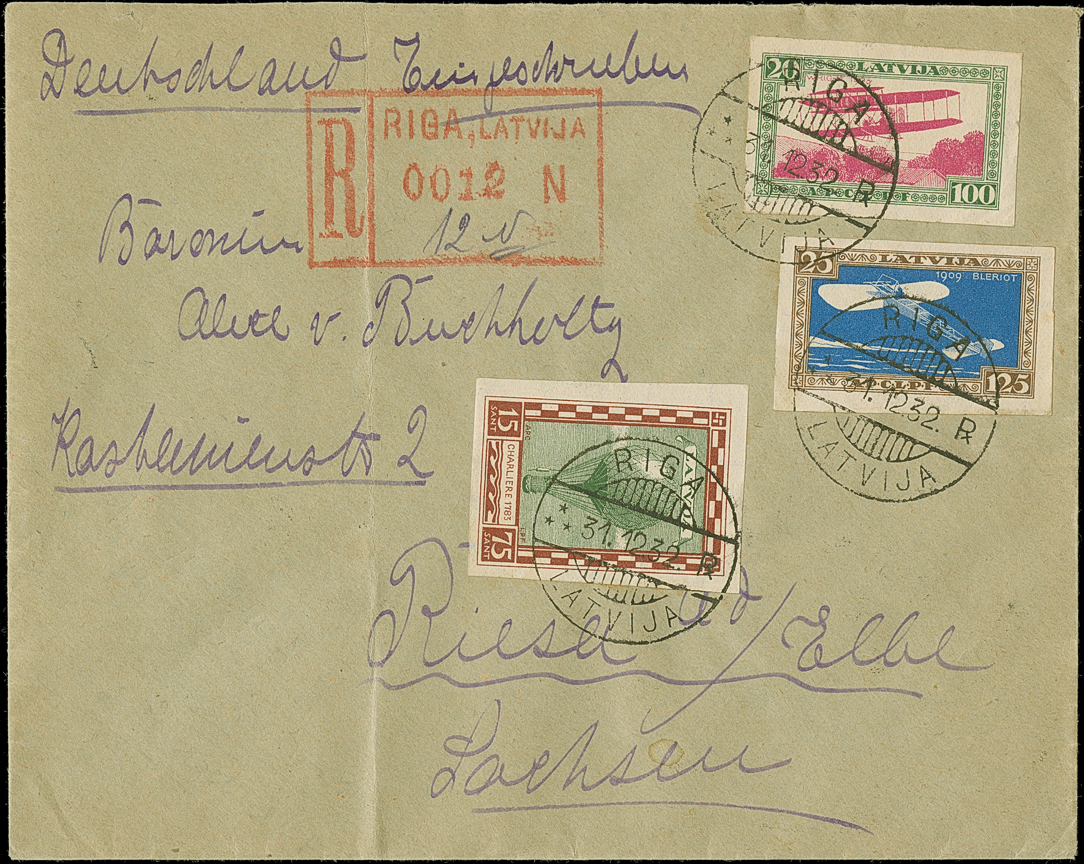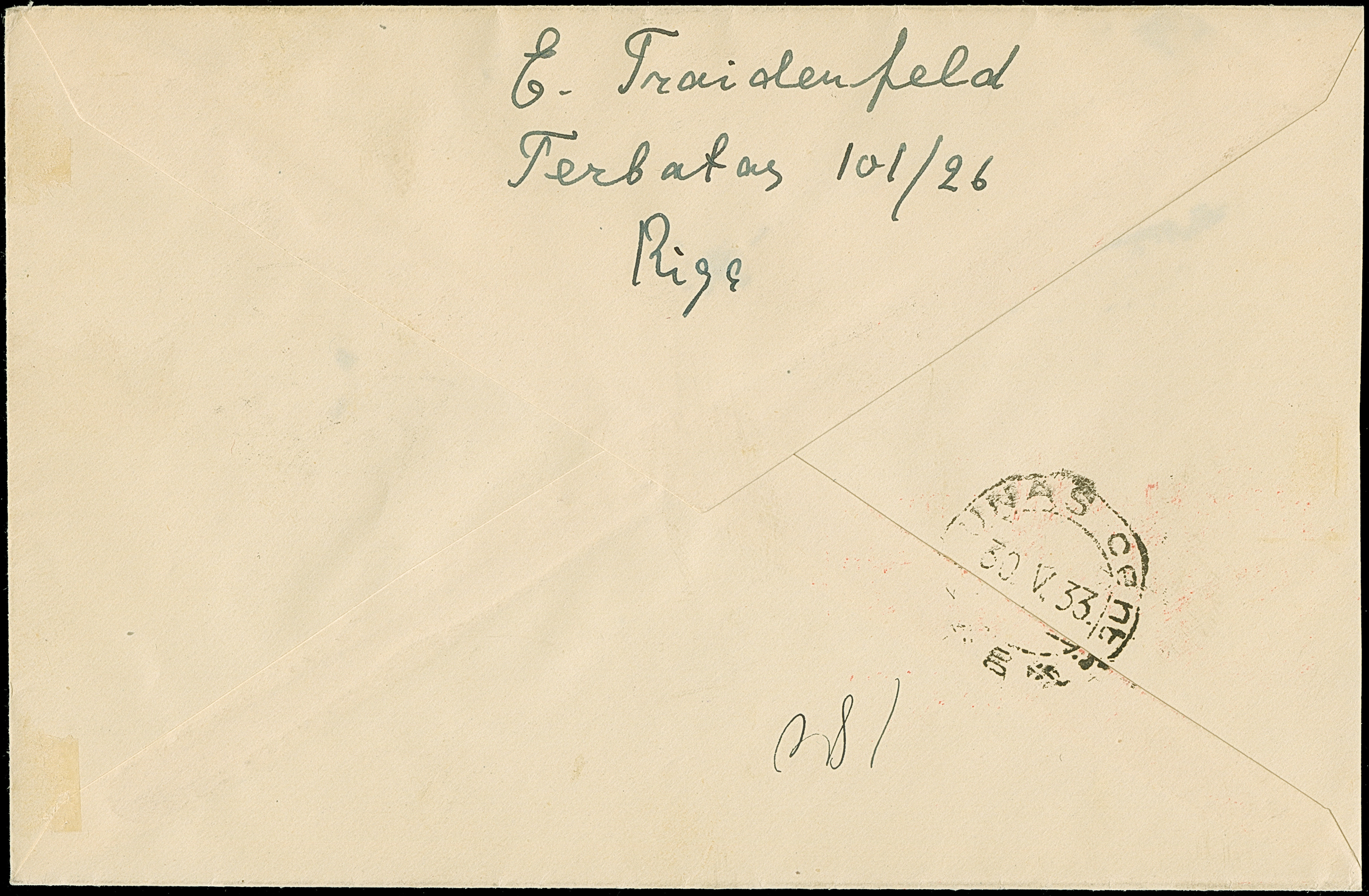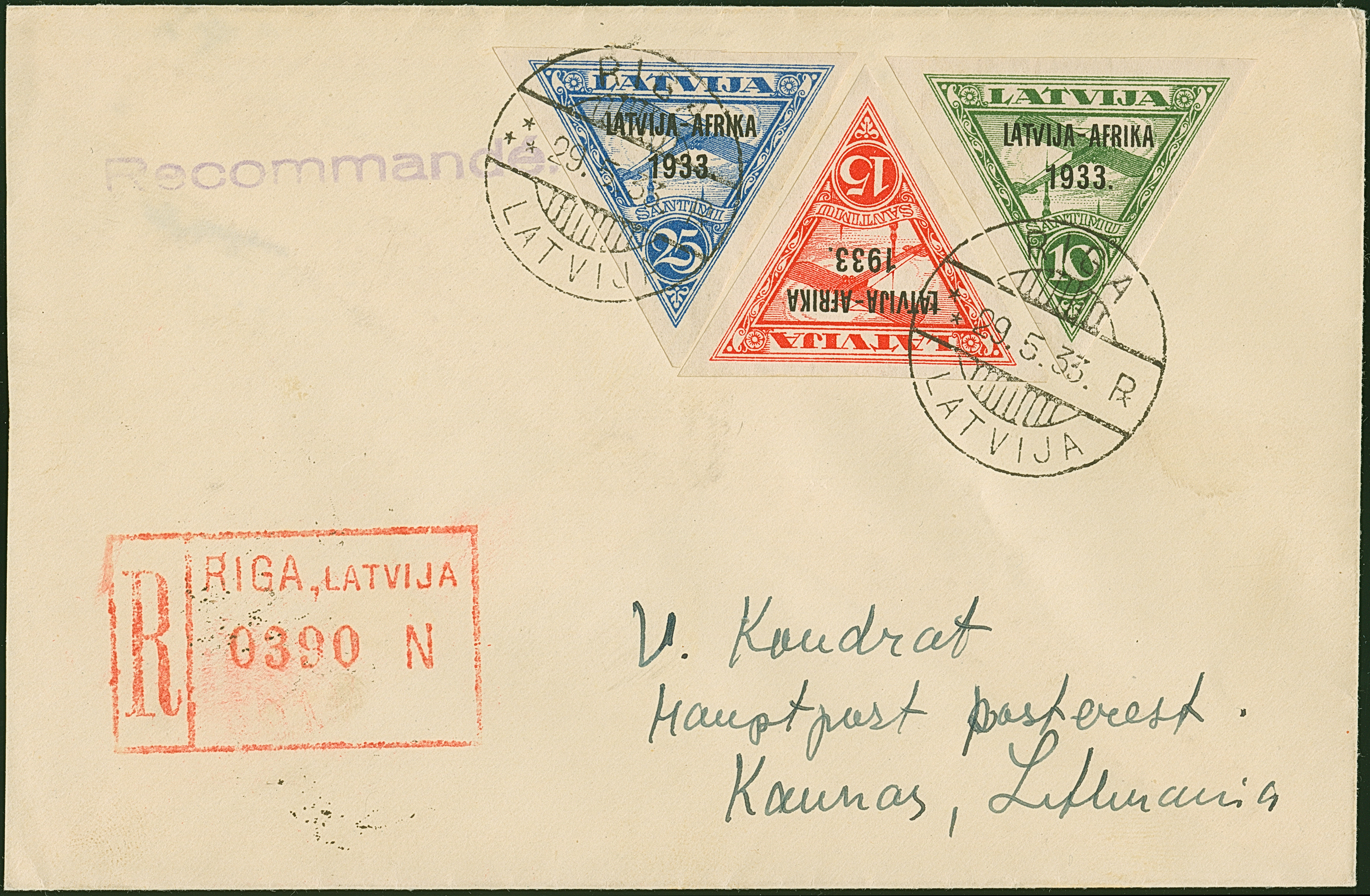 1933, Riga-Bathurst-Flight 10-25 santimi, tied by cds. “RIGA 29.5.35” to registered cover to Kaunas, Lithuania with arrival mark, fine