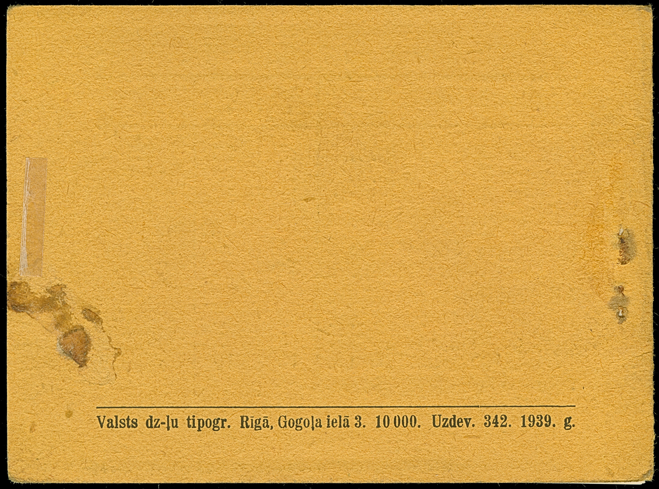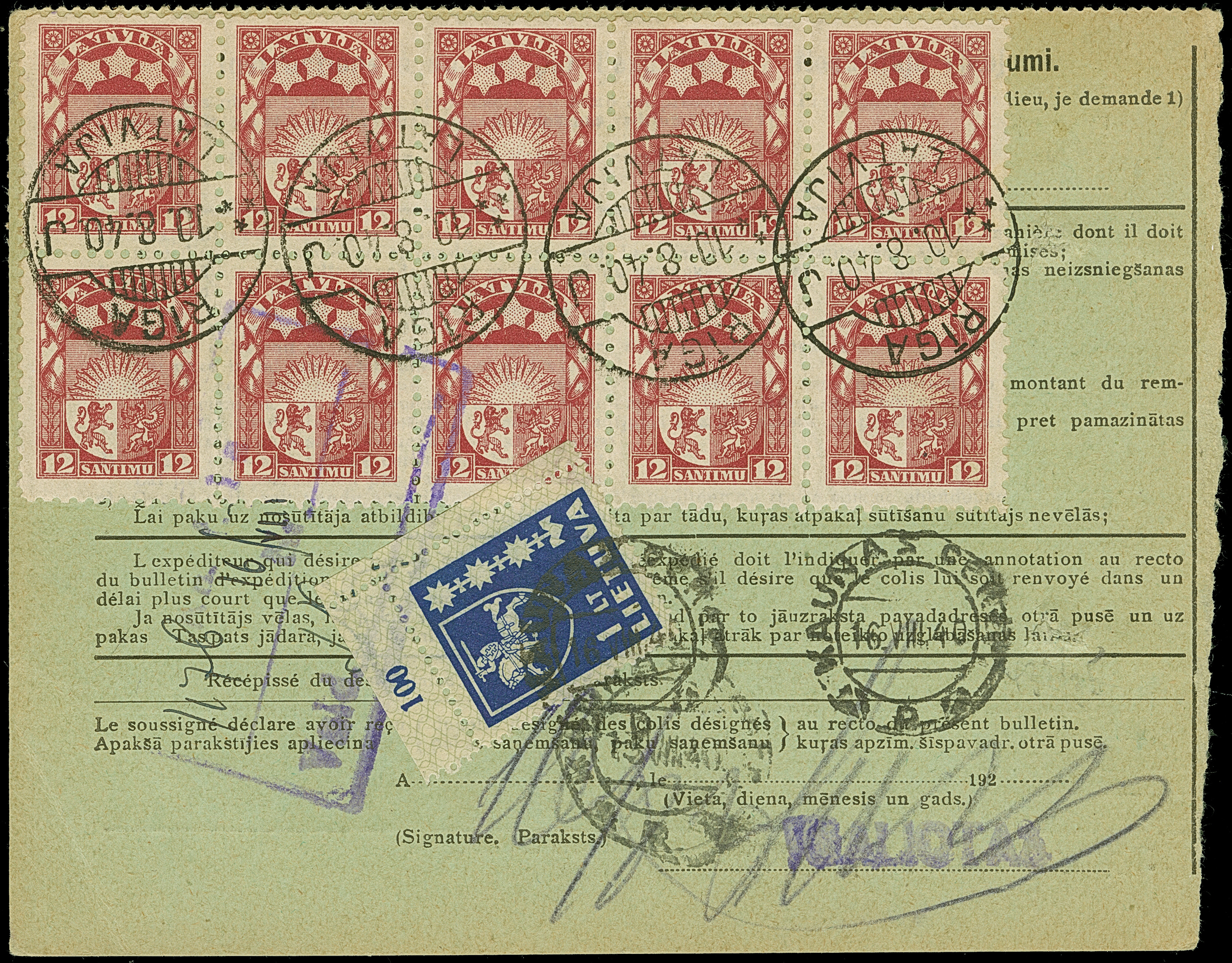 1933, Coat of arms 5 lats green, with additional franking, tied by cds. “RIGA 10.8.40” to parcel card to Kaunas, there franked with