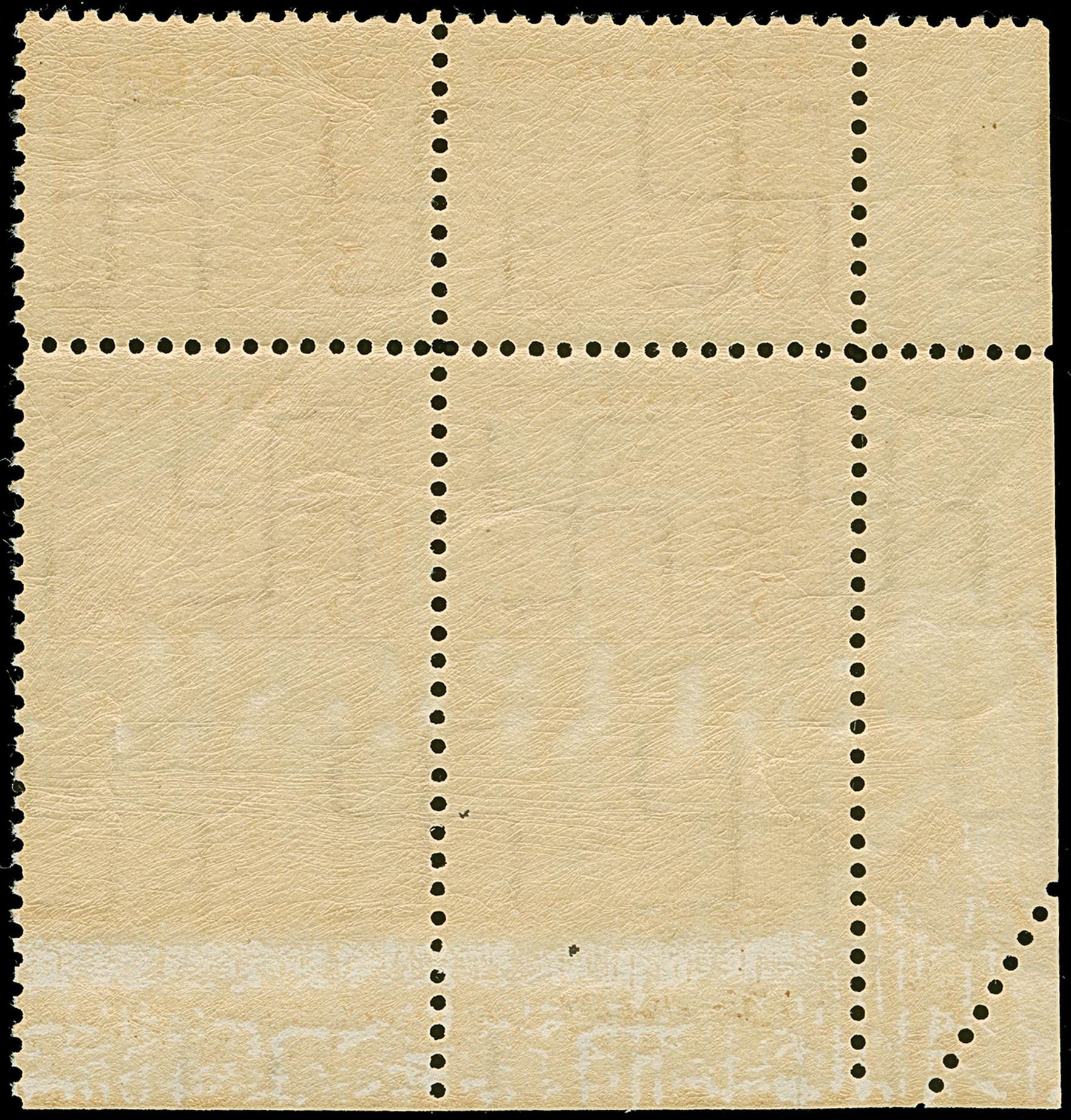 1938, 20th Anniversary of the Republic 3 santimi brown-red, block of four from the lower left sheet corner, lower stamps imperforated at bottom, slight misperforation in the margin, mint never hinged, fine