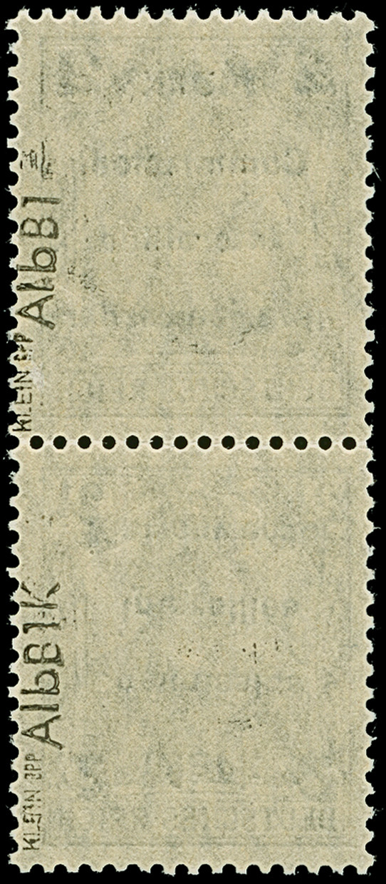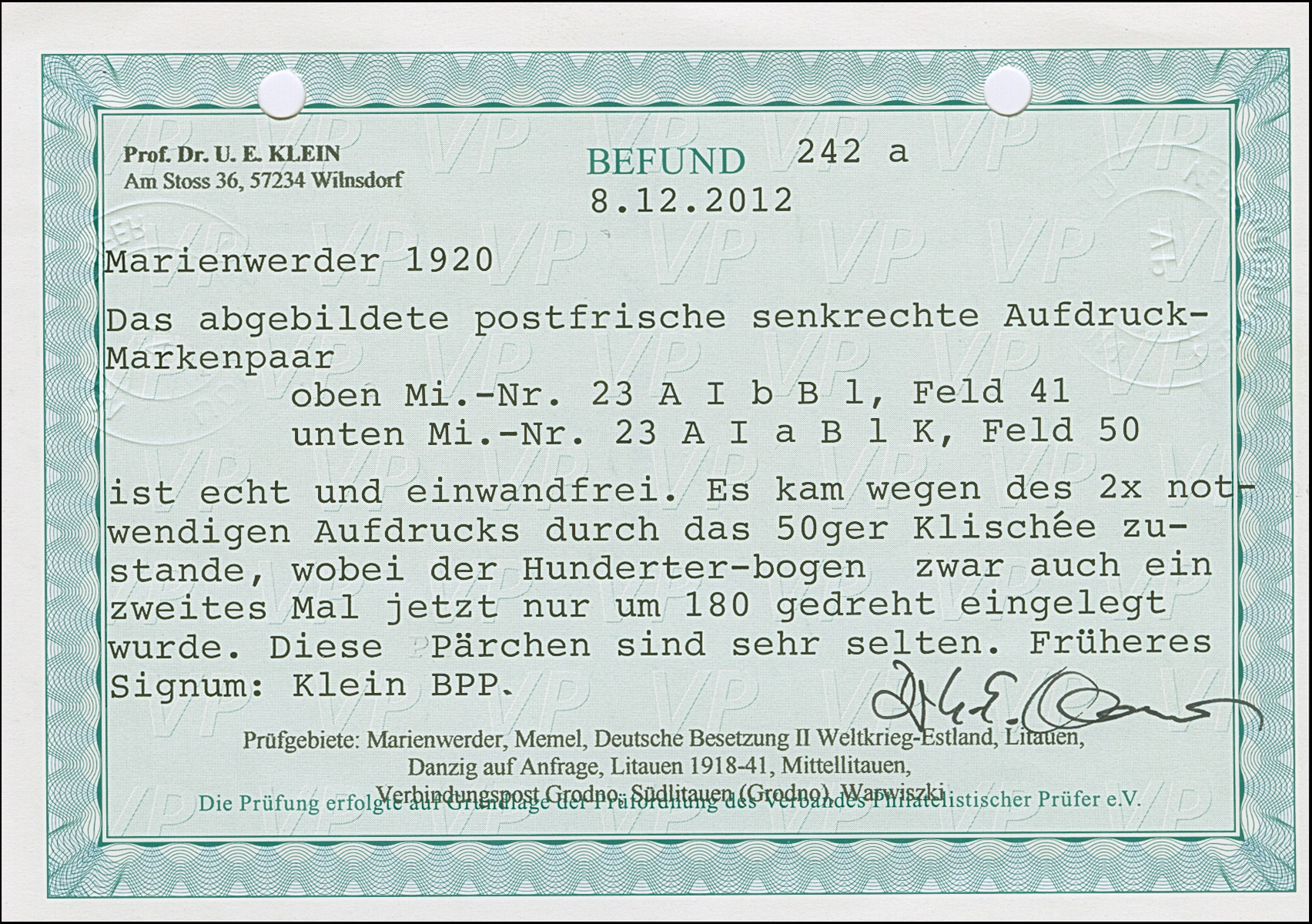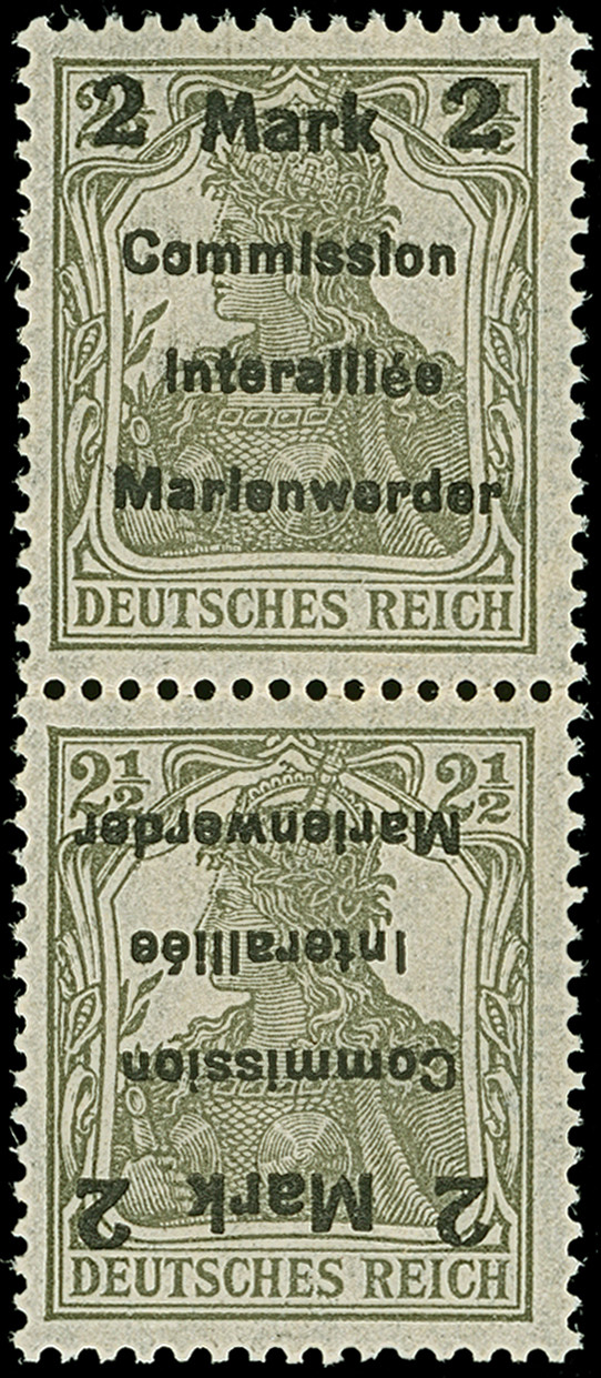 1920, Germania 2 Mark auf 2½ Pfennig, senkrechtes Kehrdruckpaar mit den Aufdrucktypen AIbBI sowie kopfstehend AIaBI, Druckfelder 41 bzw. 50, postfrisch, leichte Fingerspuren, sonst tadellos. Wenngleich ProFi etliche kopfstehende Aufdrucke registriert hat, hat ProFi kein weiteres Kehrdruckpaar dieser Marke registriert, eine der großen Seltenheiten, sign. Klein BPP mit Befund (2012)