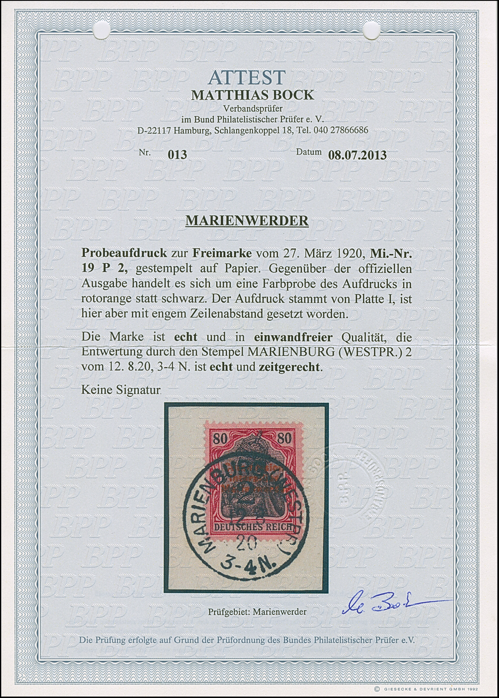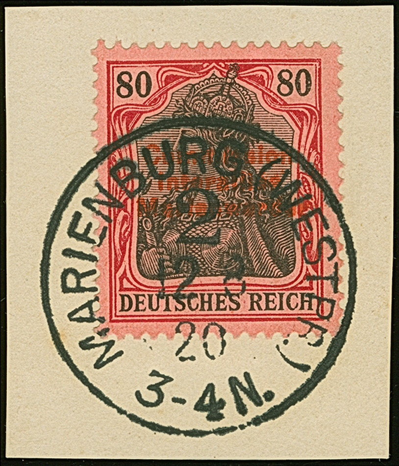 1920, Germania 80 Pfennig mit rotem Probeaufdruck im engen Zeilenabstand, farbfrisch und gut gezähnt, sauber mit EKr. “MARIENBURG 12 8 20” auf Briefstück, tadellos, sehr selten, Fotoattest Bock BPP (2013)