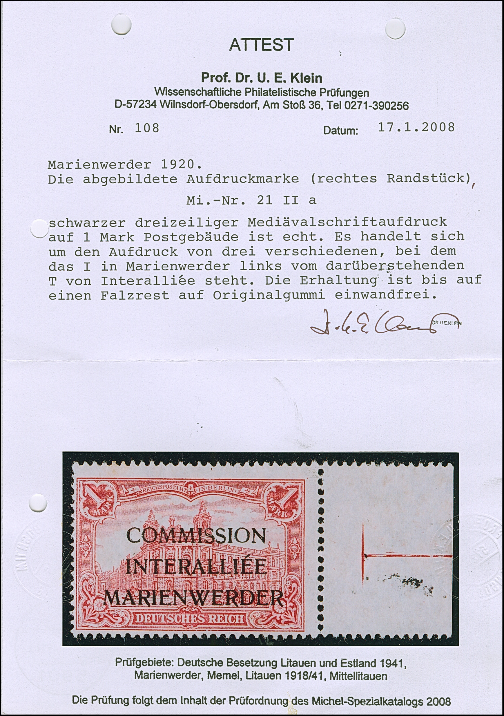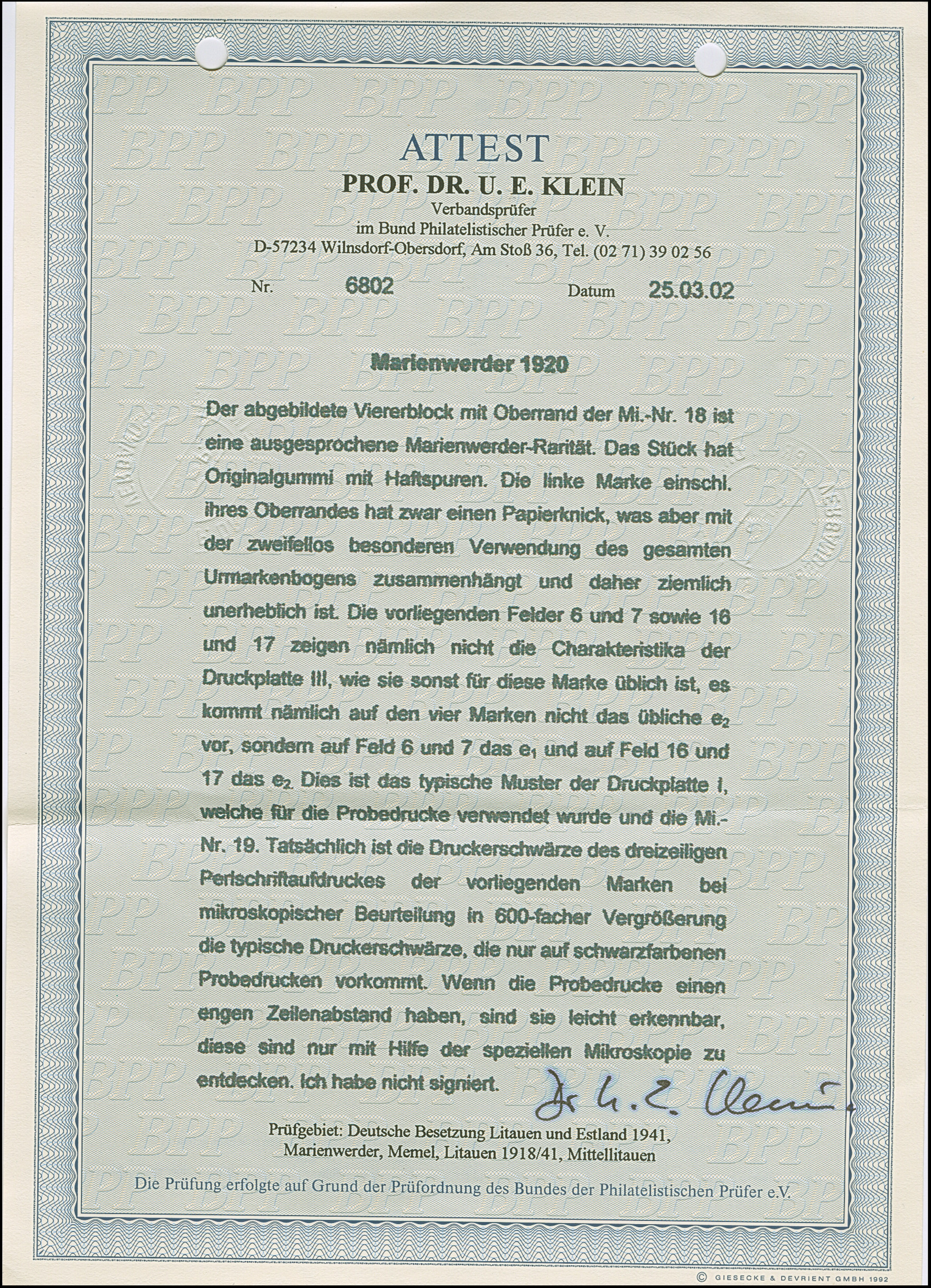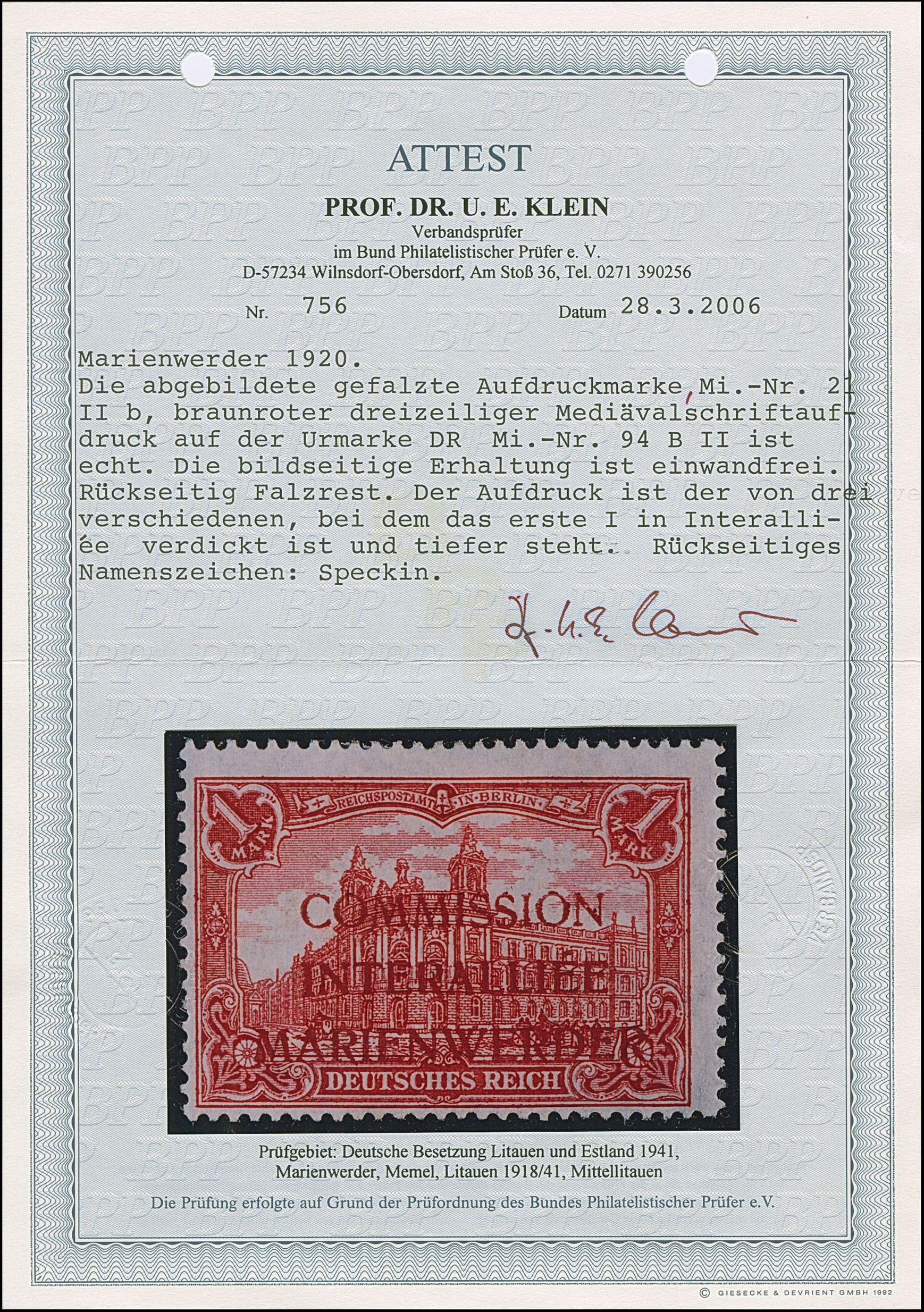 Notiz: Erich Hüttenhain war als Postdirektor in Marienwerder und damit auch der verantwortliche Beamte für die Herstellung der Aufdruckmarken beschrieben u.a. bei Dr. Klein "Marienwerderaufdrucke, echt oder falsch", 1991