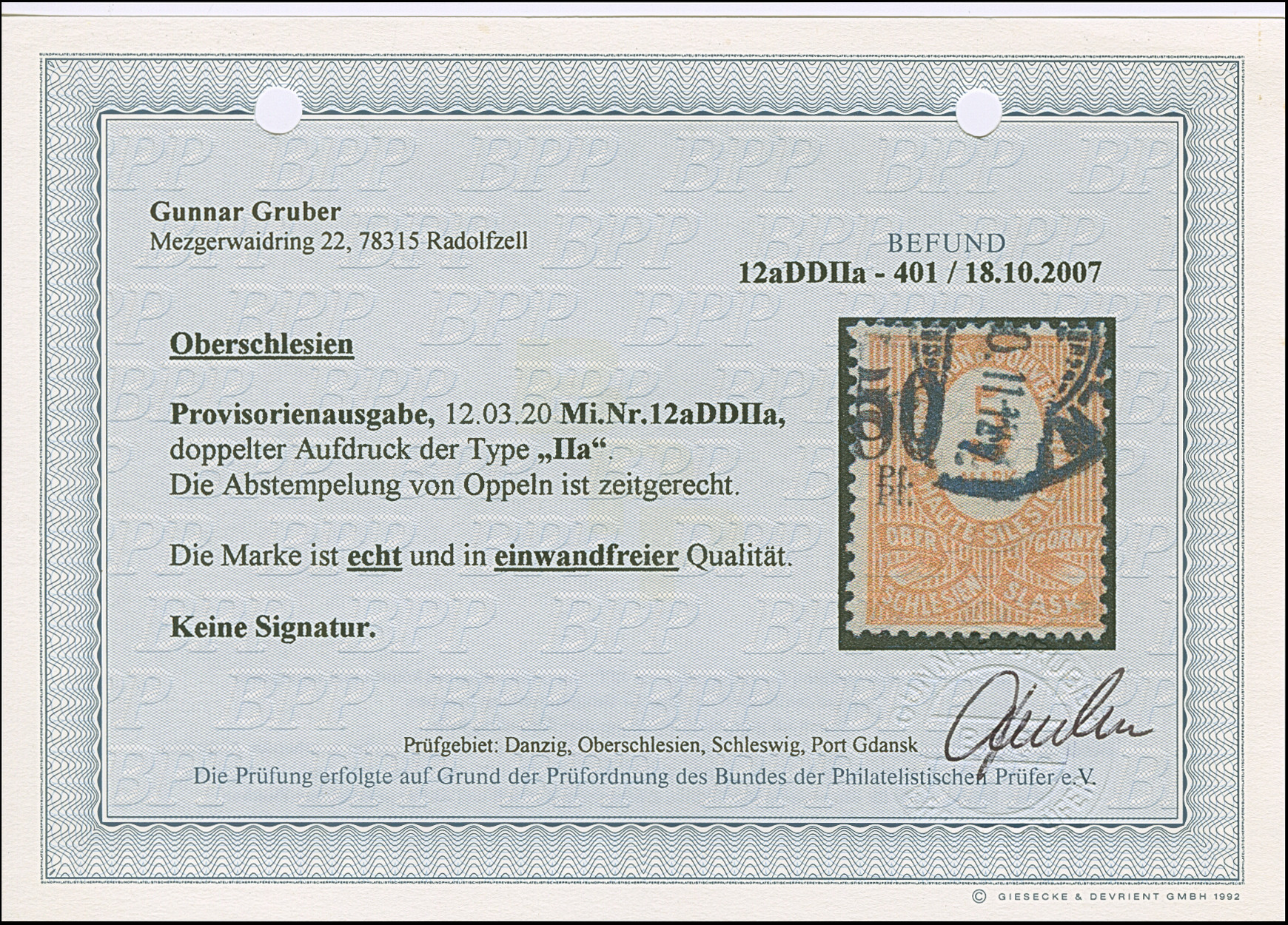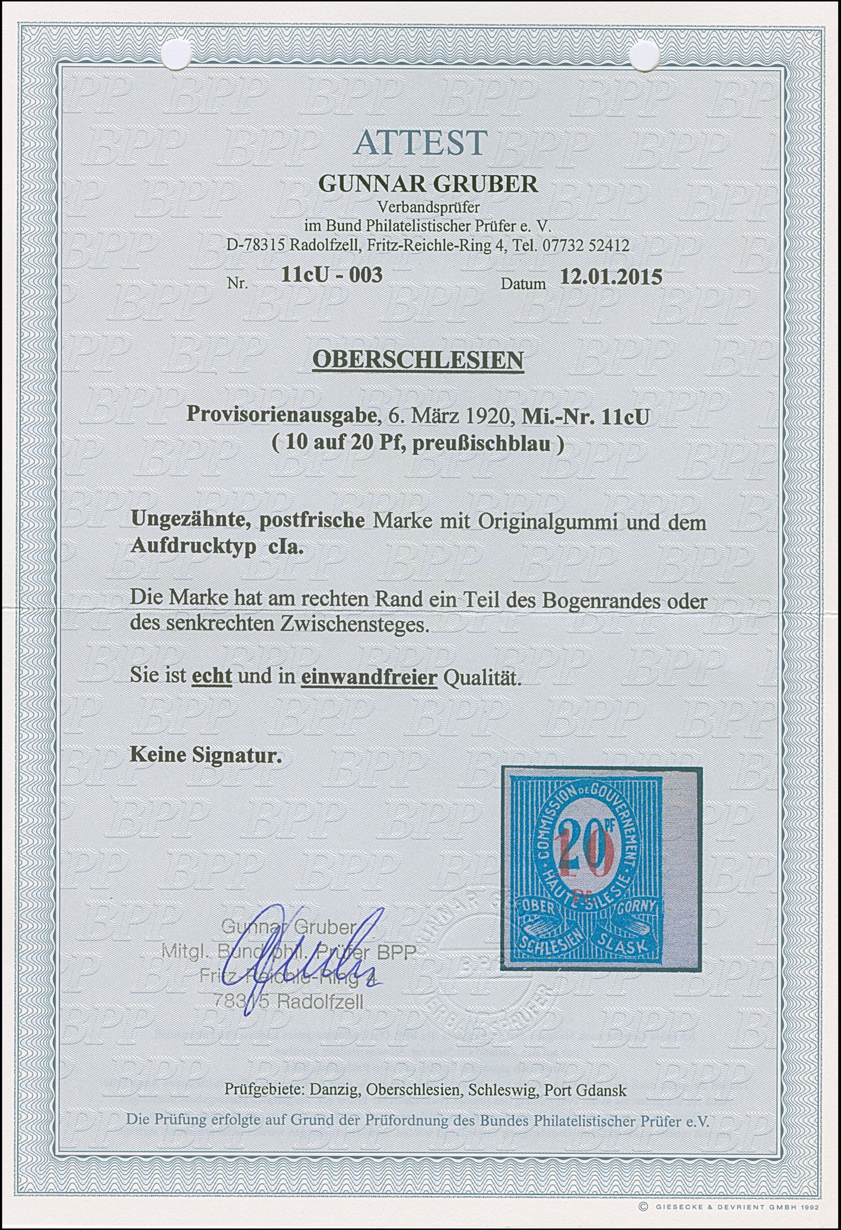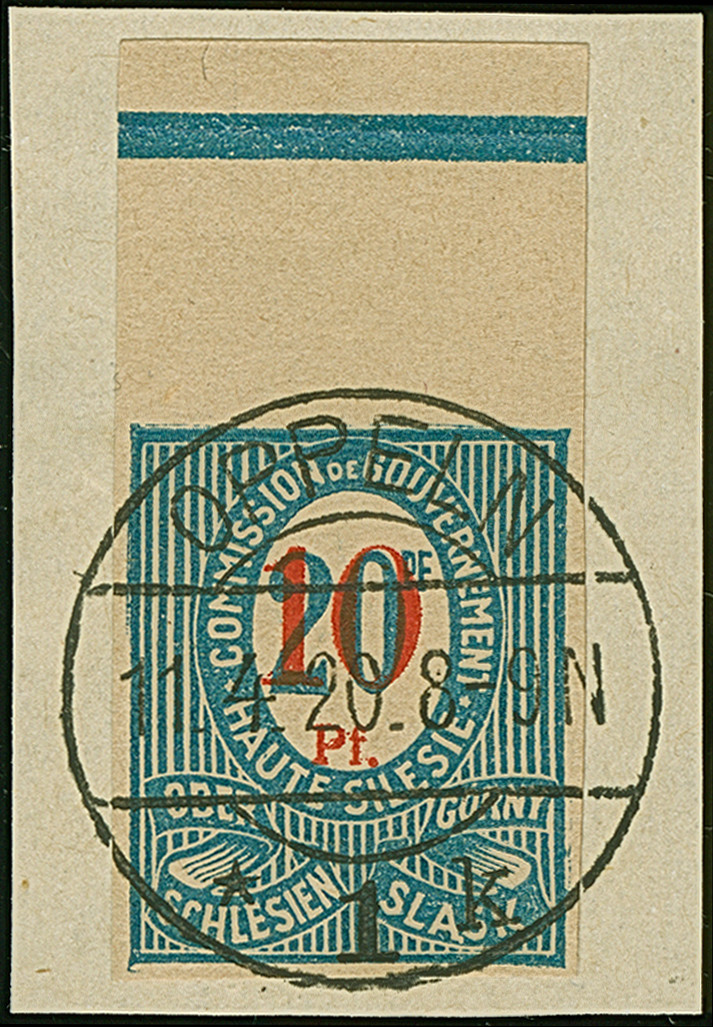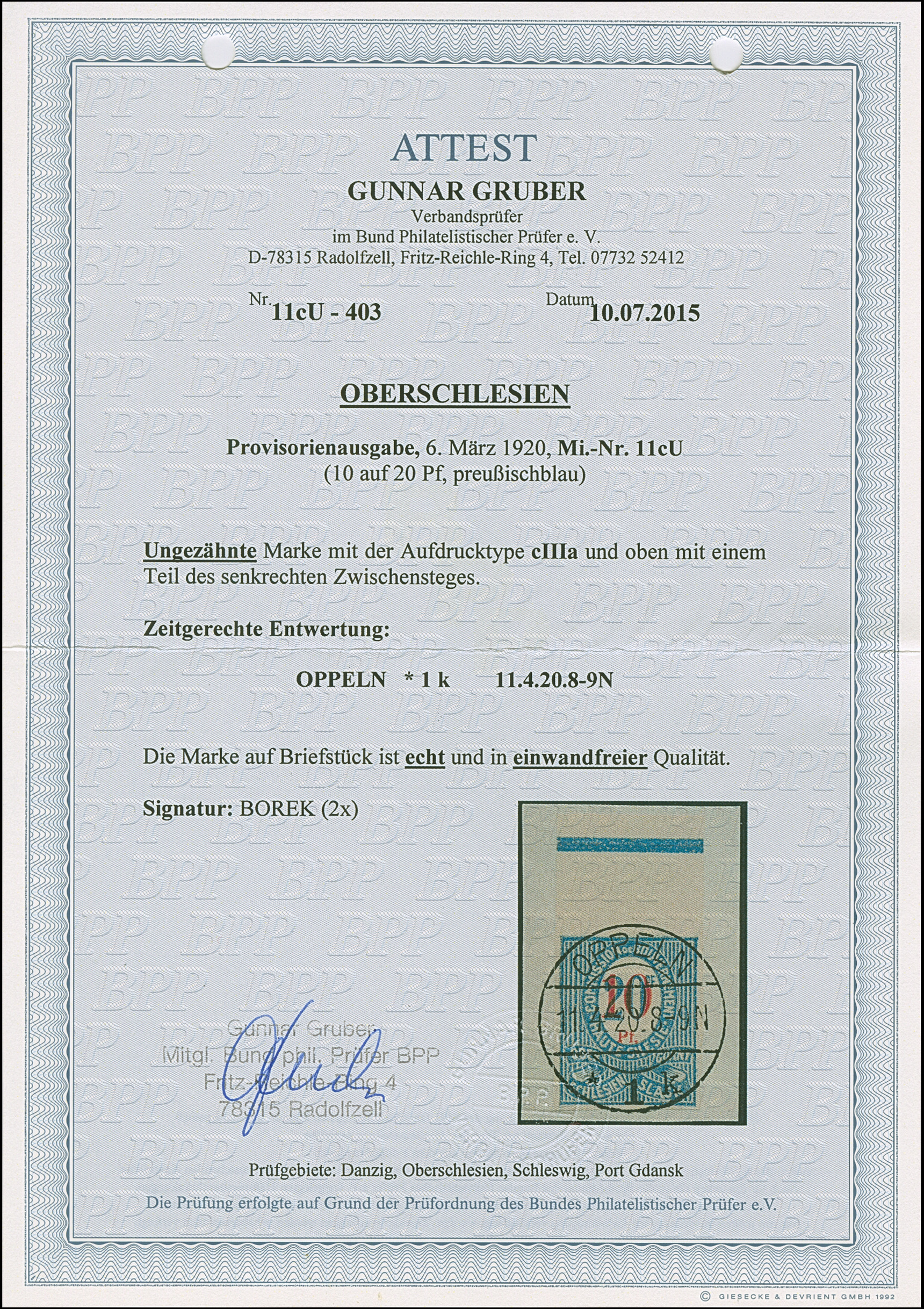1920, Aufdruck-Provisorien 10 Pf. auf 20 Pfennig preußischblau, Aufdrucktype IIIa, ungezähntes Oberrandstück mit Zwischenstegansatz, sauber mit zentrischem Stempel “OPPELN 11.4.20" auf Briefstück, tadellos, sign. Borek und Fotoattest Gruber BPP (2015)