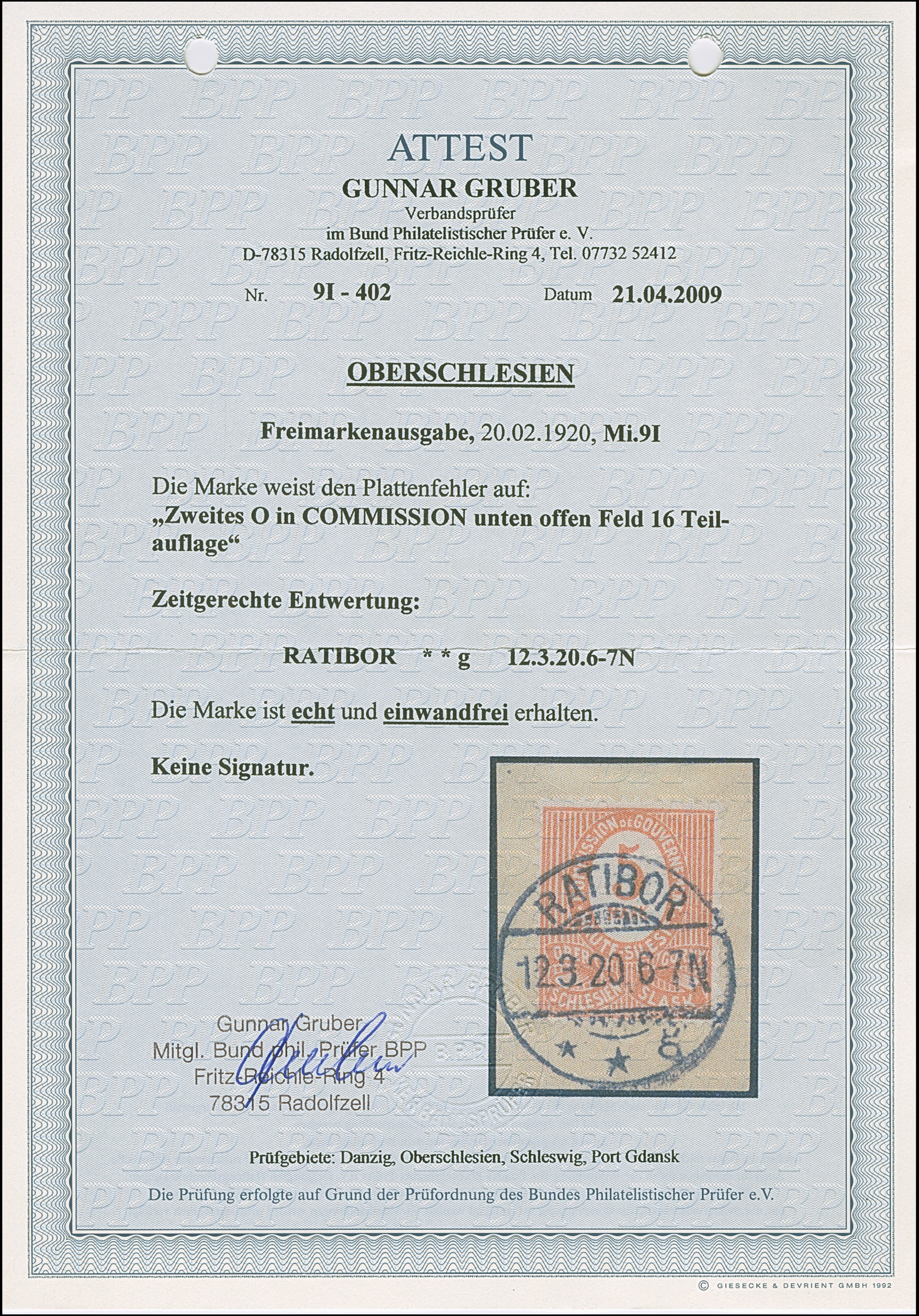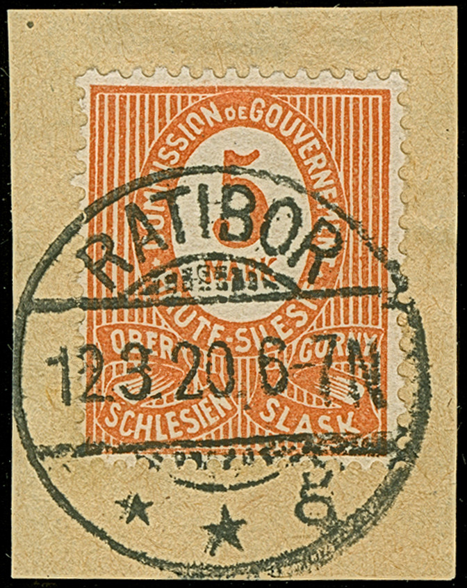 1920, Ziffern 5 Mark dunkelrotorange, mit Plattenfehler “zweites O in COMMISSION unten offen”, sauber mit klarem Stempel “RATIBOR 12.3.20” auf Briefstück, den seltenen und nur in einer kleinen Teilauflage vorkommenden Plattenfehler freilassend, tadellos, Fotoattest Gruber BPP (2009)