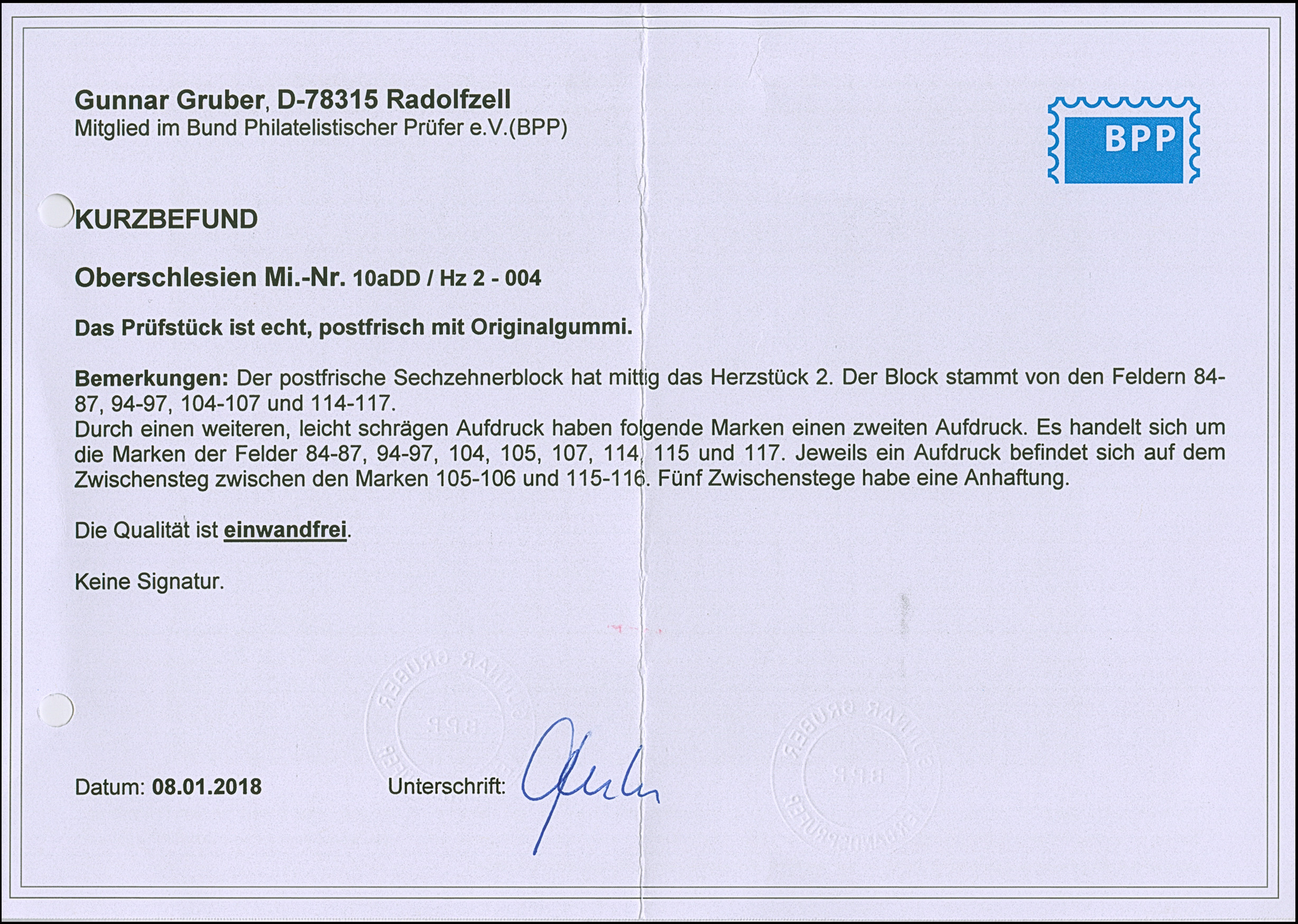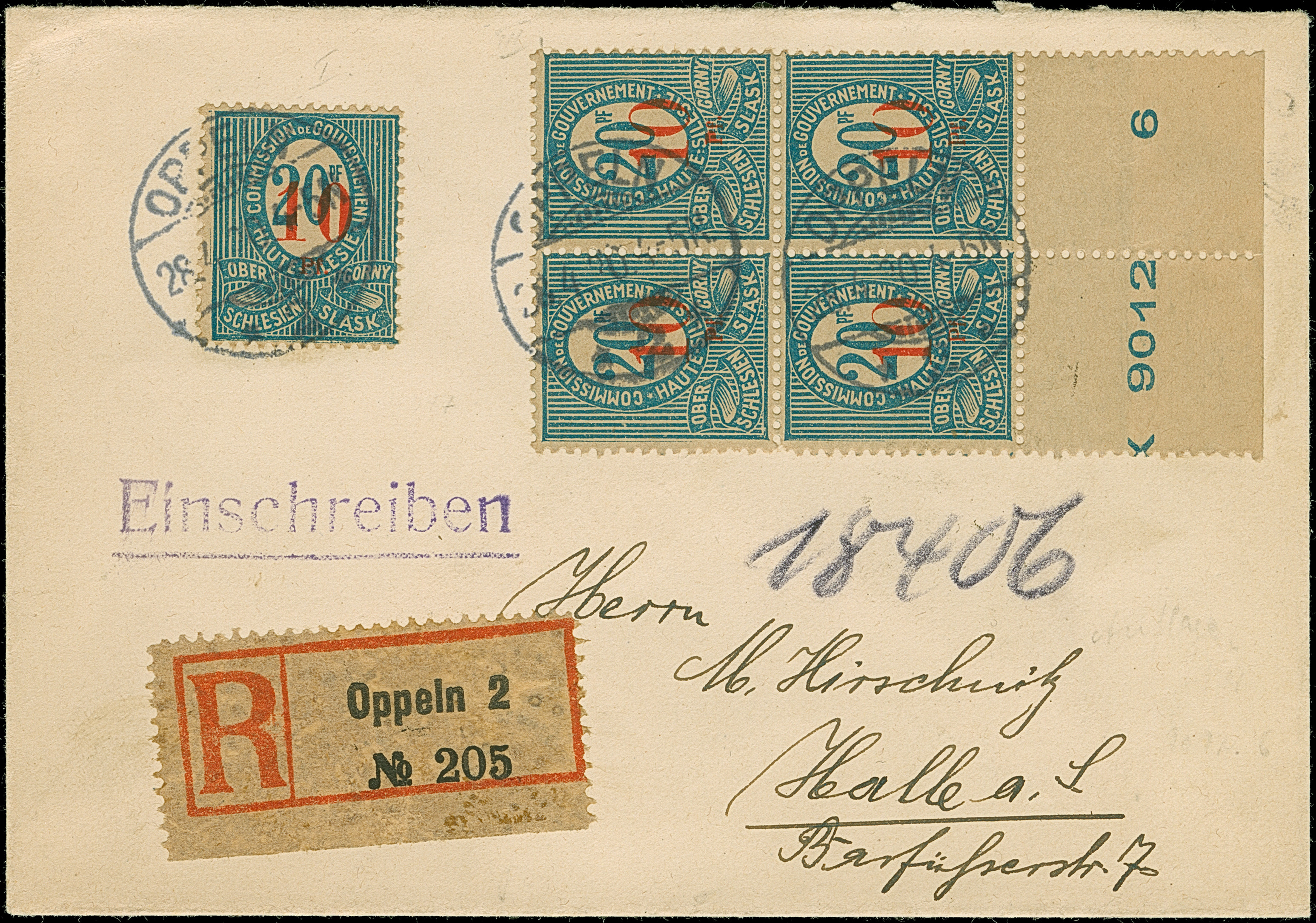 1920, 10 Pfennig auf 20 Pfennig dunkelgraublau, Unterrandviererblock mit Druckdatum “X 9012 6” (X winzig beschnitten) sowie Einzelwert, sauber mit Stempel “OPPELN 28.4.20” auf R-Brief nach Halle mit Ankunftsstempel. Gebrauchte Druckdaten, besonders auf Brief sind nicht häufig, tadellos