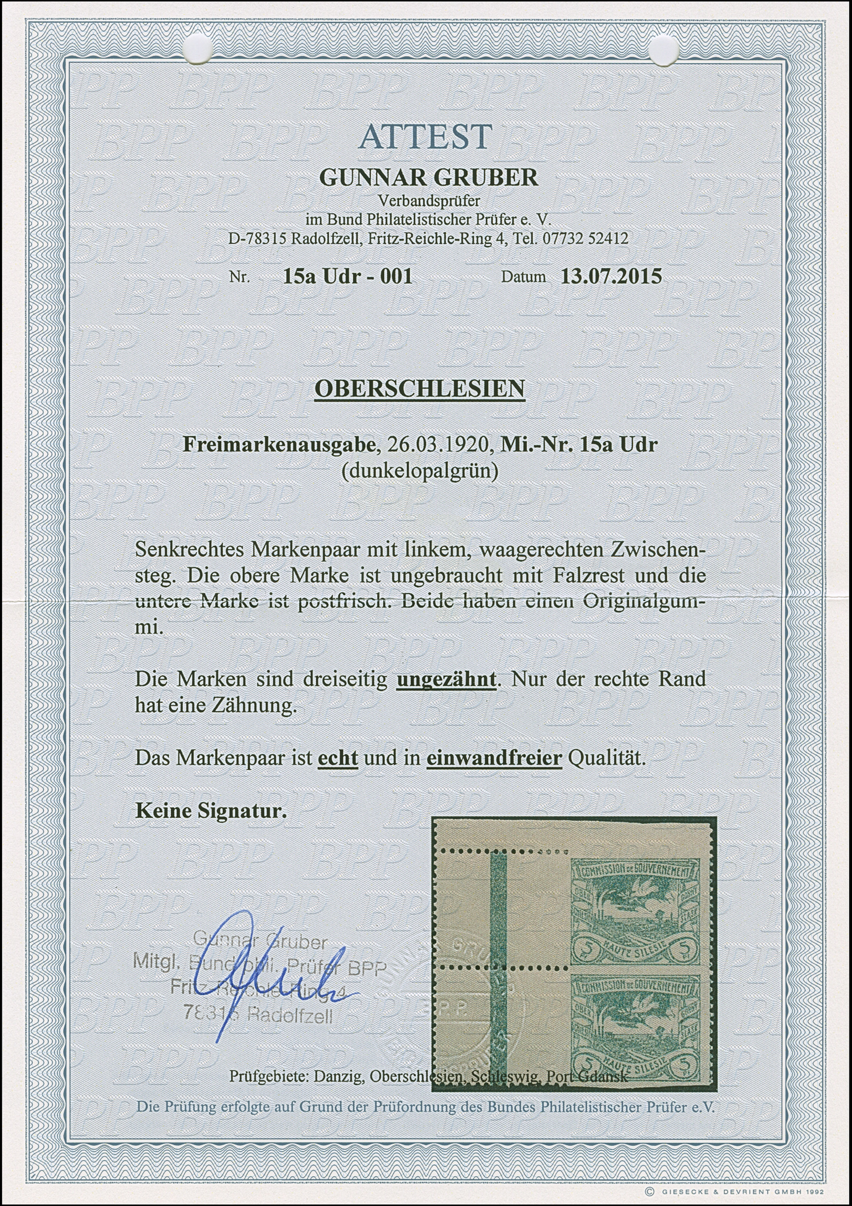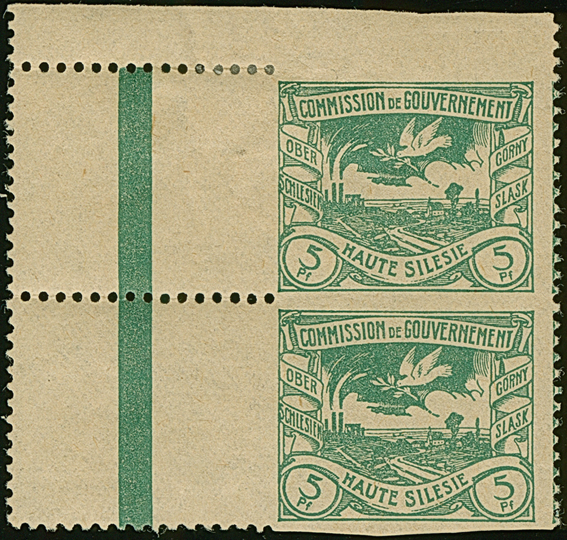 1920, Hüttenwerke 5 Pfennig dunkelopalgrün, dreiseitig ungezähnt im senkrechten Paar mit Zwischenstegen links, die obere Marke ungebraucht, die untere postfrisch, tadellos. Eine große Seltenheit, nur ein weiteres Stück (ein Paar) bekannt, unsigniert mit Fotoattest Gruber BPP (2015)