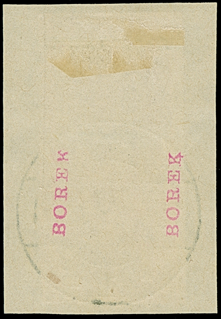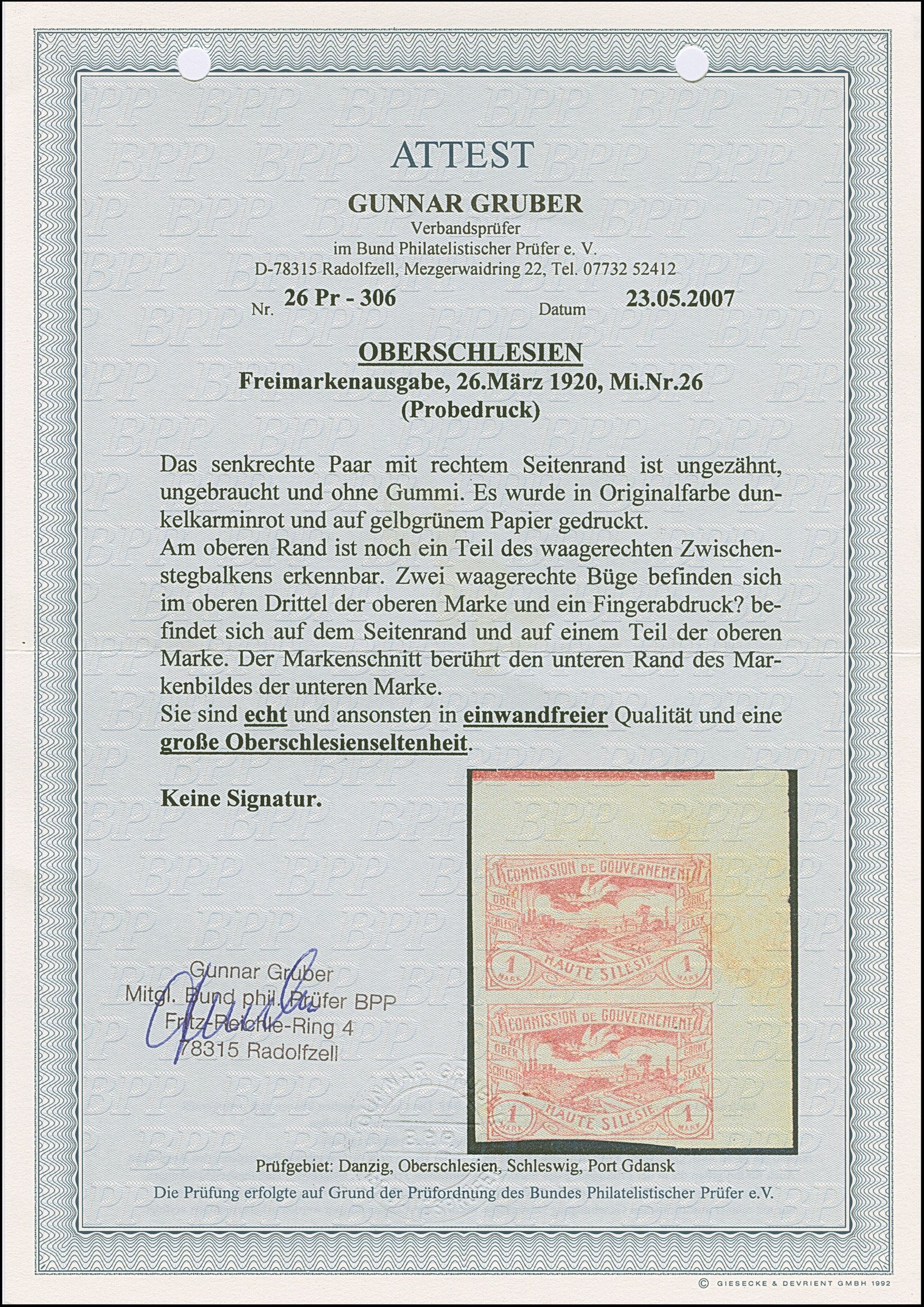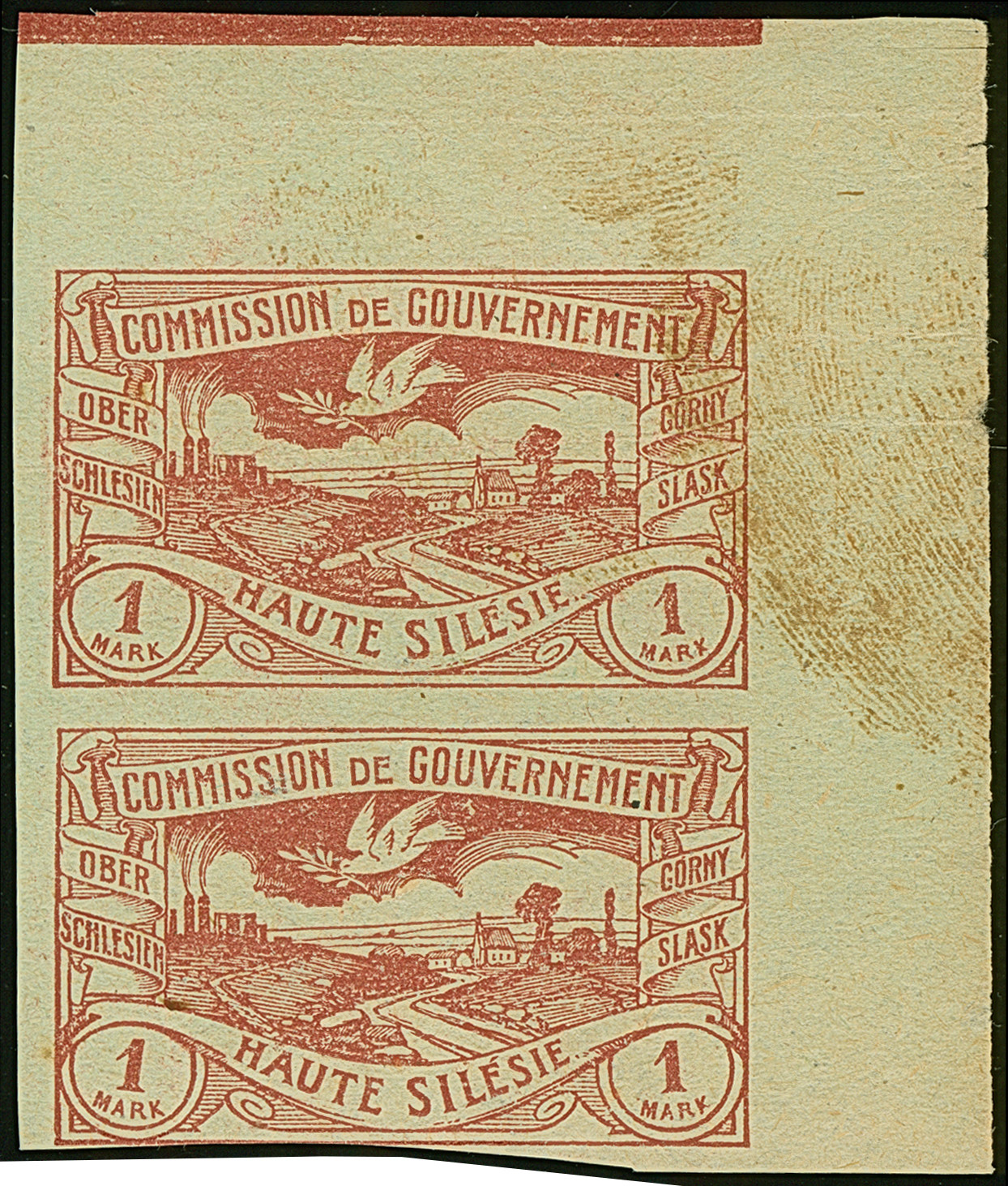 1920, Hüttenwerke 1 Mark dunkelkarminrot, ungezähnter Probedruck auf gelbgrünem, ungummierten Papier, senkrechtes Paar aus der rechten oberen Bogenecke, die untere Marke im Schnitt etwas berührt, die obere Marke zwei unmerkliche Büge, sonst tadellos. Ein sehr seltener Probedruck, ProFi hat lediglich 6 Stück registriert, dies ist die größte bekannte Einheit, unsigniert mit Fotoattest Gruber BPP (2007)