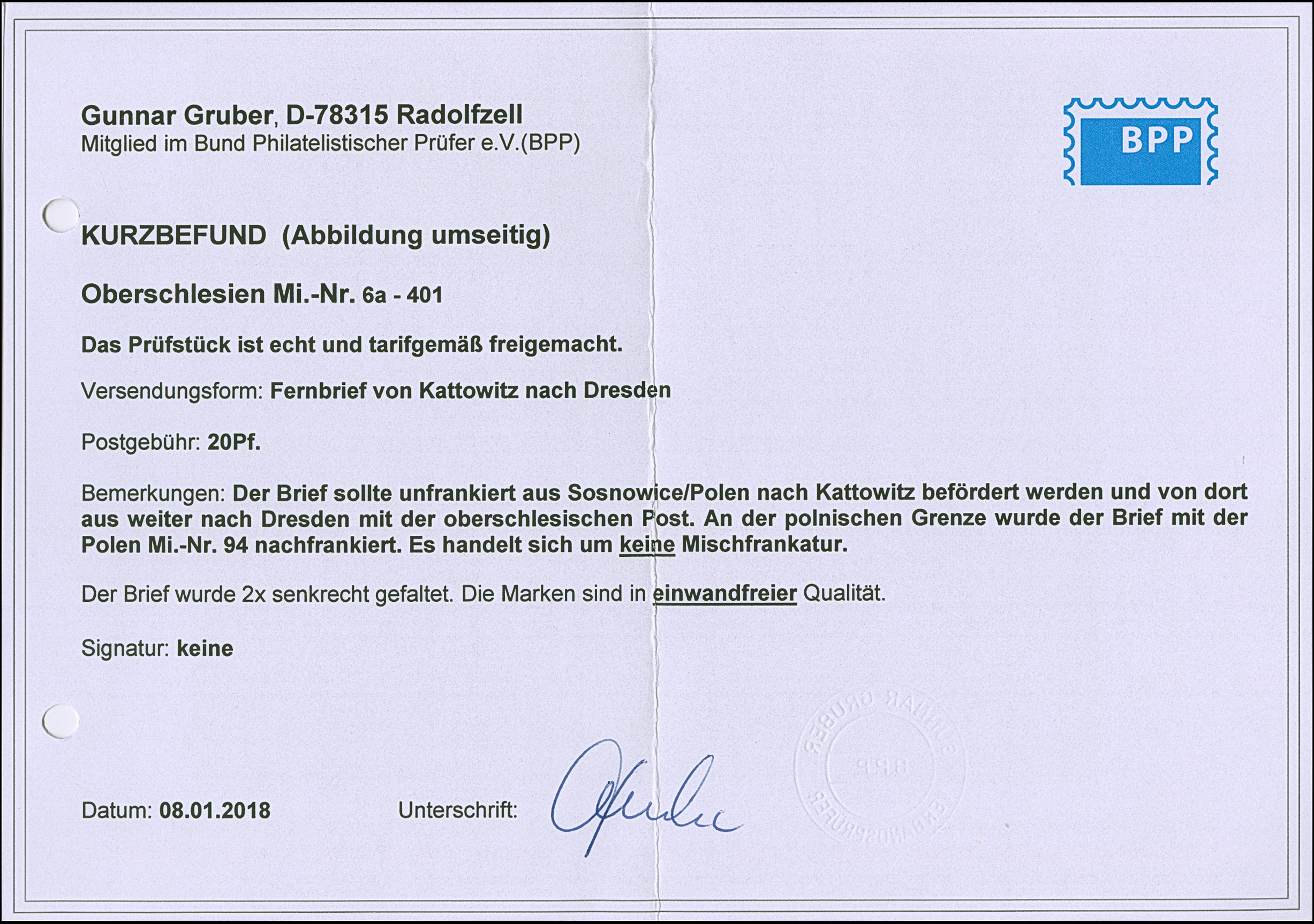1920, Ziffern 20 Pfennig blau mit Stempel “KATTOWITZ 27.3.20” auf Firmenbrief aus Sosnowice nach Dresden, offen aufgeliefert, polnische Frankatur 25 Fen mit Entwertung durch Speditionsstempel, mit privater Speditions-Post nach Kattowitz befördert, rückseitig Siegelstempel der “Spedition A. Courant” in Kattowitz, einziger Weg einer Postbeförderung von Sosnowice nach Dresden, selten, nur wenige Briefe bekannt, zweimal senkrecht gefaltet, sonst in guter Erhaltung, Kurzbefund Gruber BPP (2018)