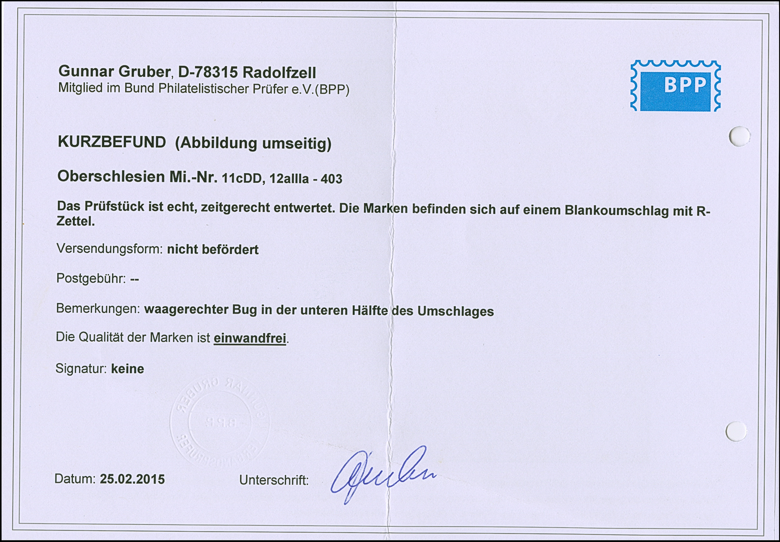 1920, 10 Pfennig auf 20 Pfennig preußischblau mit Doppelaufdruck, zusammen mit 50 Pfennig auf 5 Mark orange, Aufdrucktype IIIa, mit Stempel “OPPELN 30.4.20” (bei der 50 Pfennig der Stempel winzig nachgezogen) auf blanko Brief, die Marken tadellos, Kurzbefund Gruber BPP (2015)