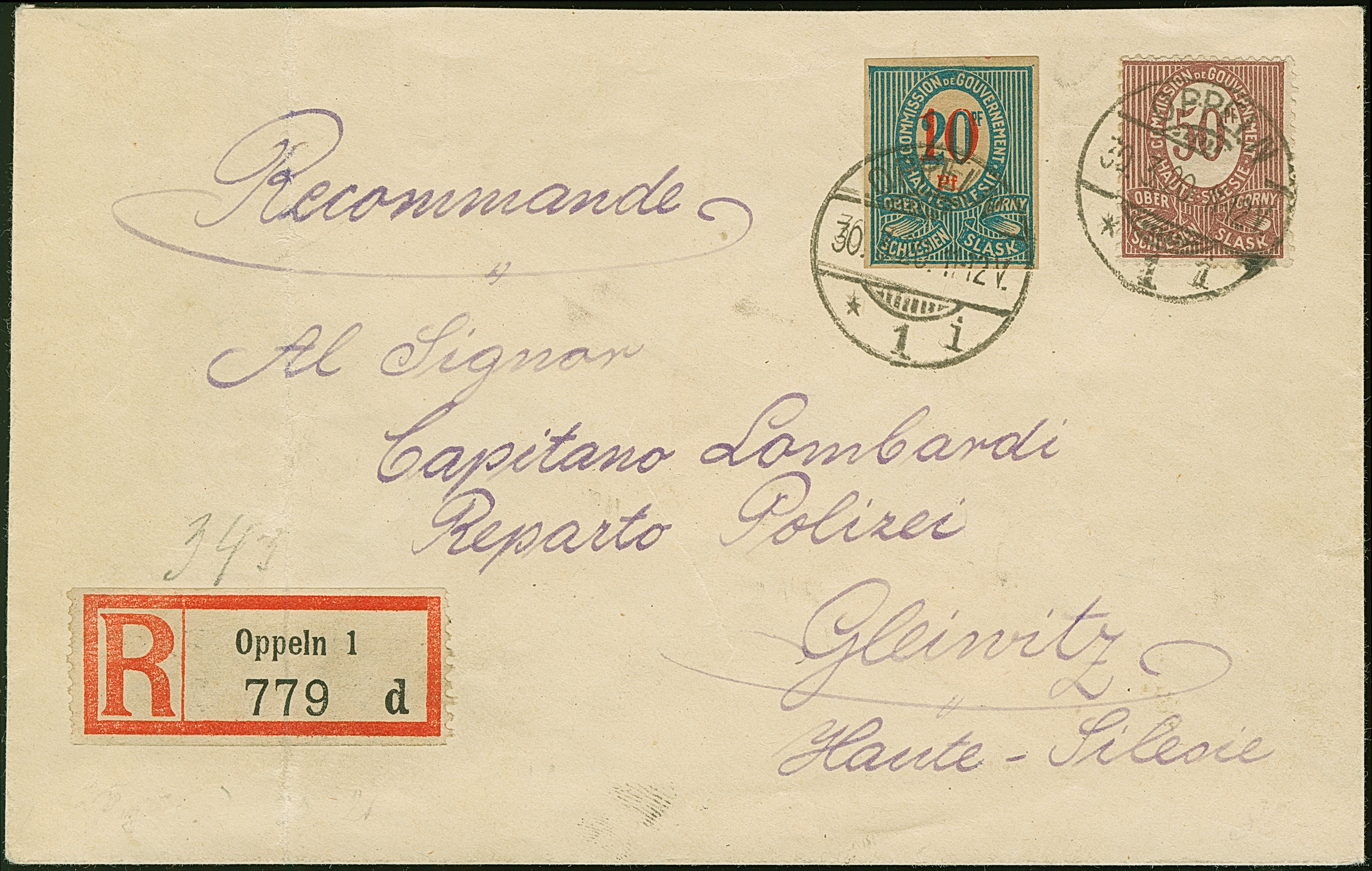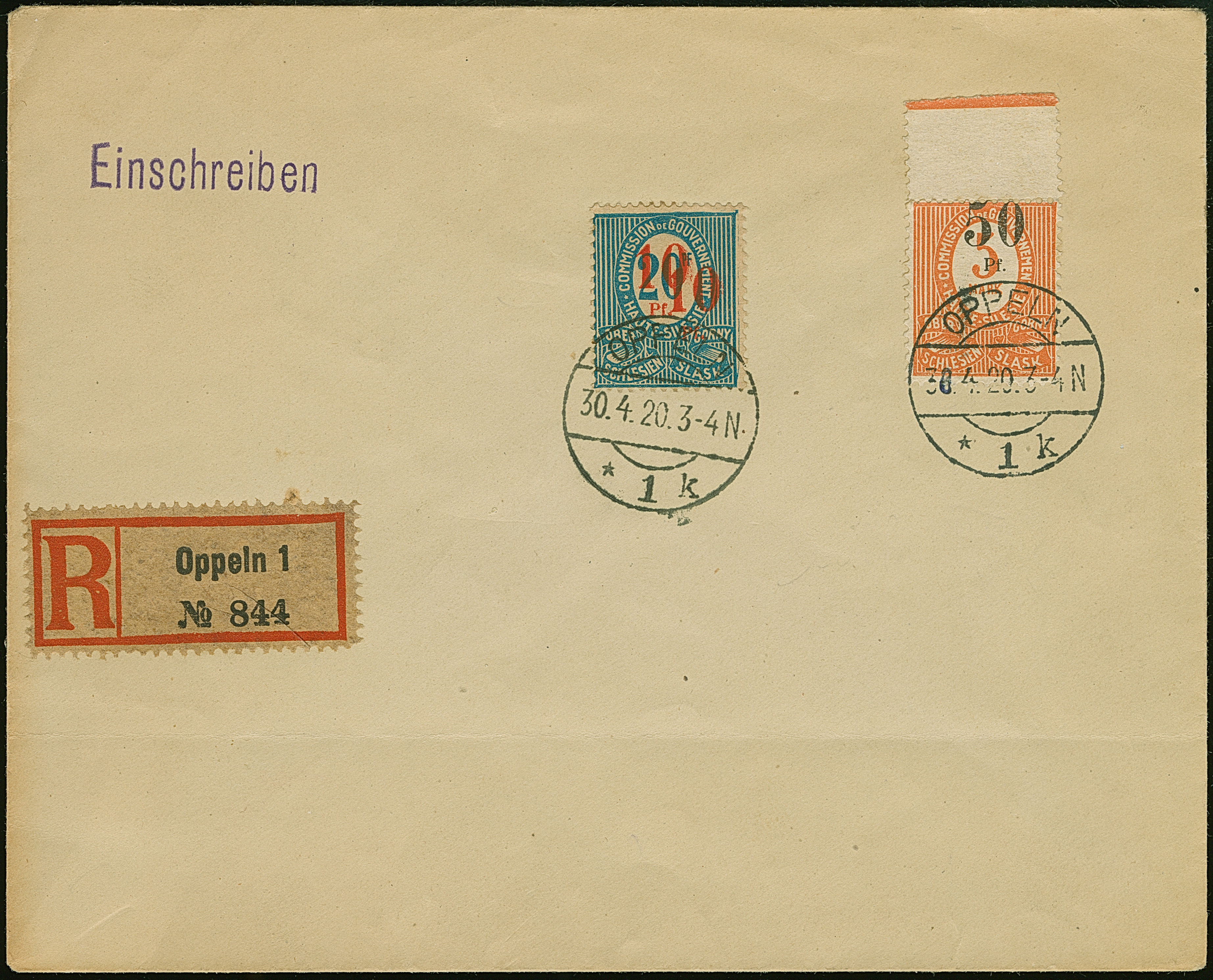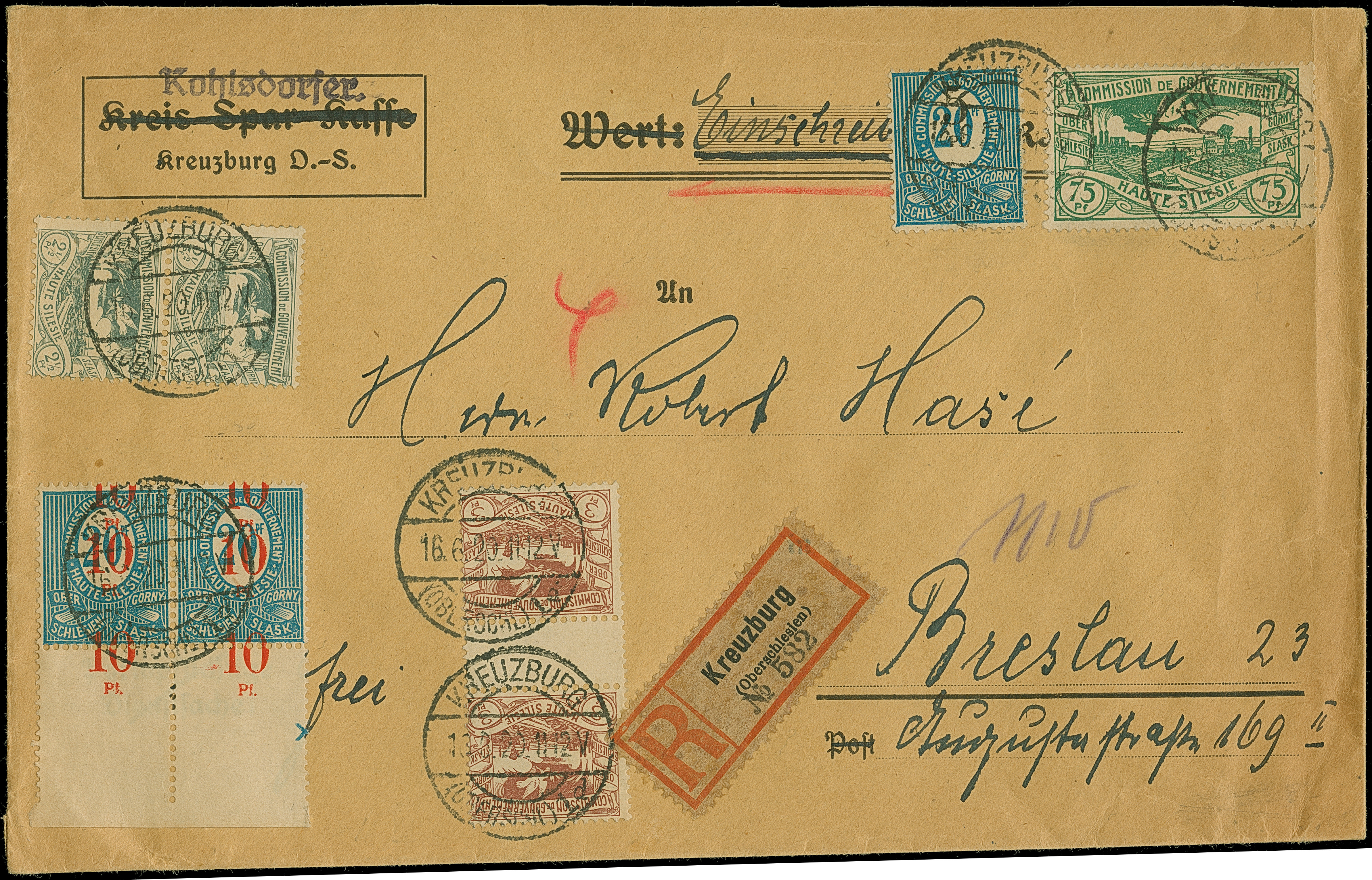 1920, 10 Pfennig auf 20 Pfennig dunkelgraublau, ungezähnt, zusammen mit Zufrankatur mit Stempel “OPPELN 30.3.20” auf R-Brief nach Gleiwitz mit Ankunftsstempel, der Brief einmal senkrecht gefaltet, sonst in guter Erhaltung, sehr selten, sign. Mikulski