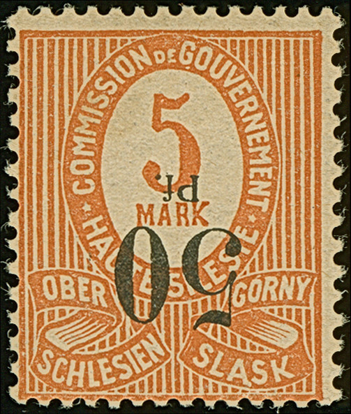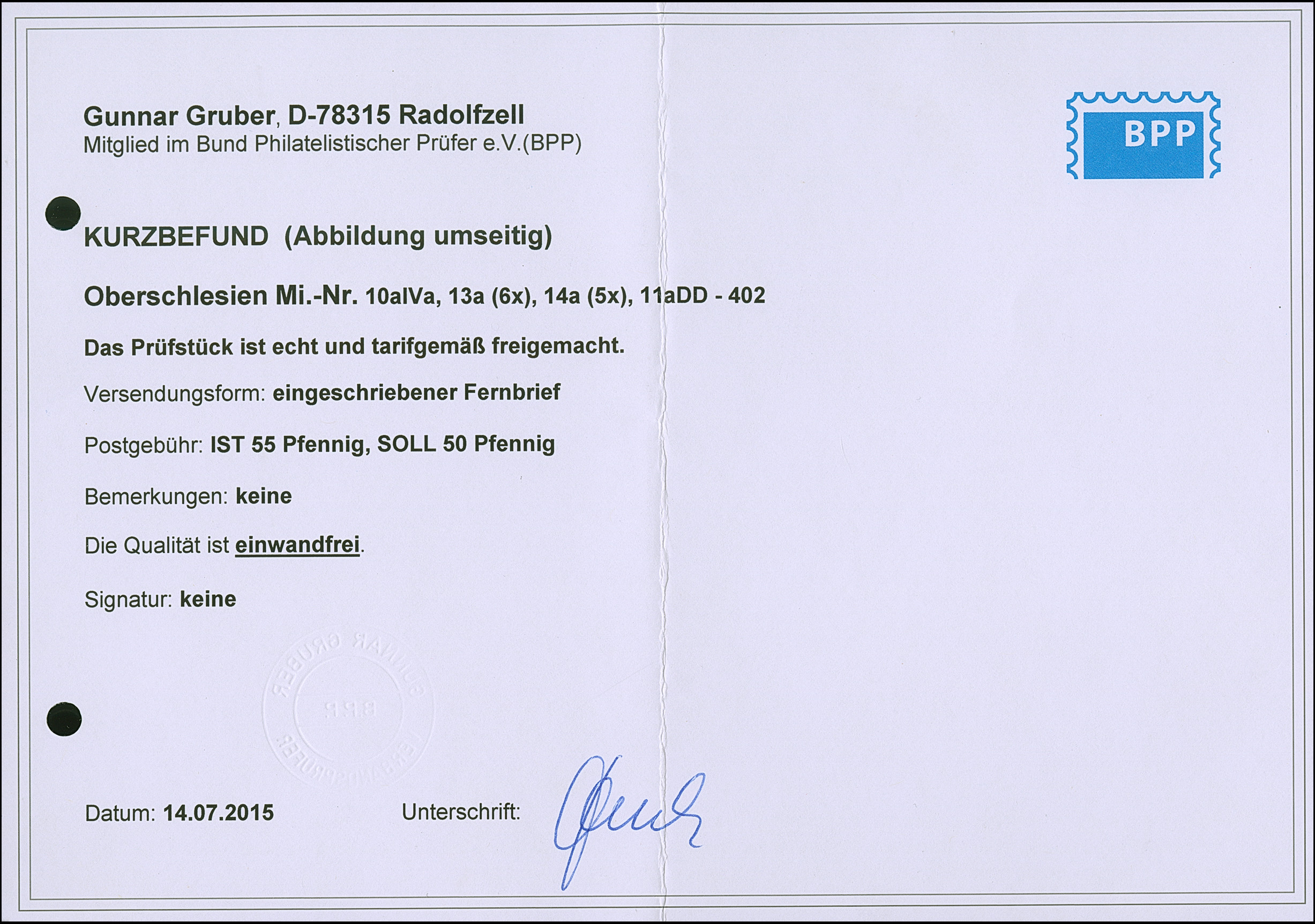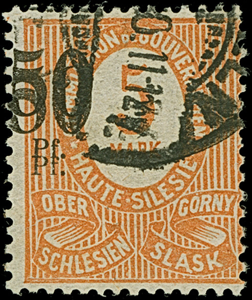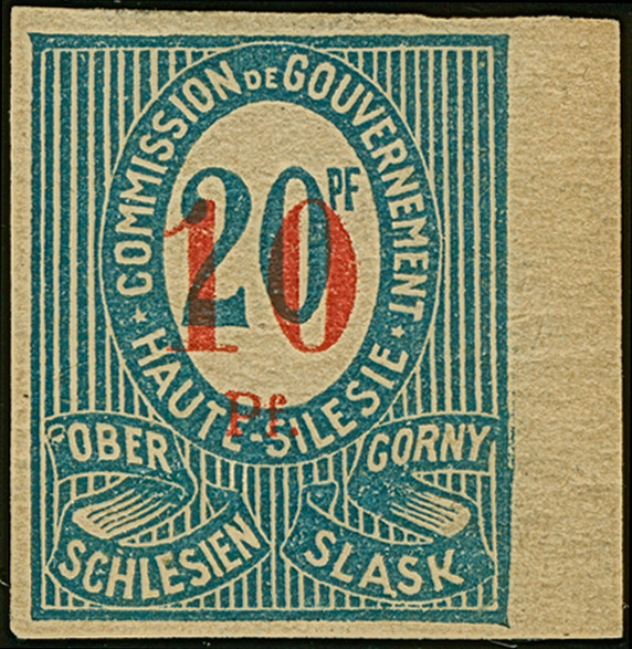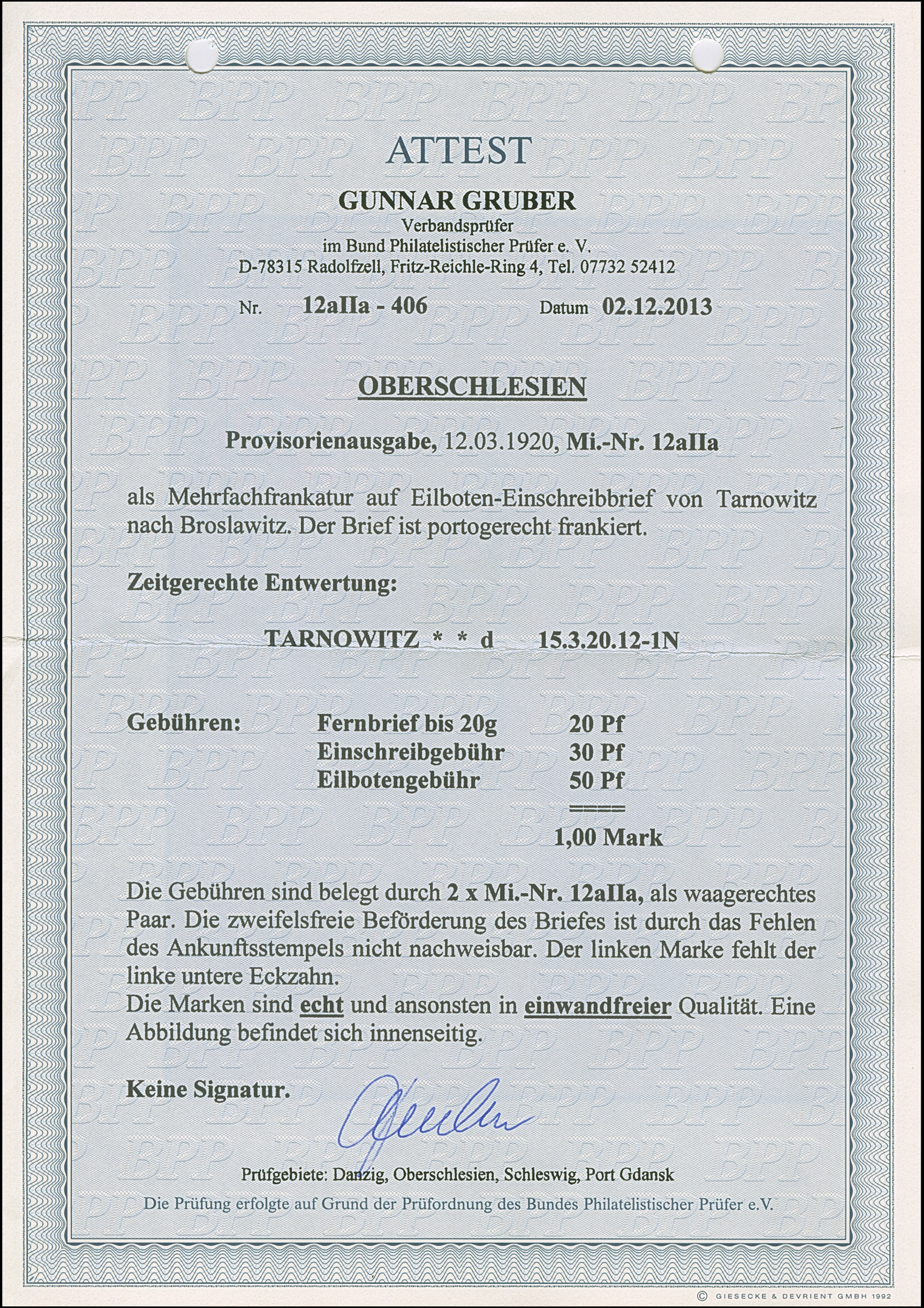 1920, 10 Pfennig auf 20 Pfennig dunkelgraublau, ungezähnt, zusammen mit Zufrankatur mit Stempel “OPPELN 30.3.20” auf R-Brief nach Gleiwitz mit Ankunftsstempel, der Brief einmal senkrecht gefaltet, sonst in guter Erhaltung, sehr selten, sign. Mikulski