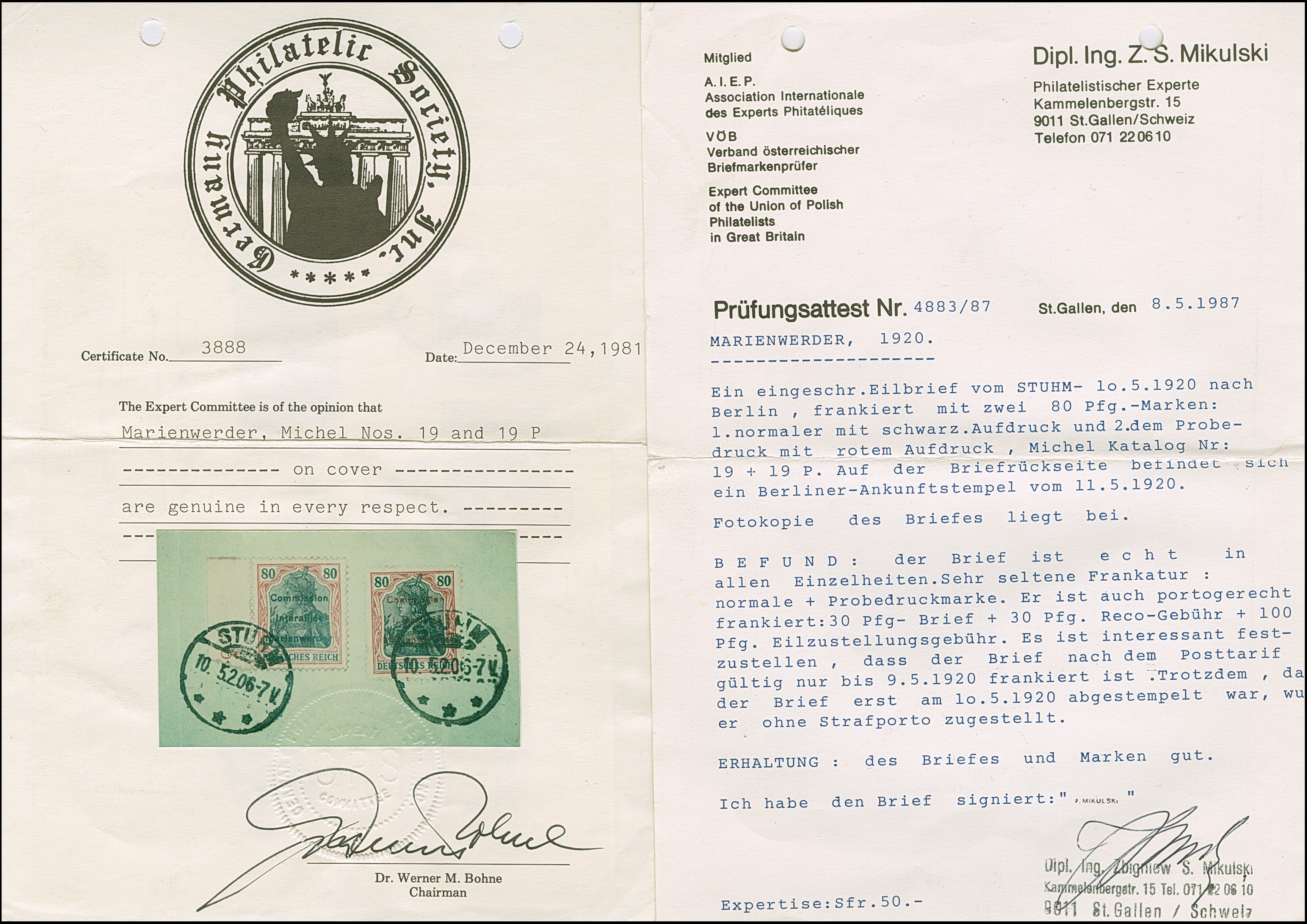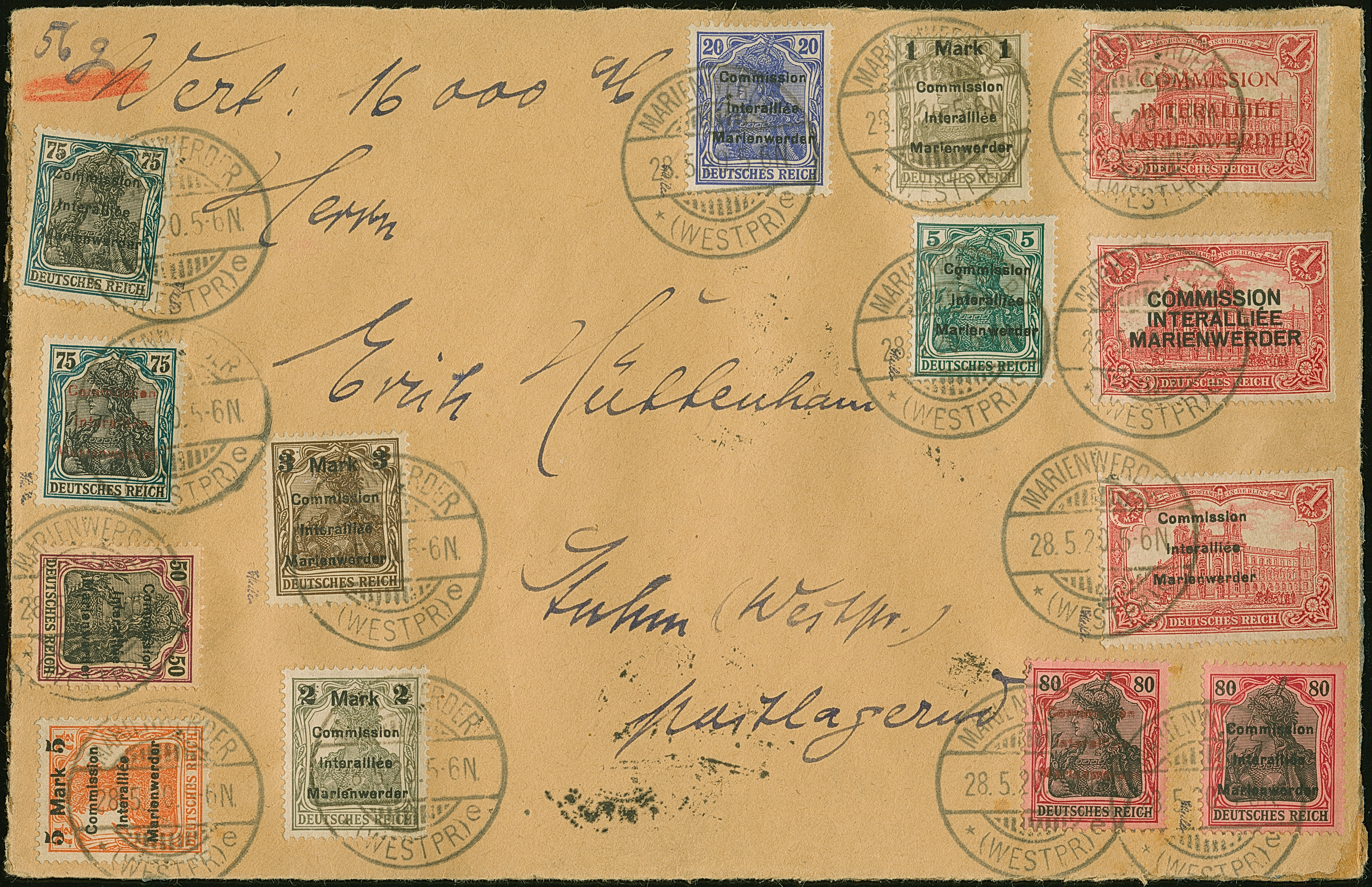 1920, Versuchsaufdrucke: 1 Mark karmin mit Mediävalaufdruck in rot, zusammen mit u.a. Germania 50 Pfennig, rotem Probeaufdruck auf 75 Pfg. sowie zwei falschen Werten mit Stempel "MARIENWERDER 28.5.20" auf Wertbriefvorderseite, montiert auf passende Rückseite, adressiert an Herrn Erich Hüttenhain in Stuhm, der Mediävalaufdruck mit einem fast unsichtbarem Zahnspitzenbug, in einwandfreier Erhaltung. Ein sehr seltenes, hochinteressantes und mehrfach in der Literatur erwähntes Ganzstück, sign. Keiler und ausführliches Fotoattest Bock BPP (2017)