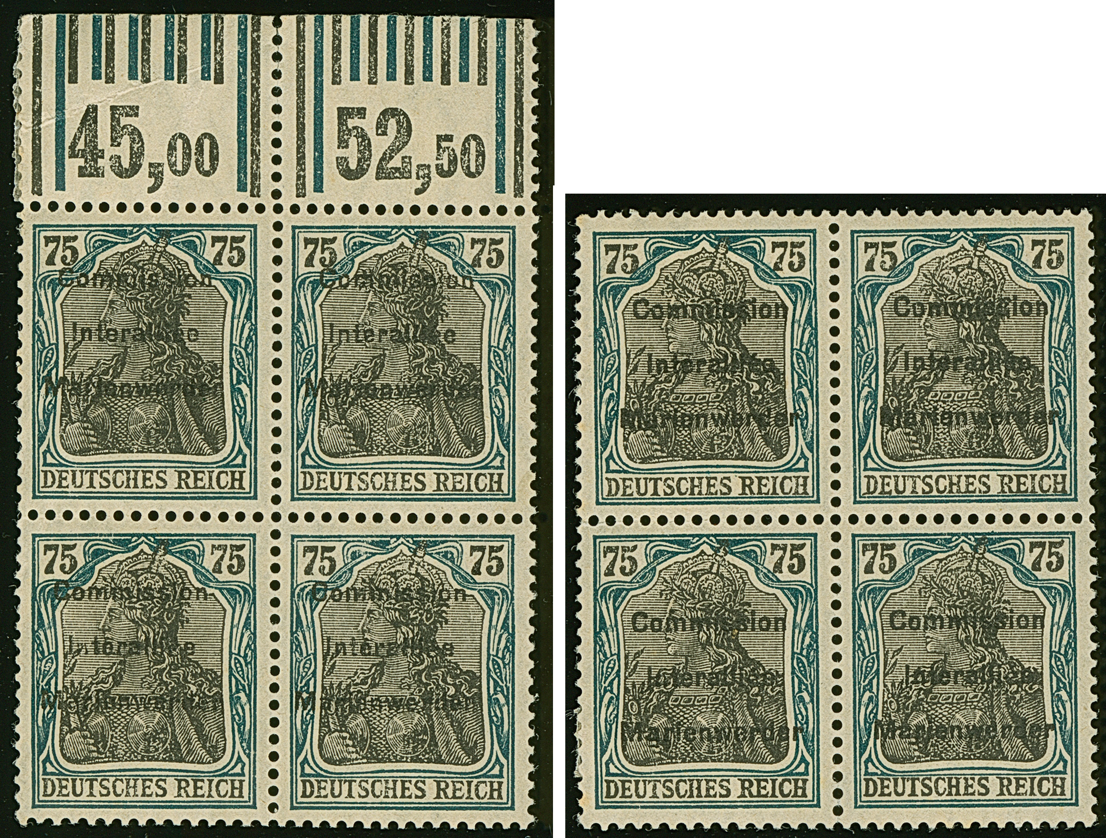 1920, Germania 75 Pfennig mit schwarzem Probeaufdruck von Druckplatte I, jedoch im weiten statt engen Zeilenabstand, Oberrand-Viererblock von den Druckfeldern 6-7 sowie 16-17, farbfrisch und gut gezähnt, ungebraucht, die linke obere Marke sowie der Oberrand mit Bug, die linke untere mit kleinem Eckbug, sonst in tadelloser Erhaltung. Einer der ganz seltenen, aber weitestgehend unbekannten Probedrucke, im Michel nur als “DD” gelistet, keine handvoll weiterer Stücke bekannt, ausführliches Fotoattest Klein BPP (2002)