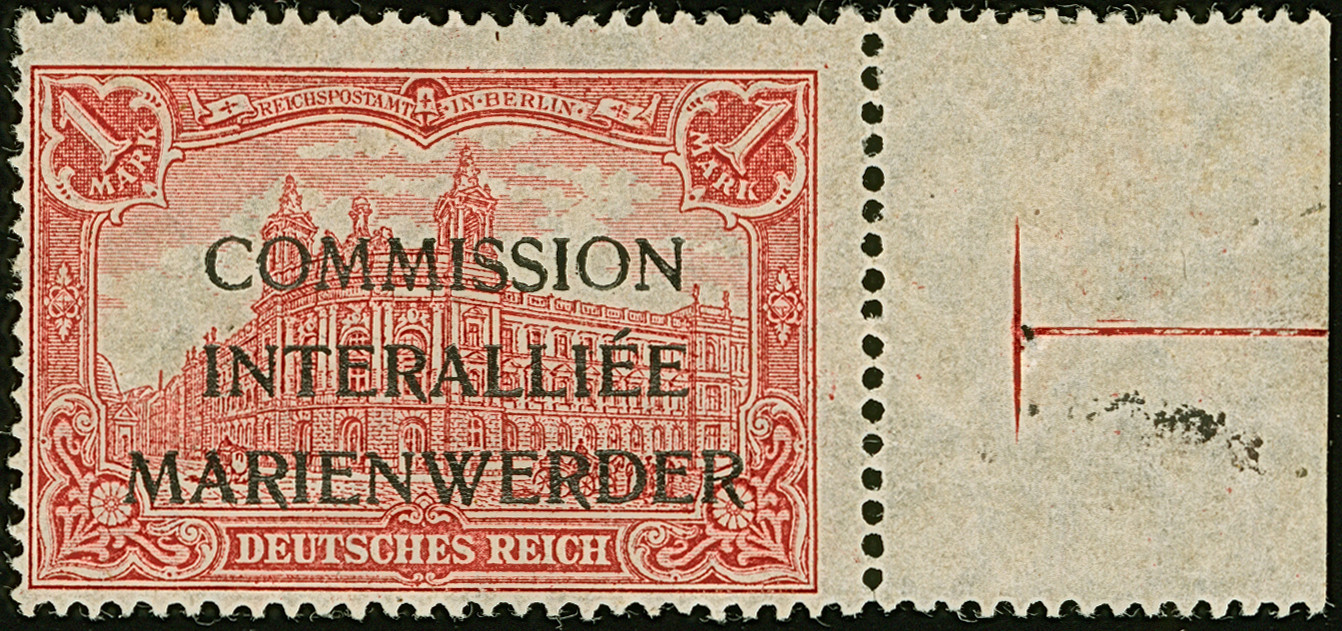 1920, 1 Mark mit Mediävalaufdruck in schwarz, rechtes Seitenrandstück sauber ungebraucht, rückseitig winziger Altersfleck, sonst tadellos, eine sehr seltene Marke, sign. sowie Fotoattest Klein (2008)