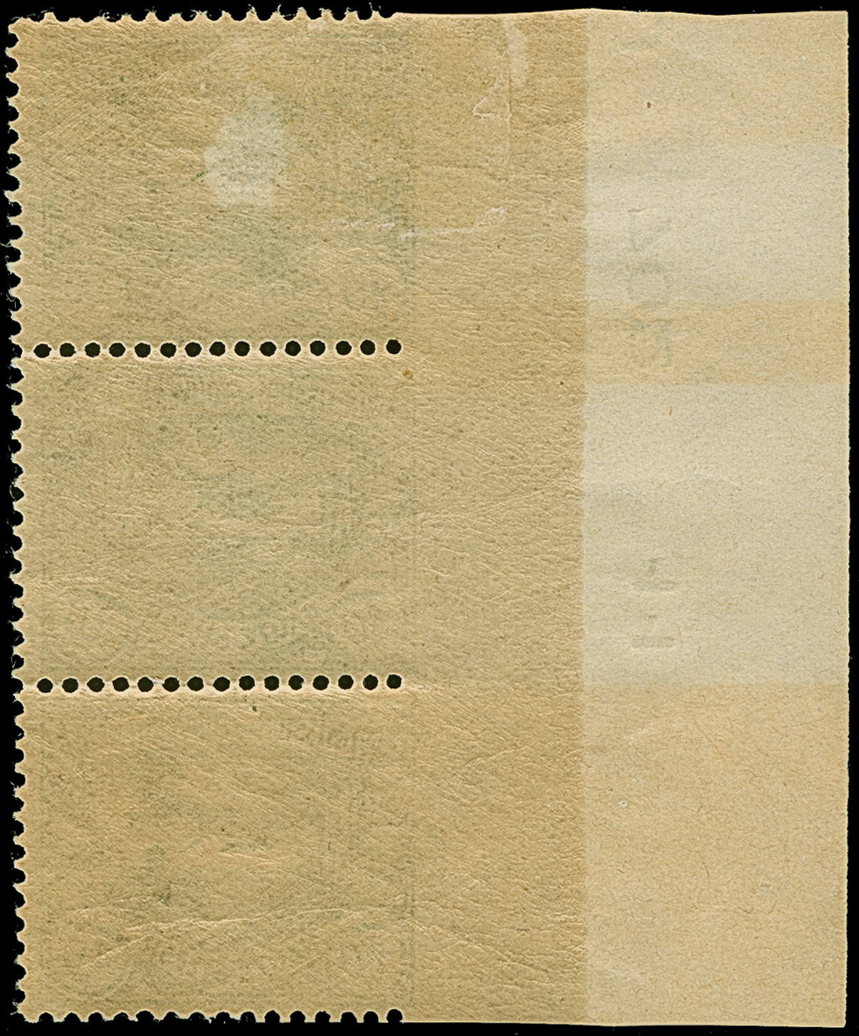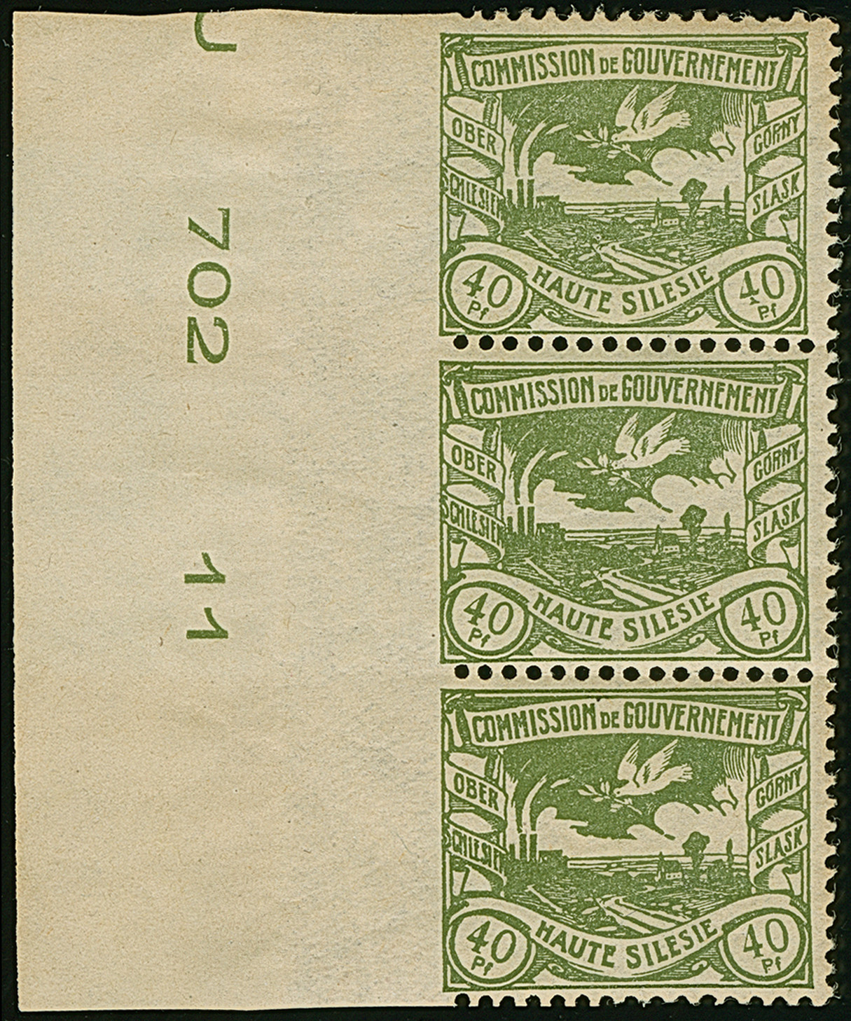 1920, Schlesische Hüttenwerke 40 Pfennig grünoliv, senkrechter Dreierstreifen mit linkem Seitenrand mit Teil-Druckvermerk “ U 702 11”, links ungezähnt, die obere Marke ungebraucht, sonst postfrisch, tadellos. Eine seltene und dekorative Einheit