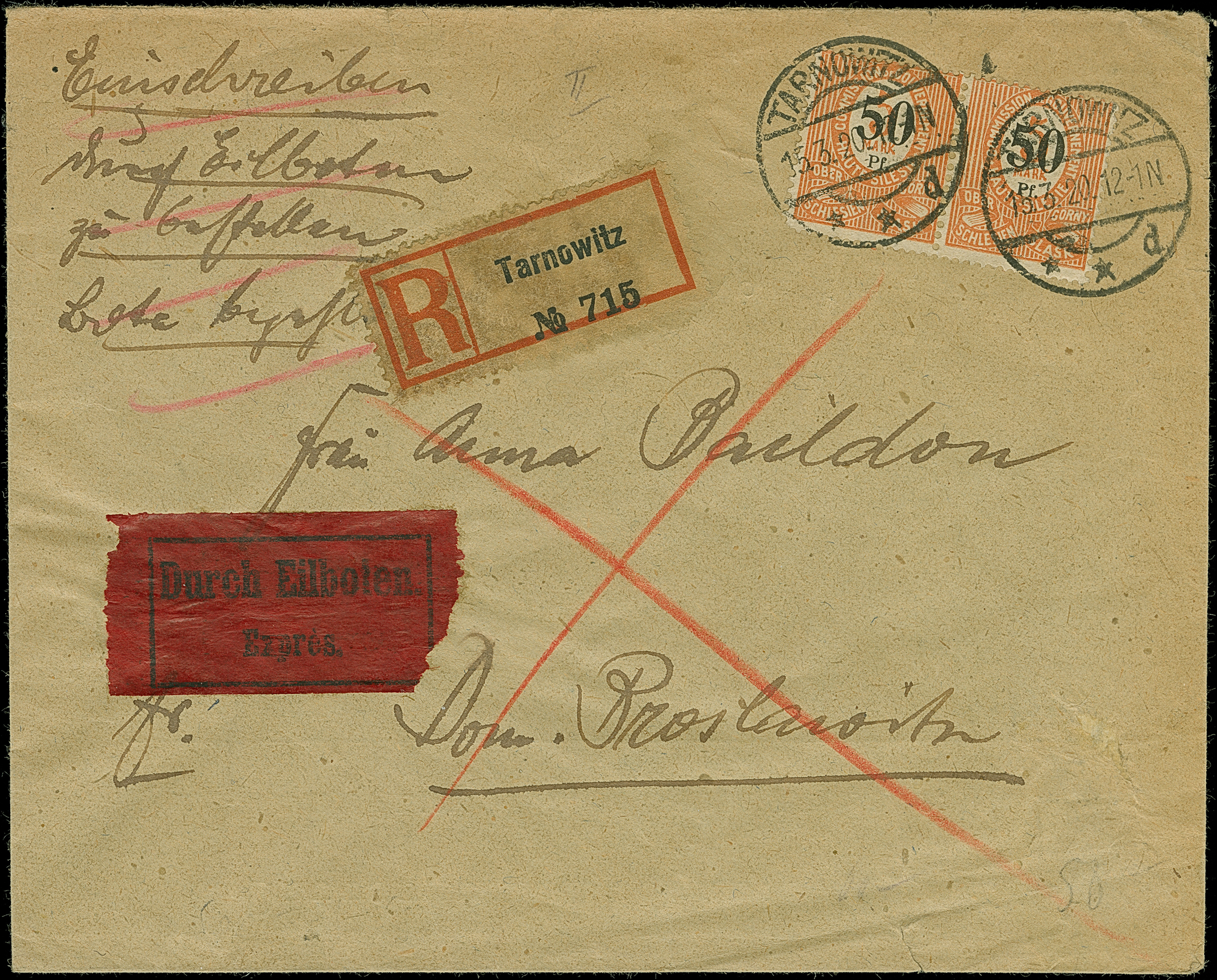 1920, 50 Pfennig auf 5 Mark orange, Aufdrucktype IIa, waagerechtes Paar, sauber mit Stempel “TARNOWITZ 15.3.20” auf portogerechtem Eil-R-Brief nach Broslawitz, ohne Ankunftsstempel, die linke untere Marke ein kurzer Eckzahn, sonst tadellos, eine sehr seltene Frankatur, Fotoattest Gruber BPP (2013)