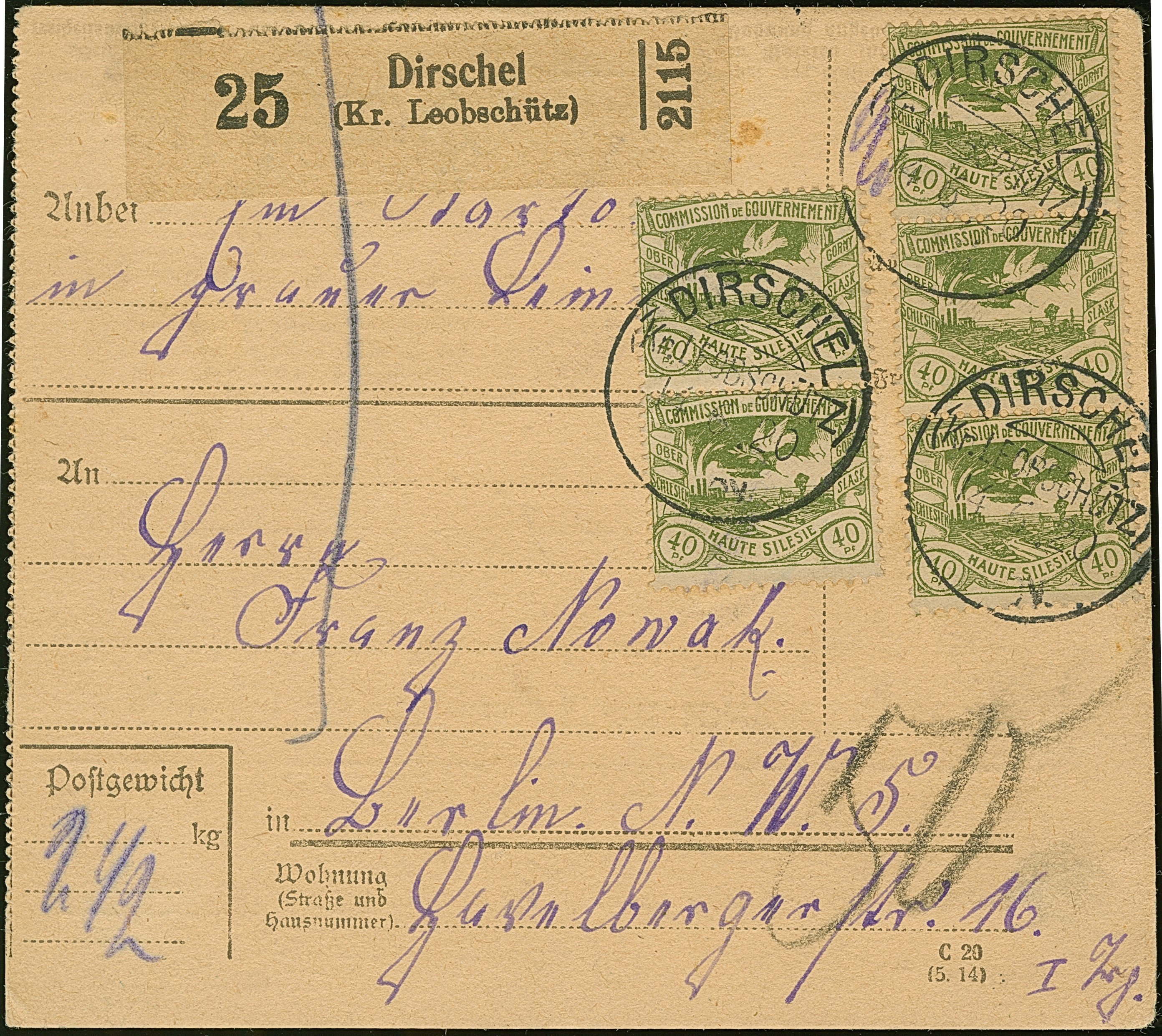 1920, Hüttenwerke 40 Pfennig grünoliv, senkrechtes Paar sowie senkrechter Dreierstreifen, sauber mit Stempel “DIRSCHEL 14.6.20” auf Paketkarte nach Lublin, gute Erhaltung