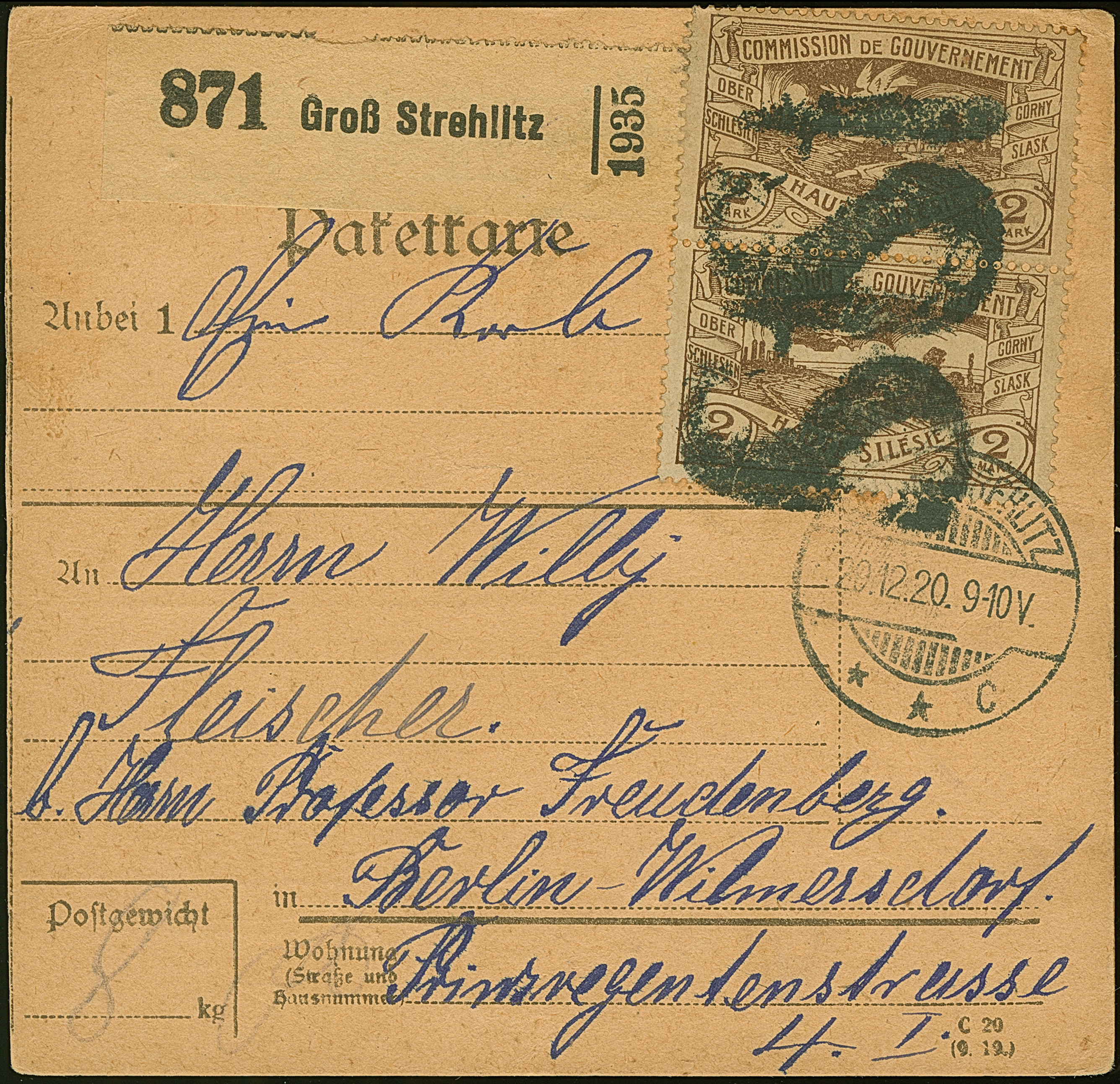 1920, Hüttenwerke 2 Mark braun, senkrechtes Paar, mit großem Korkstempel “St” sowie Stempel “GROSS STREHLITZ 20.12.20” auf Paketkarte nach Berlin, winzig getönt, sonst in guter Erhaltung