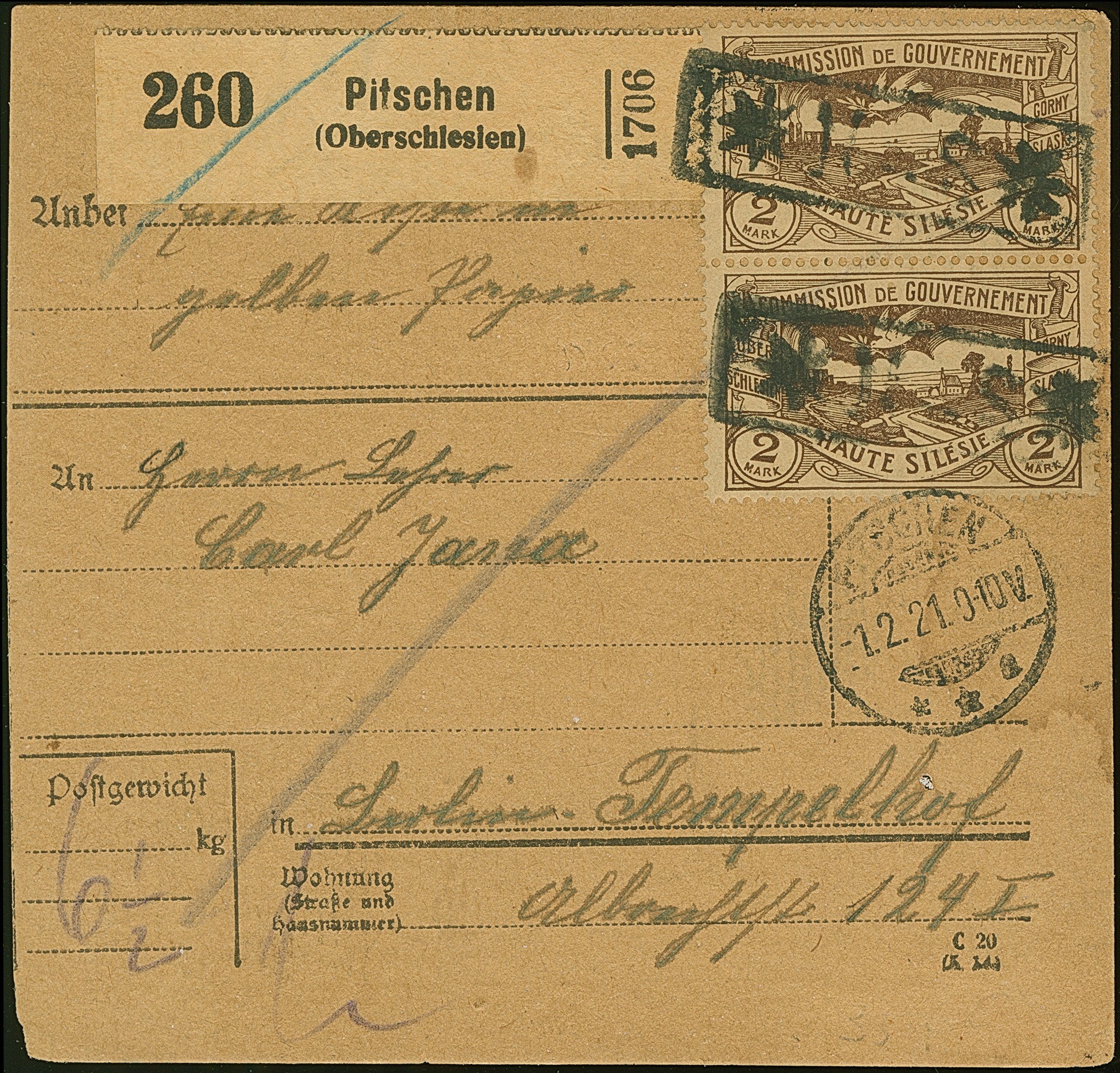 1920, Hüttenwerke 2 Mark braun, senkrechtes Paar, mit großem Korkstempel “* H . S * ” sowie Stempel “PITSCHEN -1.2.21” auf Paketkarte nach Berlin, winzig getönt, sonst in guter Erhaltung