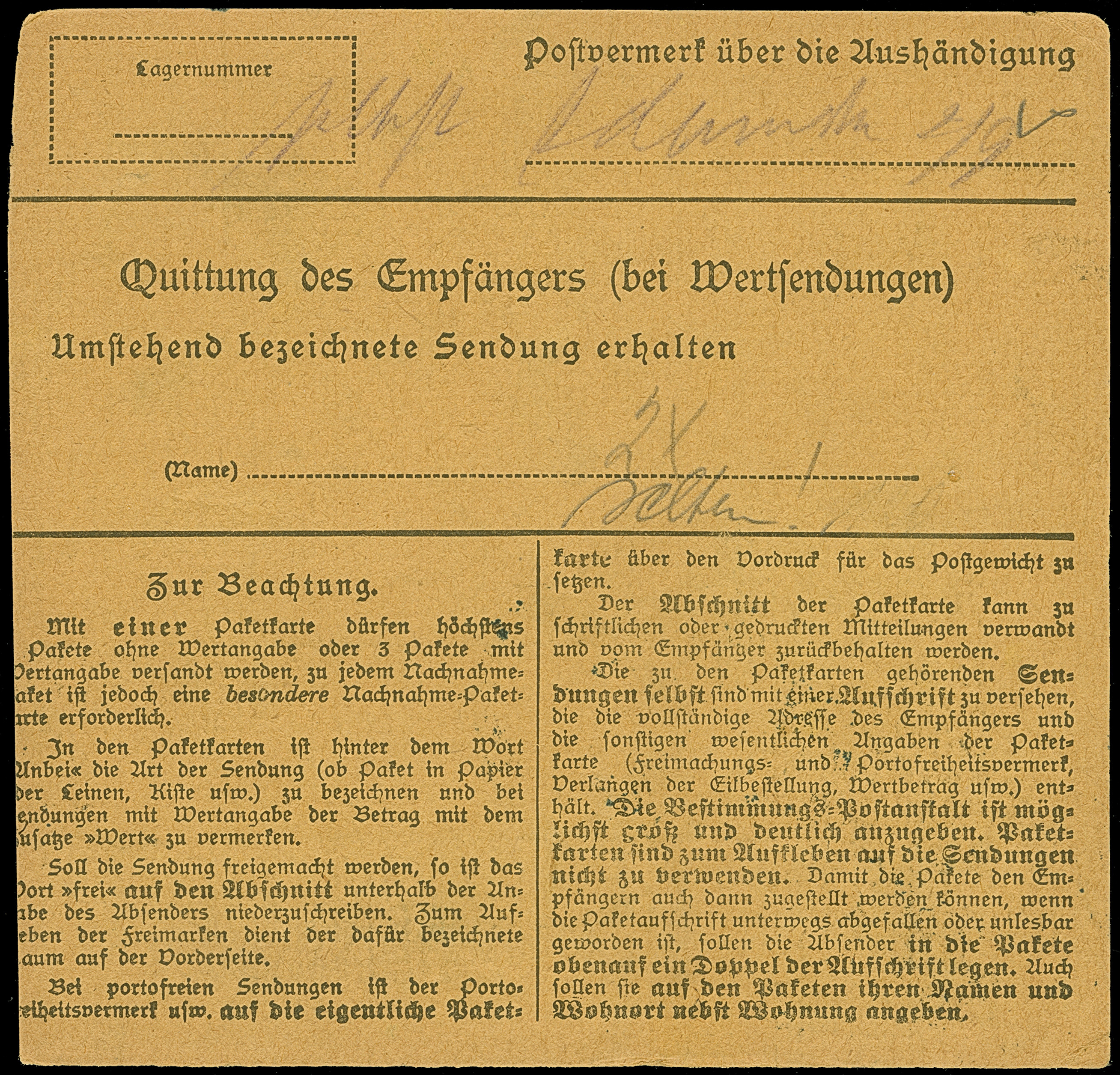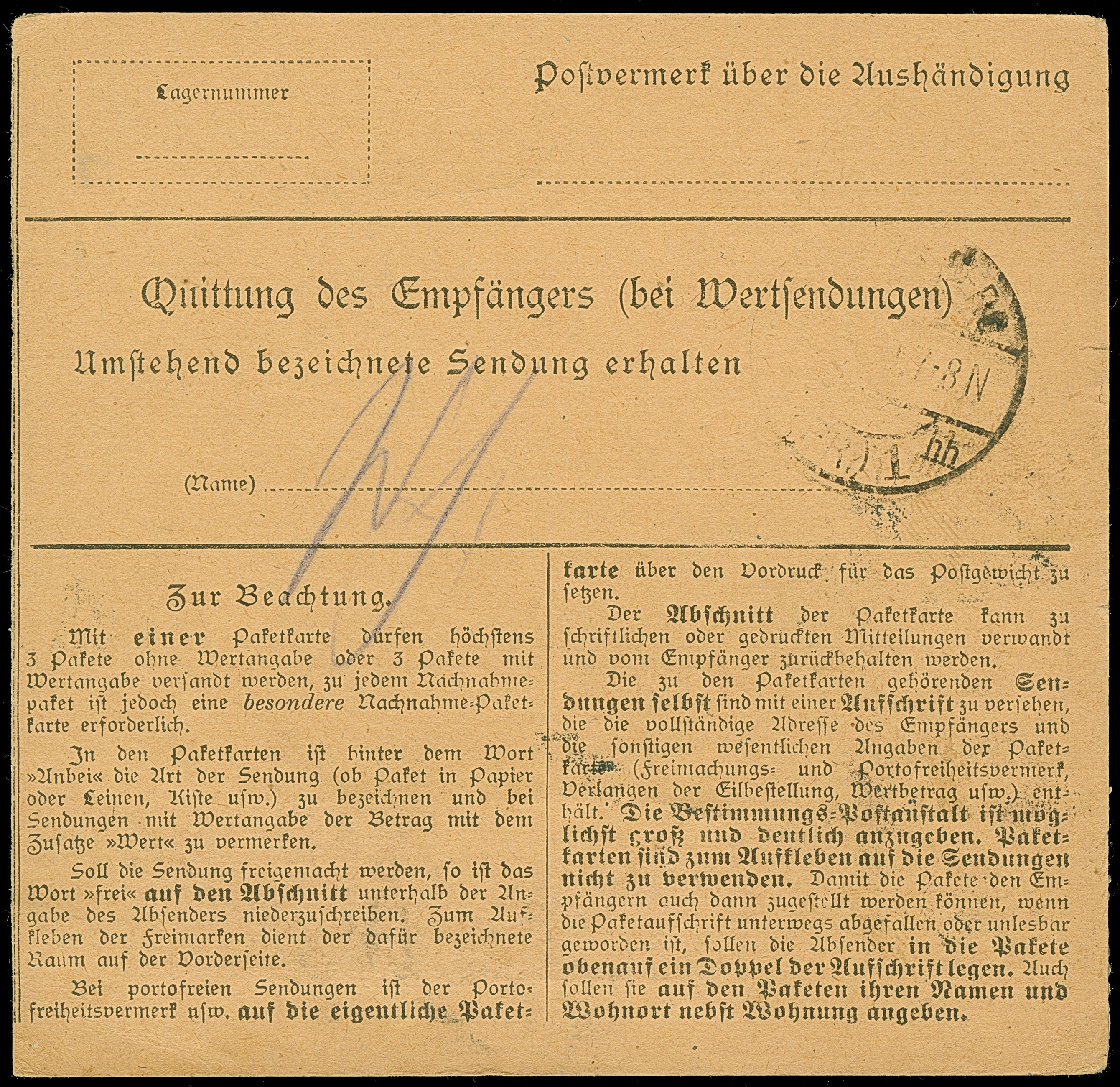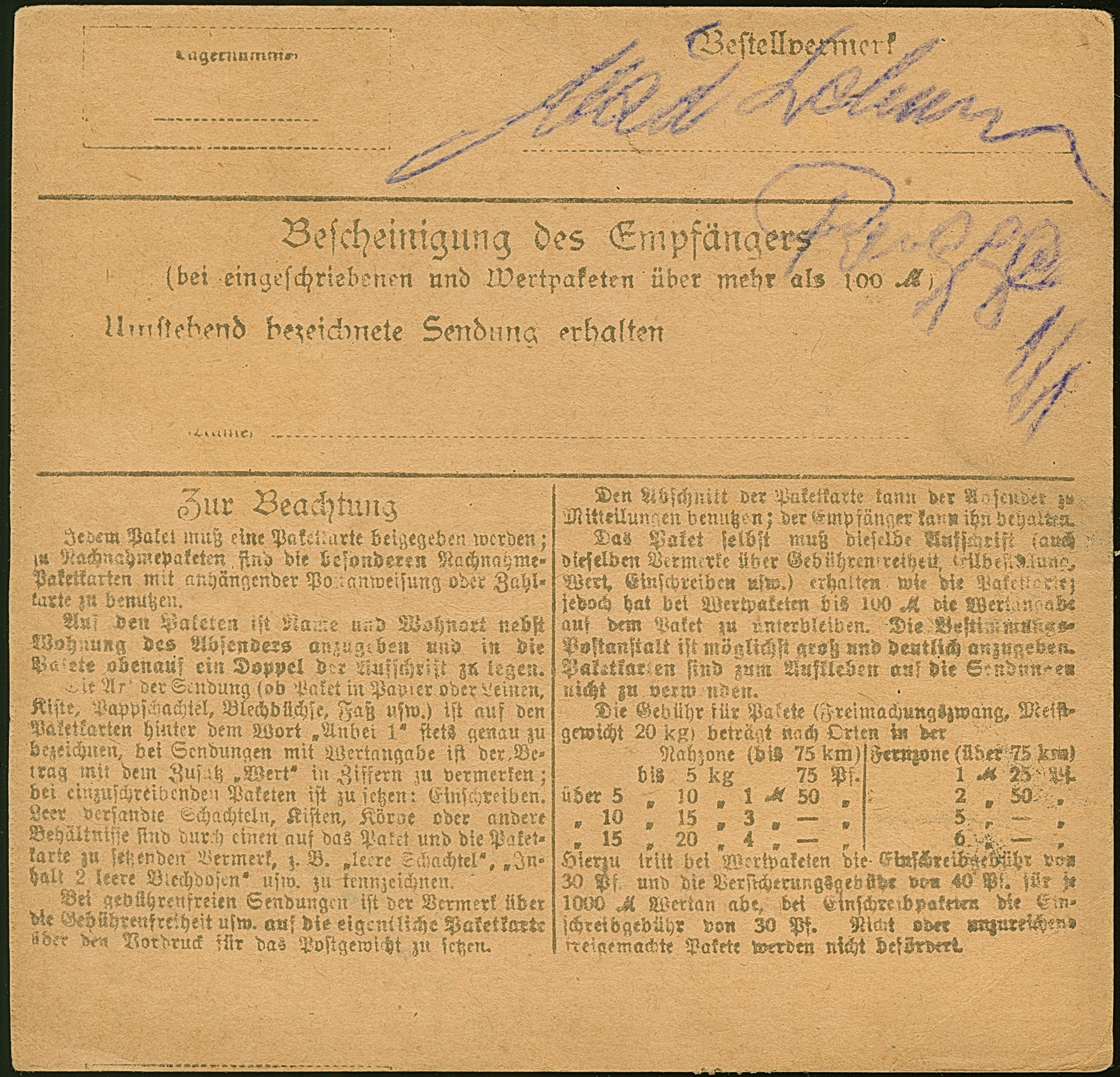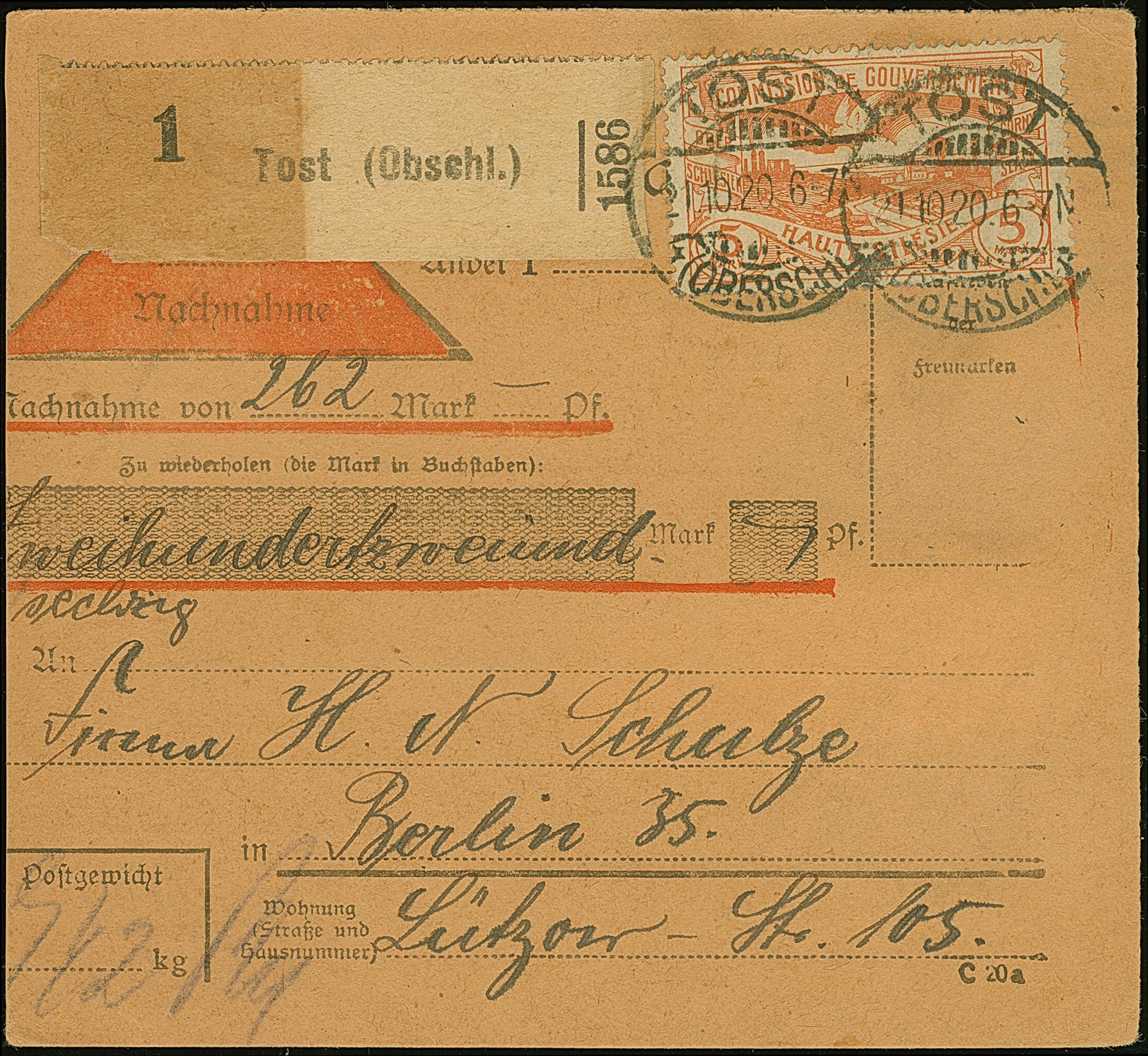 1920, Hüttenwerke 5 Mark orange, sauber mit Stempel “TOST 21.10.20” auf Nachnahmepaketkarte über “262 Mark” nach Berlin, eine seltene Frankatur, der Paketzettel links etwas gebräunt, sonst in guter Erhaltung