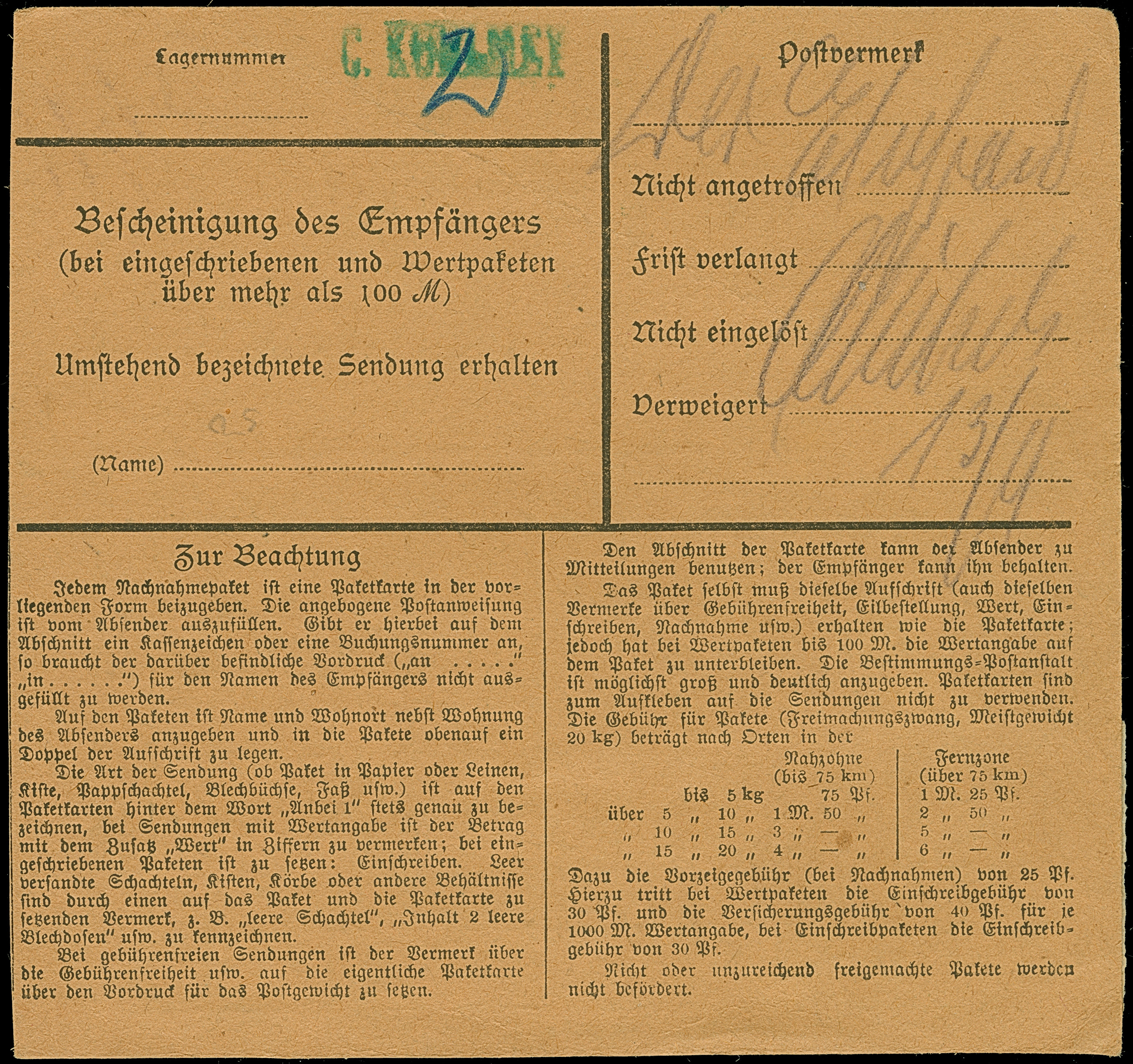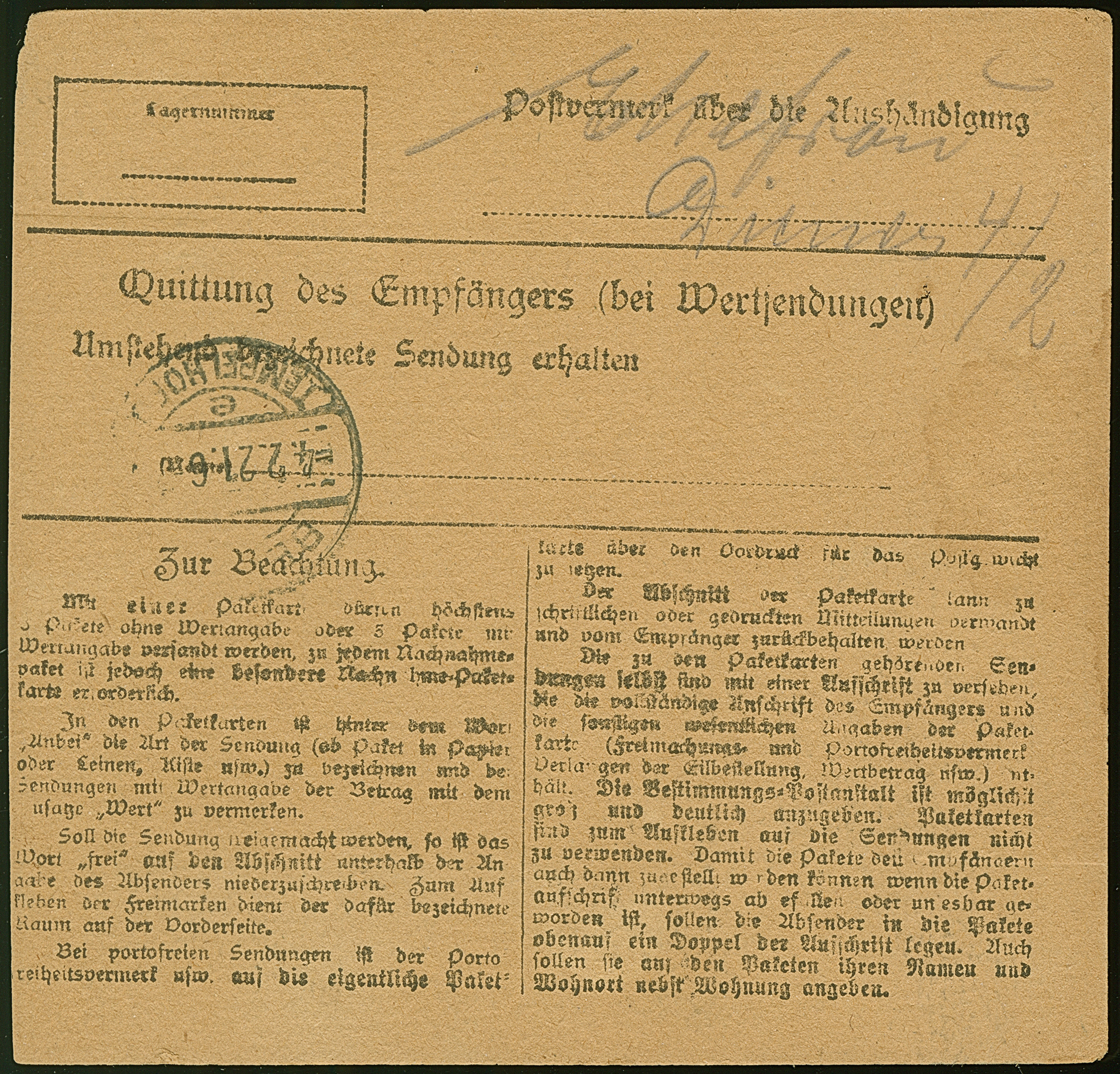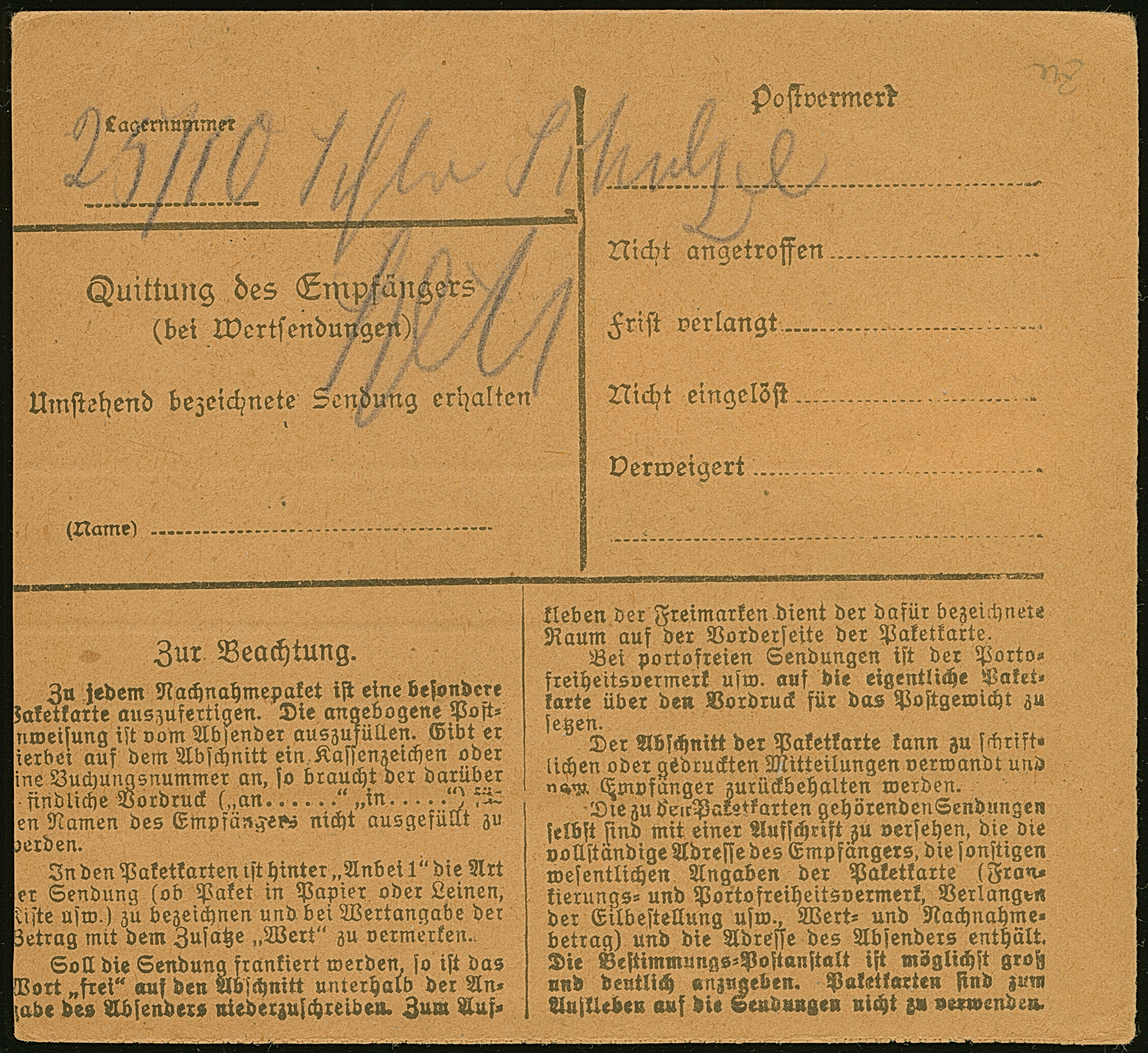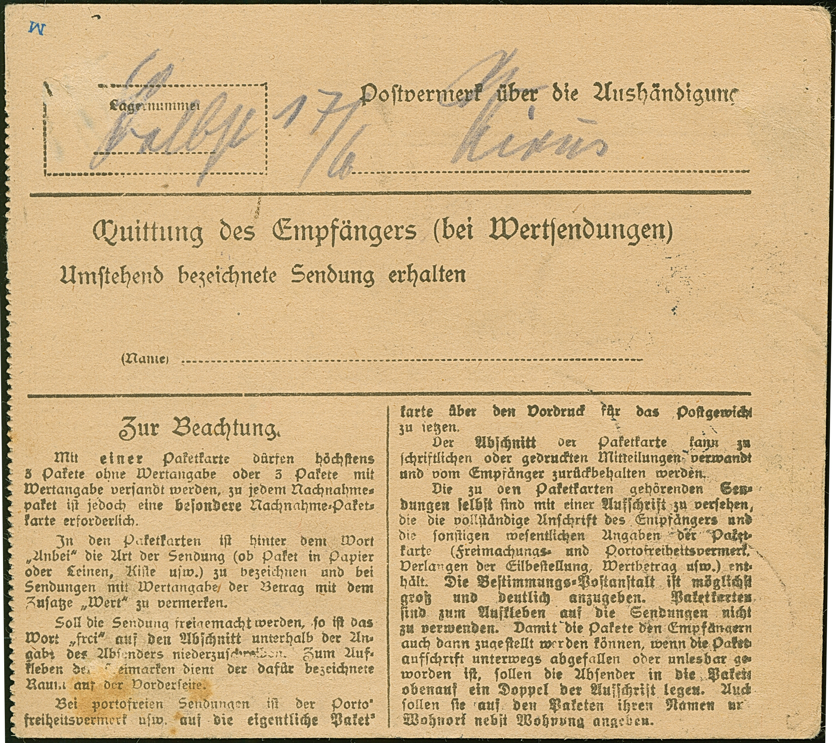 1920, Hüttenwerke 5 Mark orange, sauber mit Stempel “TOST 21.10.20” auf Nachnahmepaketkarte über “262 Mark” nach Berlin, eine seltene Frankatur, der Paketzettel links etwas gebräunt, sonst in guter Erhaltung