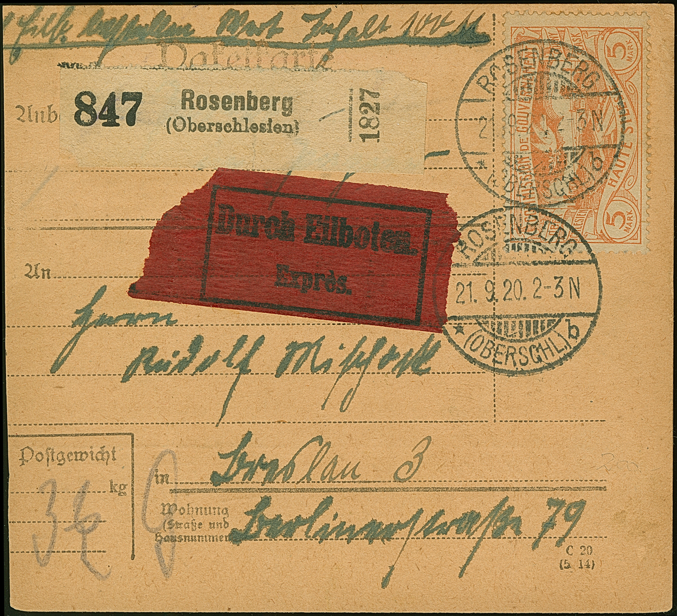 1920, Hüttenwerke 5 Mark orange, sauber mit Stempel “ROSENBERG 21.9.20” auf Wert-Paketkarte über 100 Mark nach Breslau, eine seltene Frankatur, gute Erhaltung