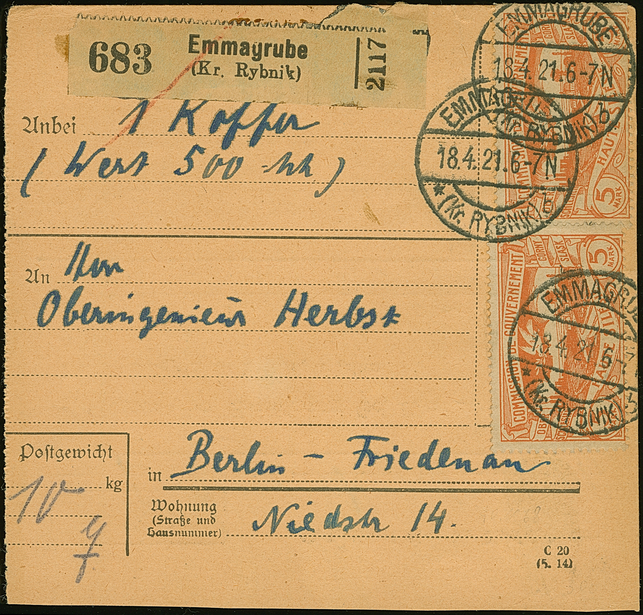 1920, Hüttenwerke 5 Mark orange, zwei Einzelwerte, sauber mit Stempel "EMMAGRUBE 18.4.21" auf Paketkarte nach Berlin, obere Marke durch Randklebung etwas bestoßen, sonst in guter Erhaltung
