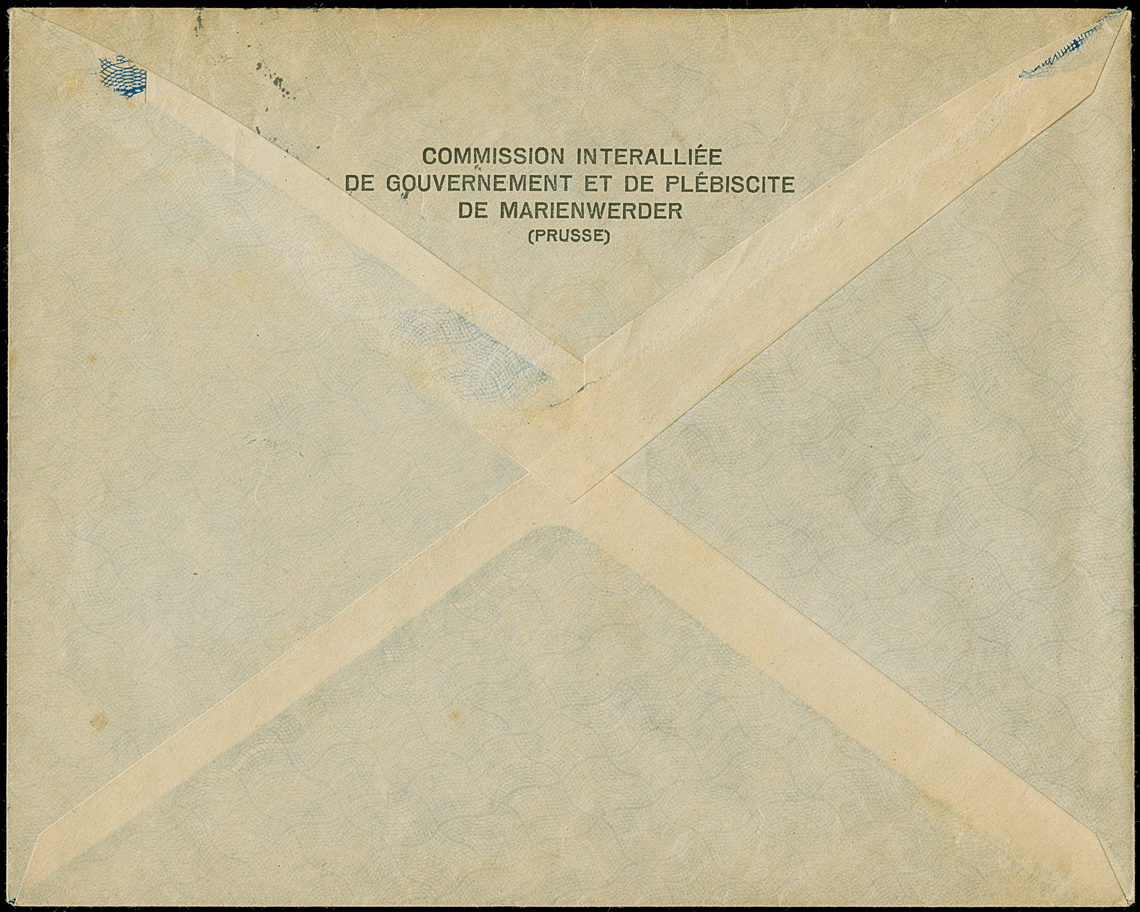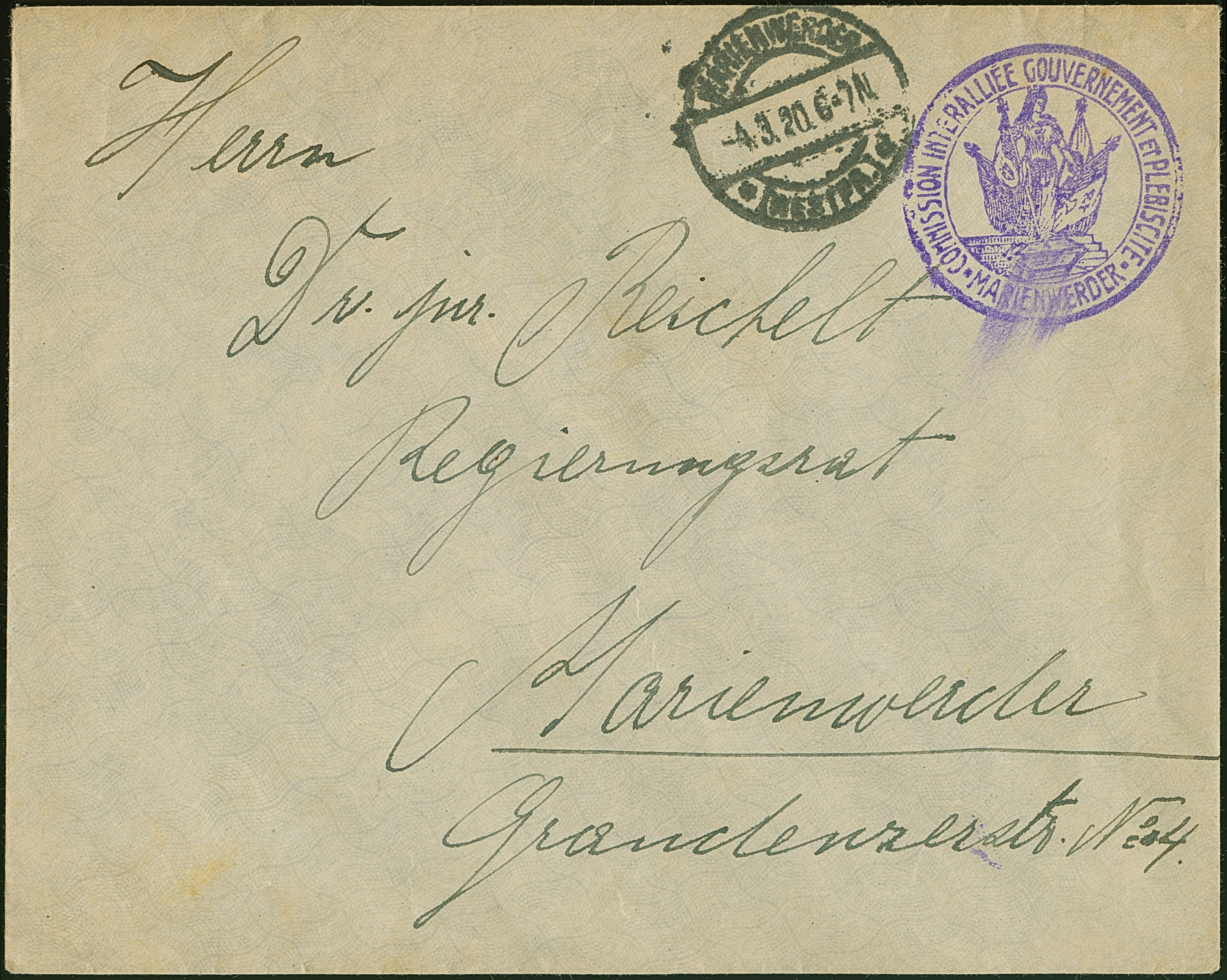1920, “COMMISSION INTERALLIEE GOUVERNEMENT ET PLESBICITE MARIENWERDER”, violettfarbenes Siegel mit nebengesetztem Aufgabestempel “MARIENWERDER -4.3.20” auf Briefkuvert mit vorgedrucktem Absender in der Klappe, im Ortsverkehr an den Regierungsrat Dr. jur. Reichelt gelaufen, gute Erhaltung