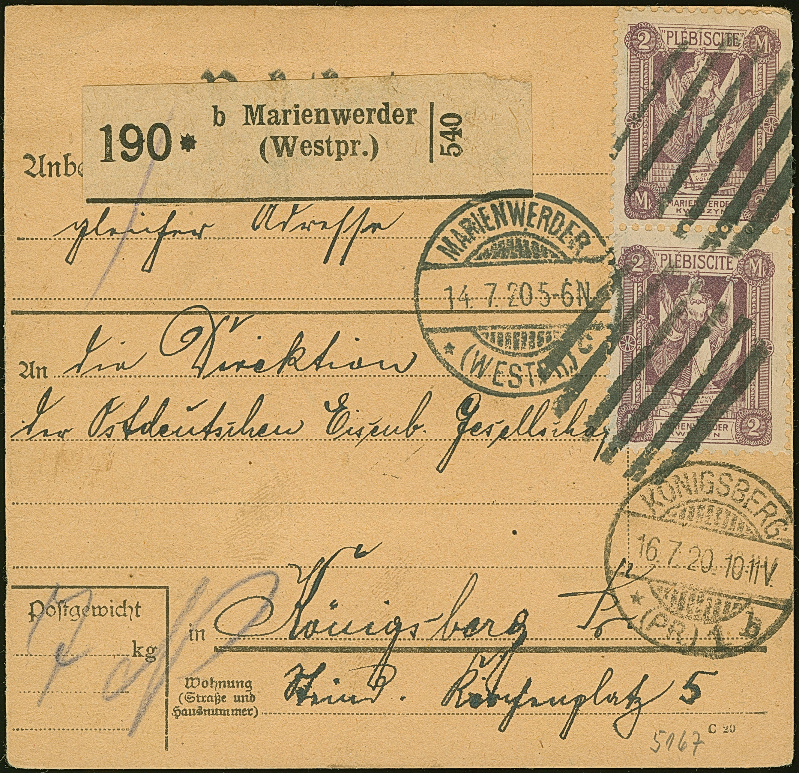 1920, 2. Mailänder Ausgabe 2 Mark, senkrechtes Paar, sauber mit Korkstempel und nebengesetztem Aufgabestempel “MARIENBURG 14.7.20” auf Paketkarte nach Königsberg mit Ankunftsstempel, Marken winzigst Randklebung, sonst gute Erhaltung