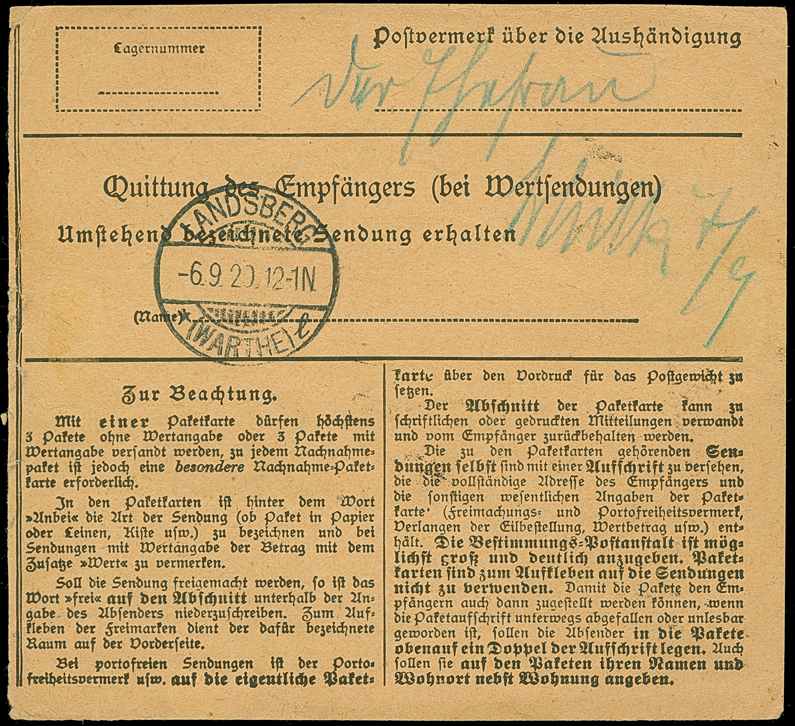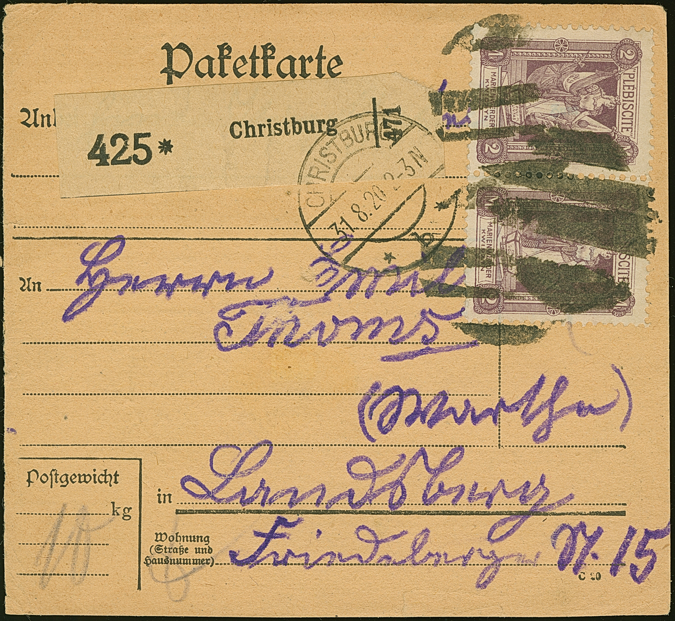 1920, 2. Mailänder Ausgabe 2 Mark, waagerechtes Paar, sauber mit Korkstempel und nebengesetztem Aufgabestempel “CHRISTBURG 31.8.20” auf Paketkarte nach Landsberg mit Ankunftsstempel, gute Erhaltung