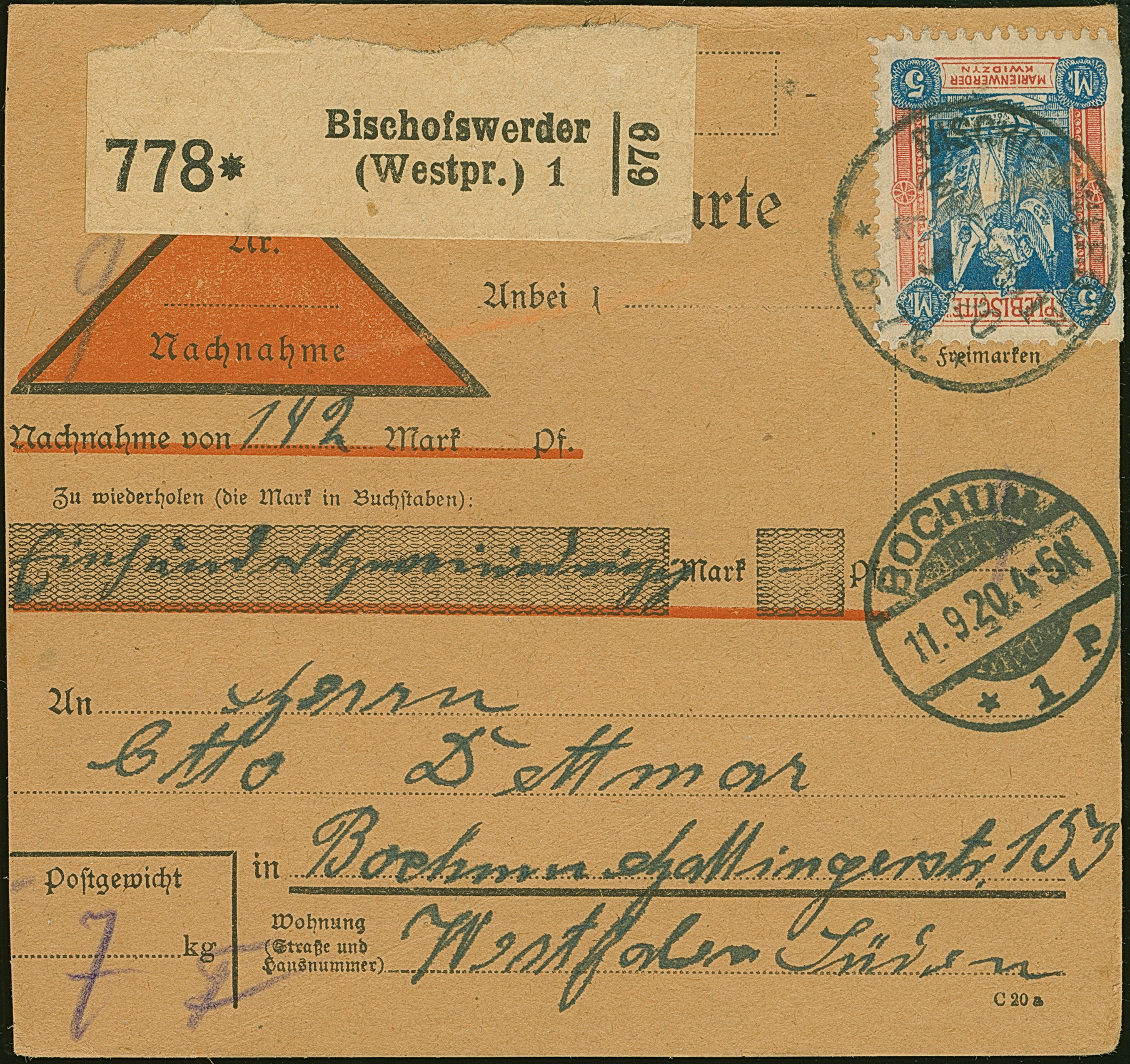 1920, 2. Mailänder Ausgabe 5 Mark, sauber Aufgabestempel “BISCHOFSWERDER 4 9 20” auf Nachnahme-Paketkarte über “192 Mark” nach Bochum mit Ankunftsstempel, die Marke mit Randklebung, sonst tadellos