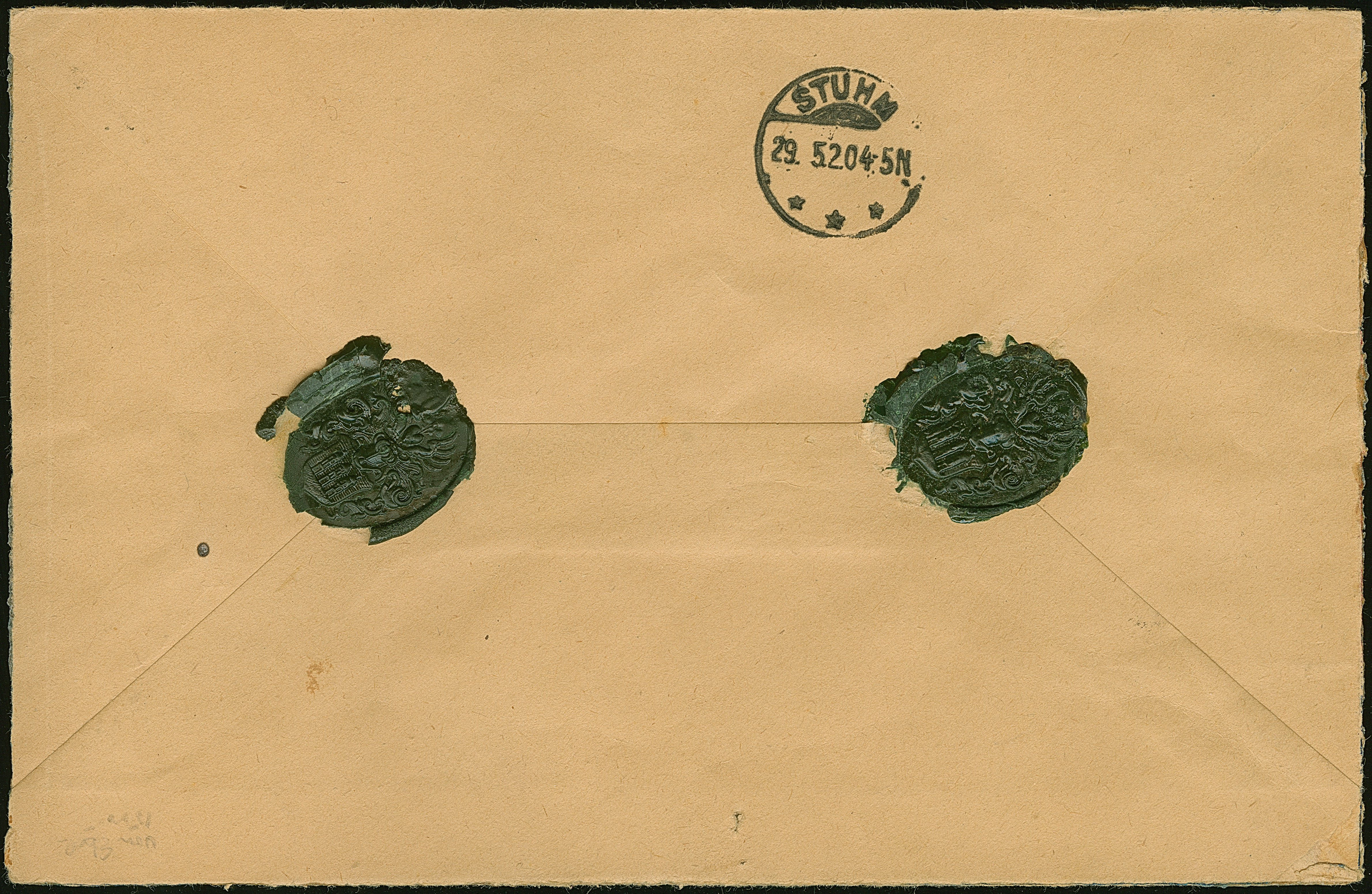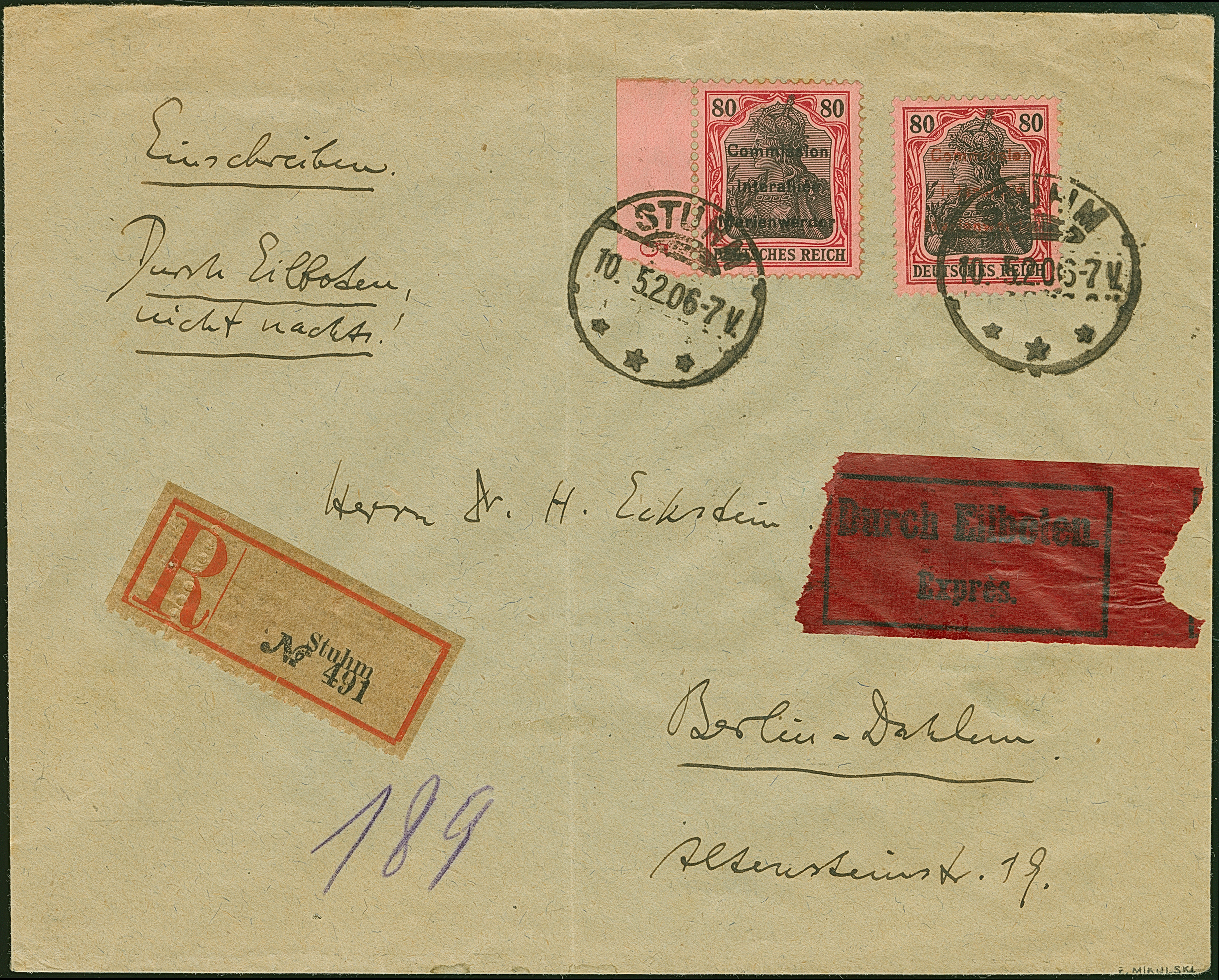 1920, Germania 80 Pfennig mit rotem Probeaufdruck, zusammen mit 80 Pfennig mit Normalaufdruck, sauber mit Stempel “STURM 10.5.20” auf noch zum alten Tarif frankiertem Eil-R-Brief nach Berlin mit Ankunftsstempel, einmal gefaltet, winzig fleckig, sonst tadellos, sehr selten, sign. Vossen sowie Fotoattest Mikulski (1987)