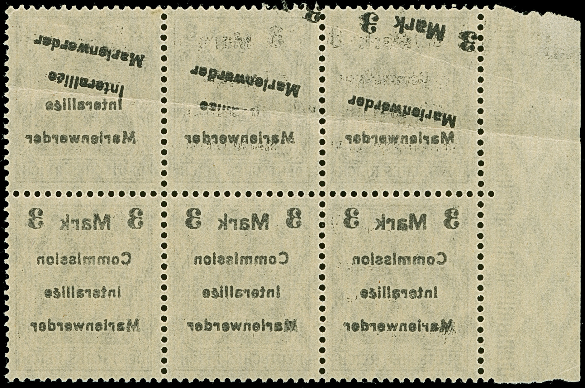 1920, Germania 3 Mark auf 3 Pfennig, 6er-Block mit linkem Seitenrand, Bogenfelder 1-3 und 11-13, durch Bogenumschlag die obere Zeile komplett ohne vorderseitigen Aufdruck, die untere Zeile bei der ersten Marke mit komplett fehlender 1. Zeile “3 Mark 3”, die mittlere Marke mit “fehlender 3 sowie teilweise fehlendem M in Mark” in der ersten Zeile, die obere Reihe mit teilweisem Aufdruck auf der Gummiseite, sowie alle Marken mit, zumindest in der unteren Zeile, vollständigem Aufdruck-Abklatsch, postfrisch, teils leicht vorgefaltet, tadellos mit den Abartenbedingten Bügen, sehr attraktive und seltene, ProFi hat in dieser Form kein weiteres Stück registriert, Fotoattest Bock BPP (2016)