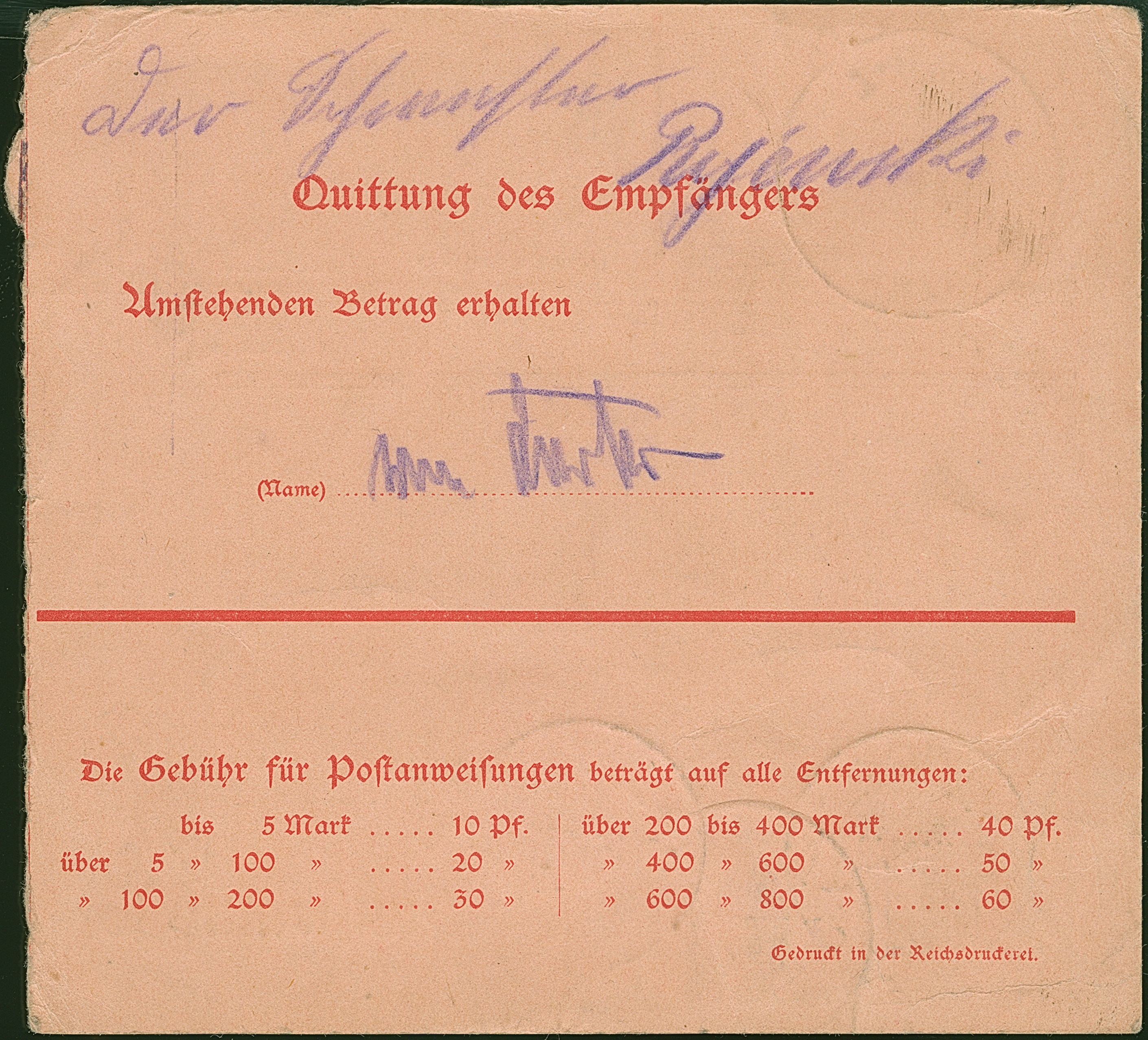 Westpreussisches Abtretungsgebiet 1920: Postanweisungsganzache Germania 10 Pfennig mit Zufrankatur 20 Pfennig als Aufbrauchsverwendung zusammen mit Polen Sejm 10 F., über “90 Mark 45 Pf.” ab “BRODNICA 19.3.20” (umgearbeiteter deutscher Stempel Strasburg) nach Niedek mit Ankunftsstempel “POKRZYDOWO 23.3”, tadellos, selten