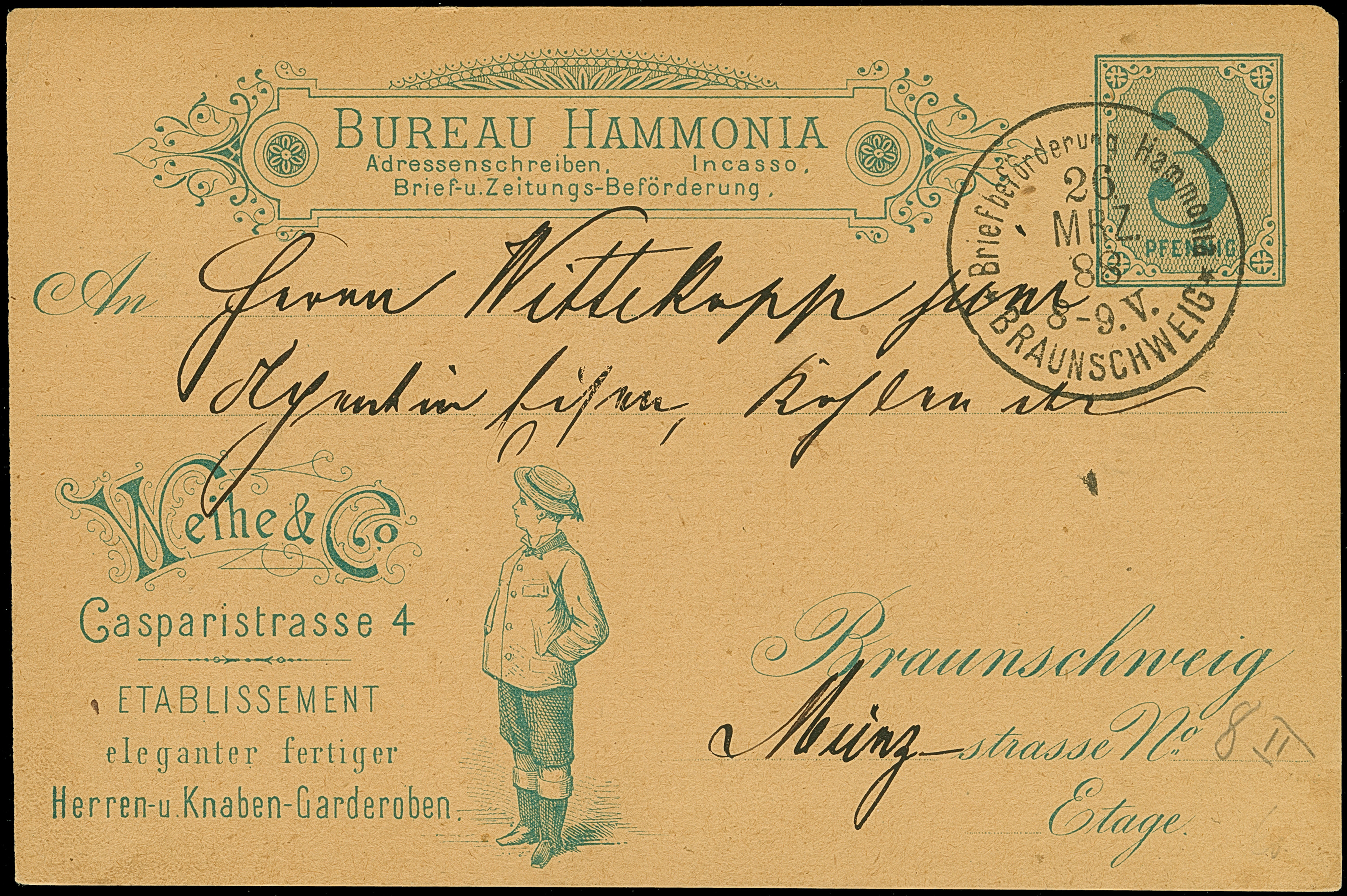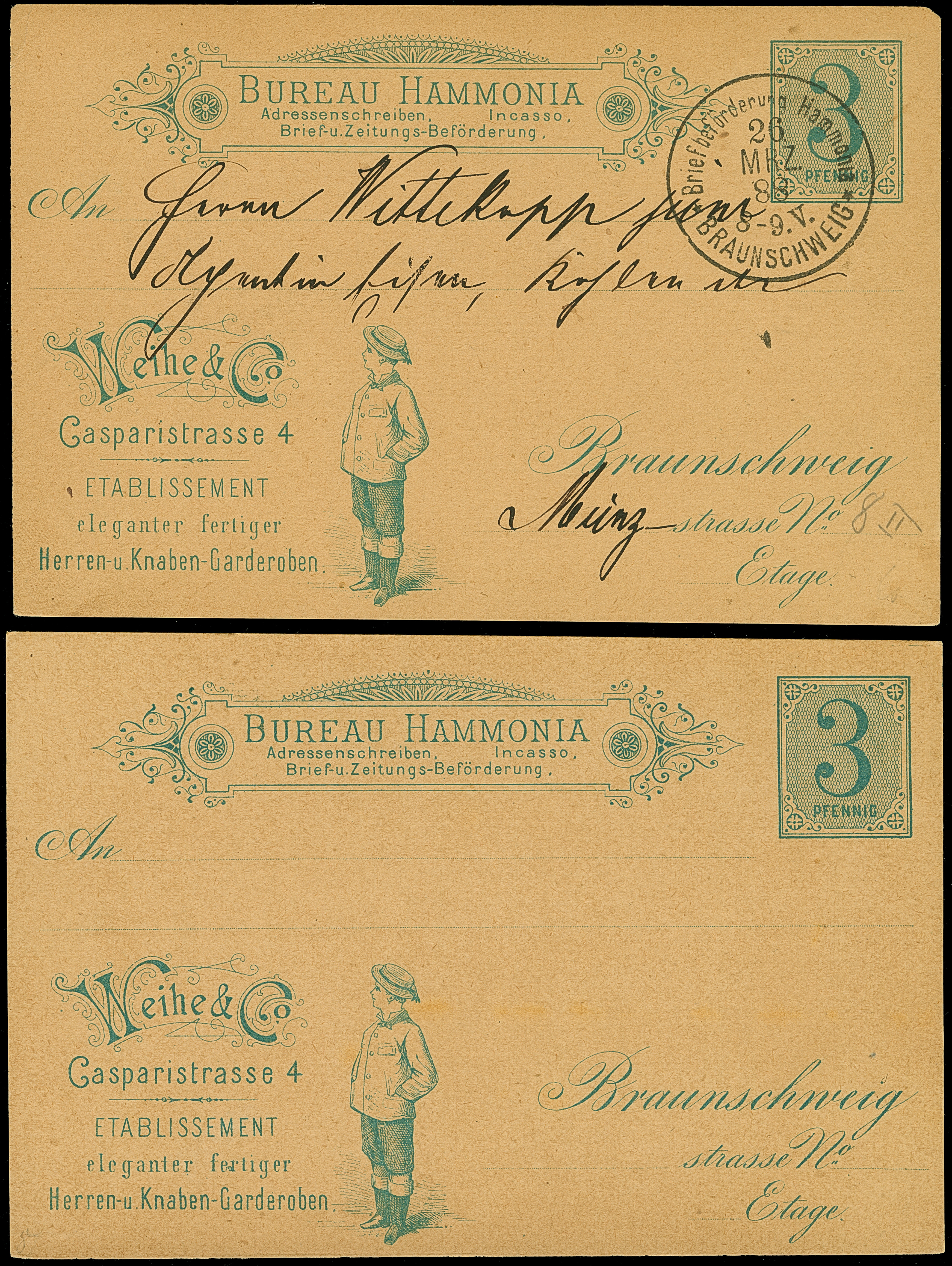 Hammonia: 1888, Ganzsachenkarte 3 Pfg. blau mit Werbung “Weihe & Co.” mit Abbildung eines Knaben mit Hut, einmal ungebraucht und einmal gebraucht mit Stempel “Briefbeförderung Hammonia BRAUNSCHWEIG 26.MRZ.88” und Text. Die gebrauchte Karte mit winzigen Eckfehler, ansonsten in guter Erhaltung