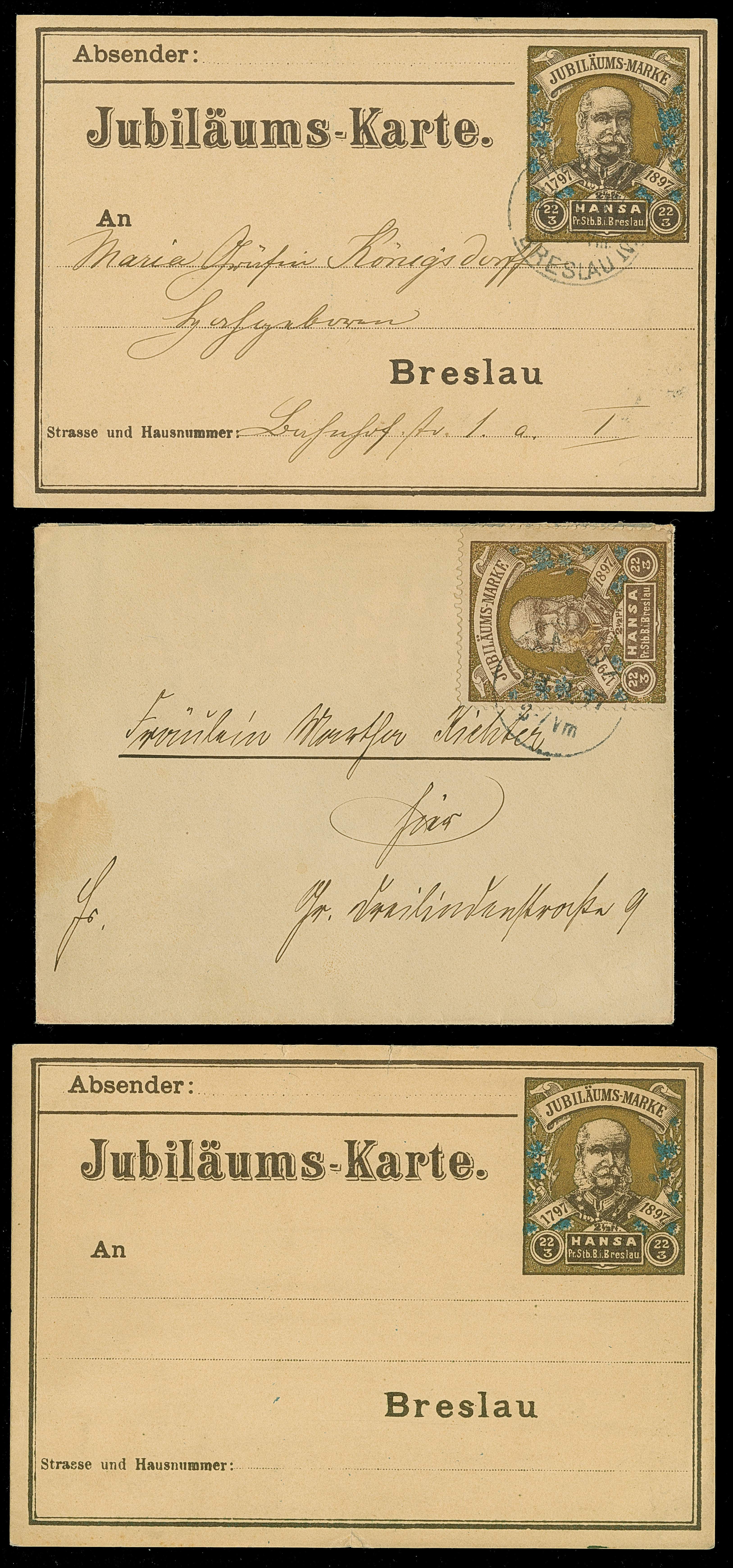 Hansa: 1897, Geburtstag Kaiser Wilhelm I. 2½ Pfg. mit Stempel “HANSA 23.3.97” auf Briefkuvert, dazu ungebraucht Jubiläums-Ganzsachenkarte 2½ Pfg. in Type III und gebrauchte Karte 2½ Pfg. in Type II, meist kleine Randspuren, in guter Gesamterhaltung