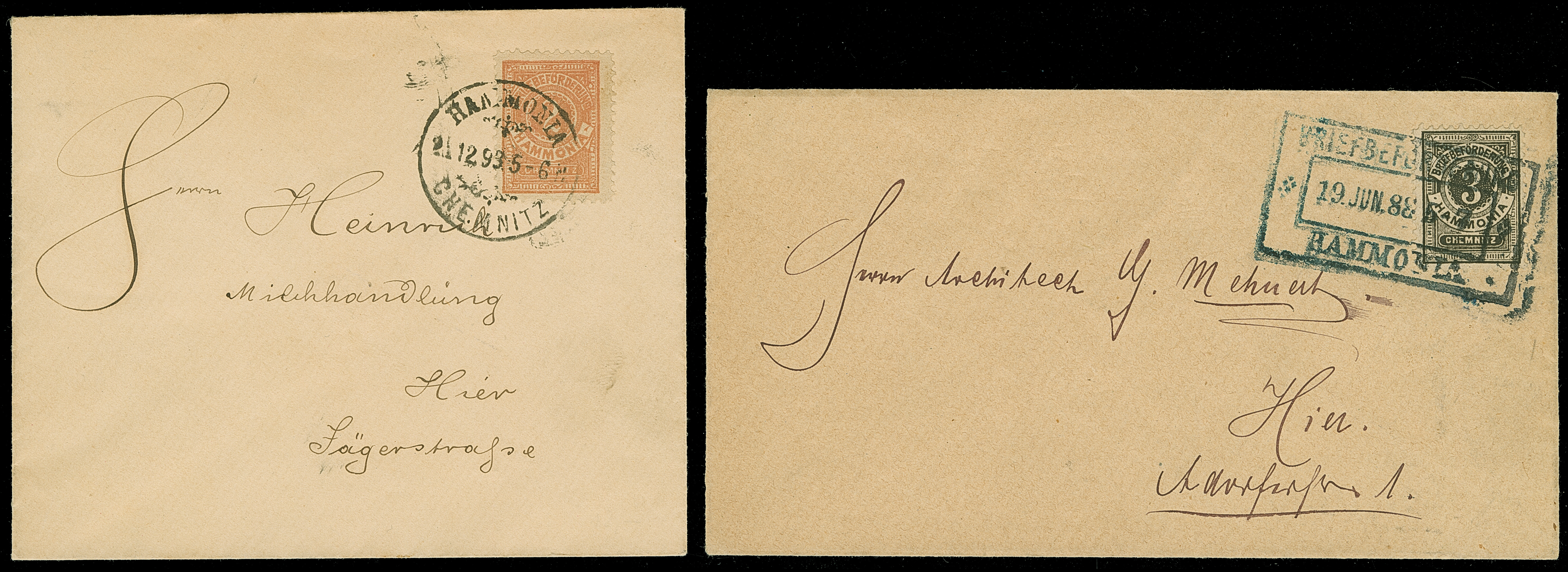Hammonia: 1888, Ziffer 3 Pfg. schwarz mit Rahmenstempel “BRIEFBEFÖRDERUNG HAMMONIA 19.JUN.88” auf Briefkuvert im Ortsverkehr, dazu 2 Pfg. hellbräunlichrot mit Stempel “HAMMONIA CHEMNITZ 21.12.93” auf Briefkuvert, in guter Erhaltung