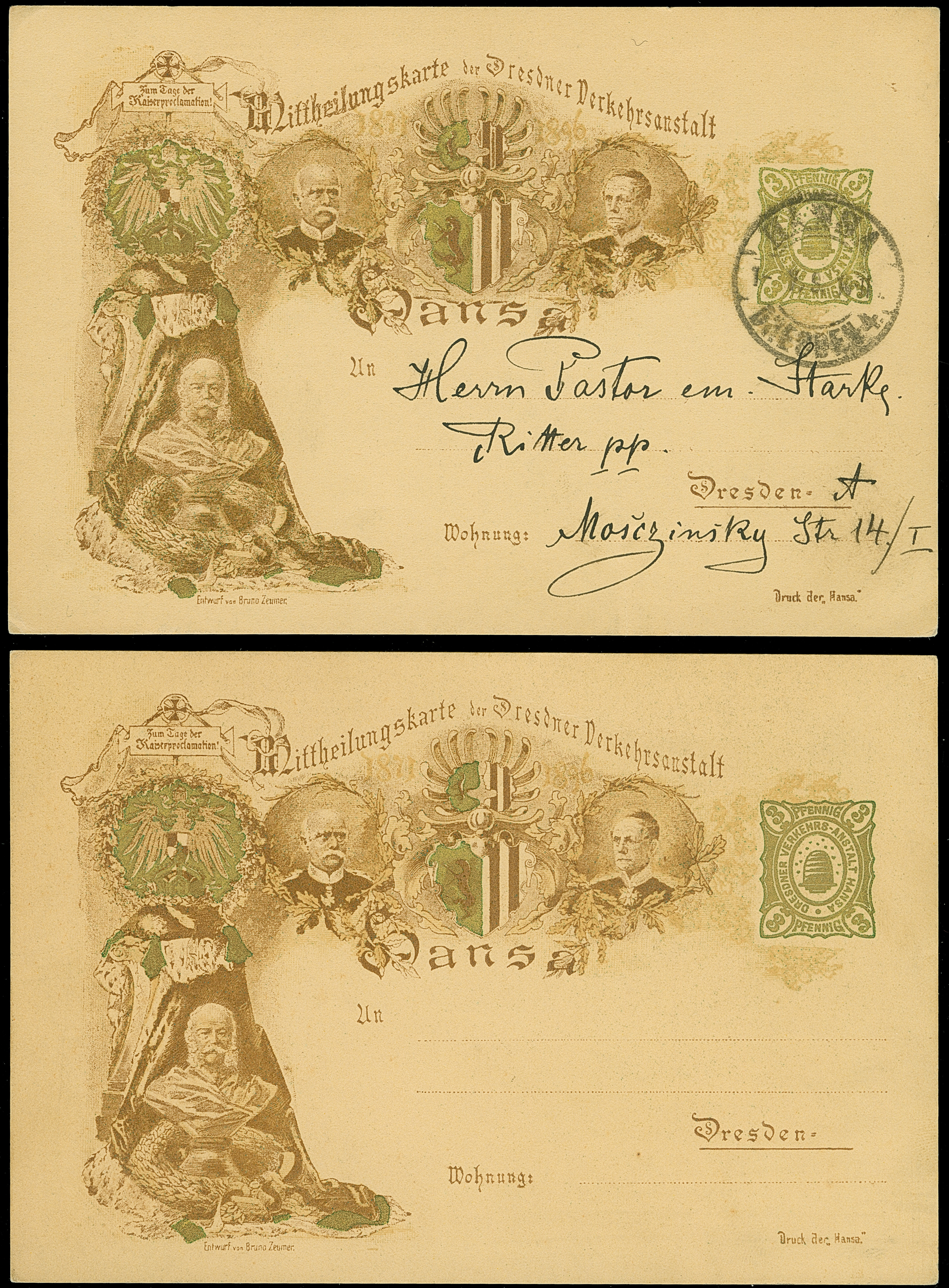 Hansa: 1896, Ganzsachenkarte 25. Jahrestag der Kaiserproklamation 3 Pfg. golden, einmal ungebraucht und einmal gebraucht mit Stempel “HANSA DRESDEN 1.10.96” und viel Text, in guter Erhaltung