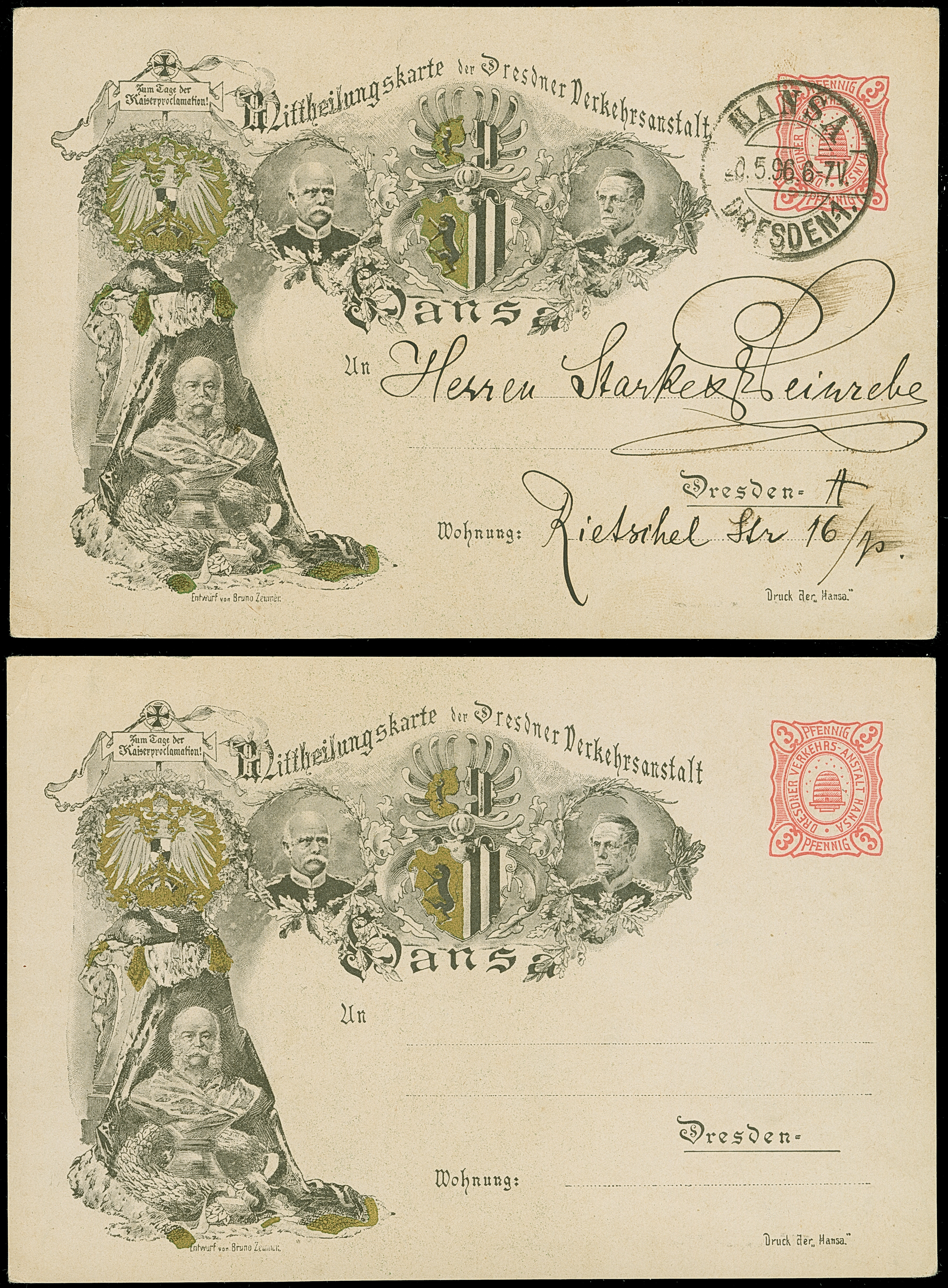 Hansa: 1896, Ganzsachenkarte 25. Jahrestag der Kaiserproklamation 3 Pfg.rot, einmal ungebraucht und einmal gebraucht mit Stempel “HANSA DRESDEN 20.5.96” und viel Grußtext, in guter Erhaltung