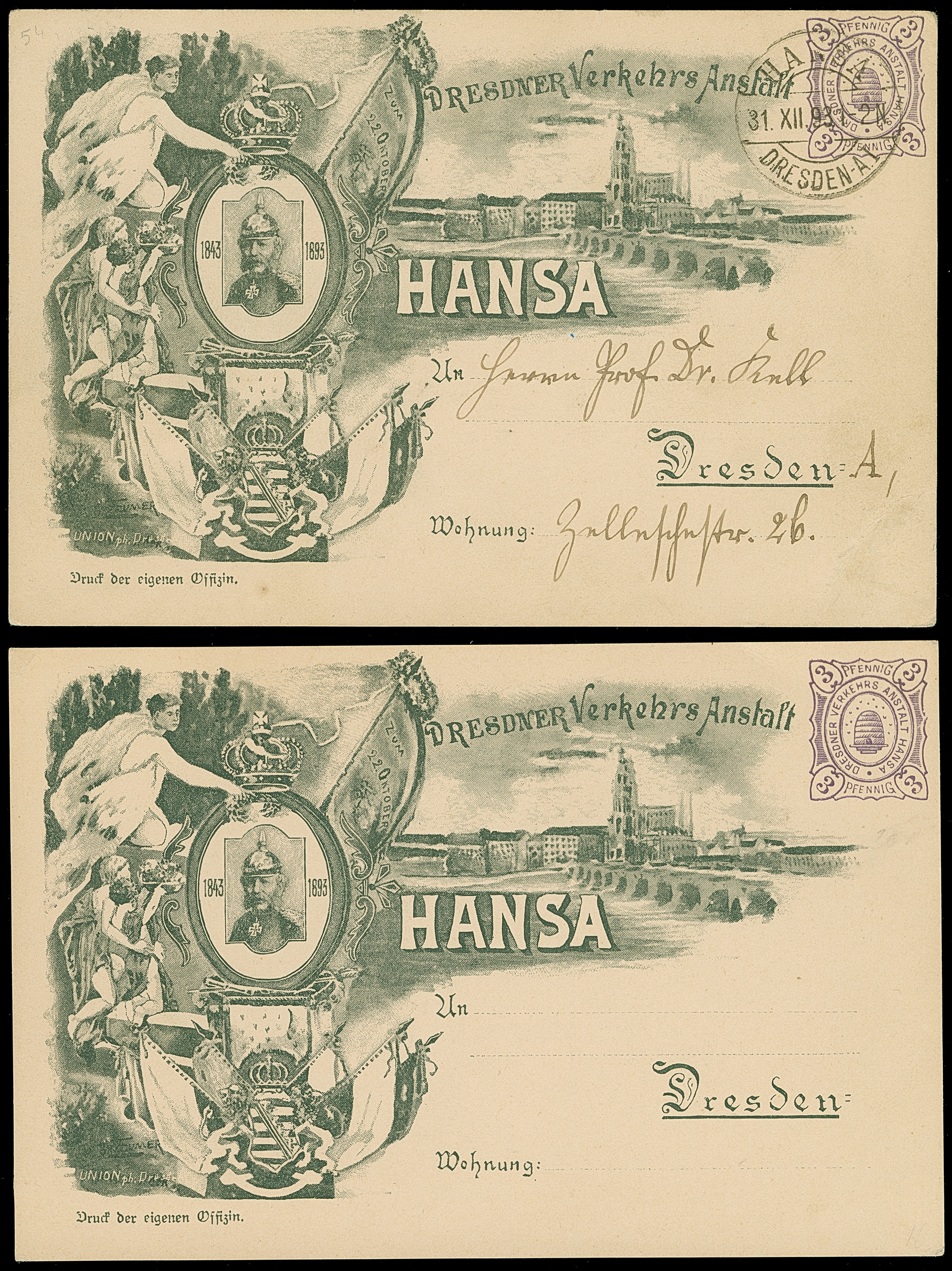 Hansa: 1483, Sonder-Ganzsachenkarte 3 Pfg. “König Albert zum 50-Jahr Jubiläum” ungebraucht und einmal gebraucht mit Stempel “HANSA DRESDEN-AII. 31.XII.93” und Text. Die gebrauchte Karte mit leichtem Eckbug, sonst in guter Erhaltung