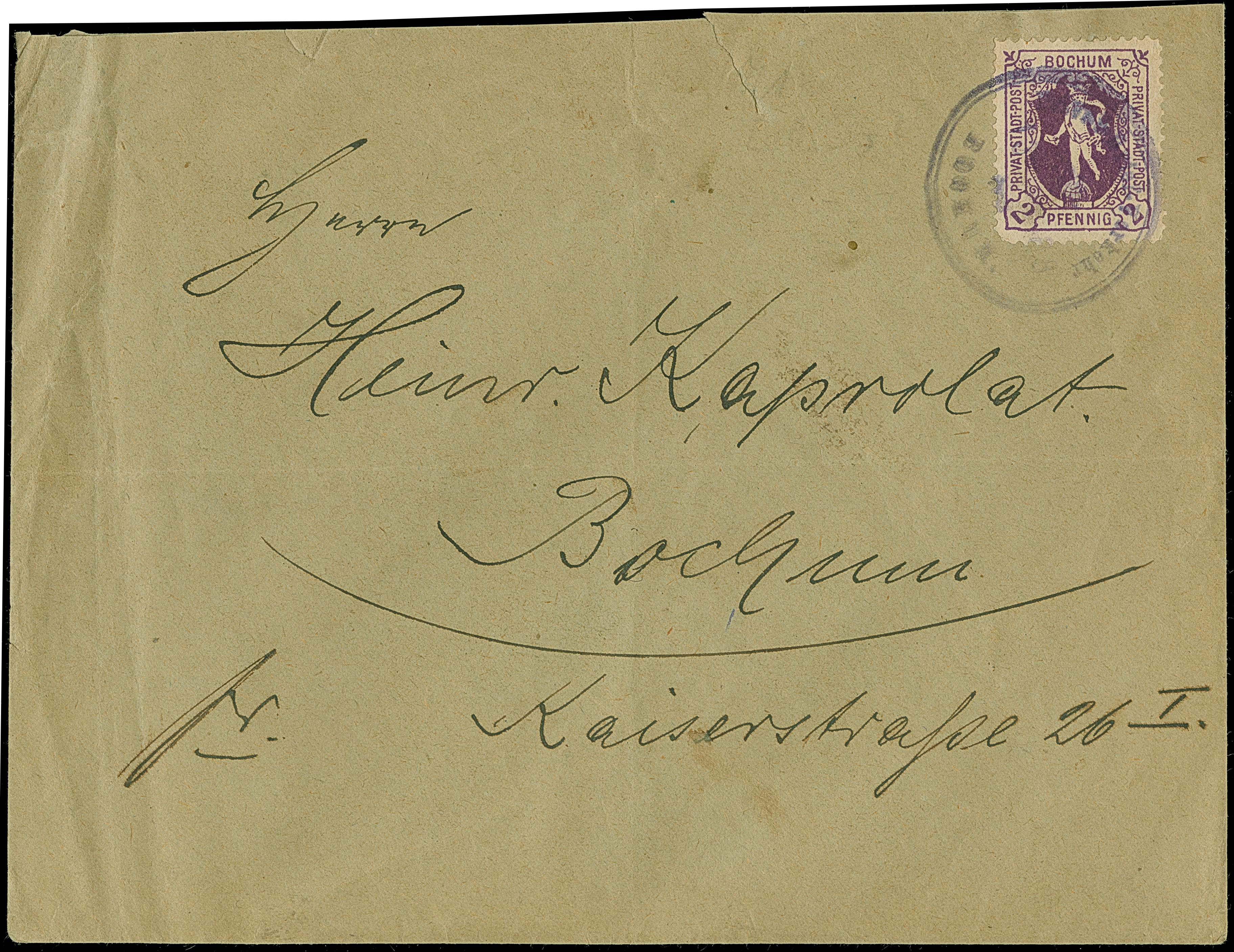Bochum-Express-Packet-Verkehr und Privat-Brief-Verkehr: 1888, Merkur auf der Erdkugel 2 Pfg. violett mit violettem Stempel “Privat-Brief-Verkehr Bochum” auf Ortsbrief. Der Umschlag mit Falt- und Beförderungsspuren und oben etwas verkürzt mit kleinen Randfehlern, die farbfrische Marke ist in einwandfreier Erhaltung. Eine sehr seltene Verwendung aus dem Bedarf