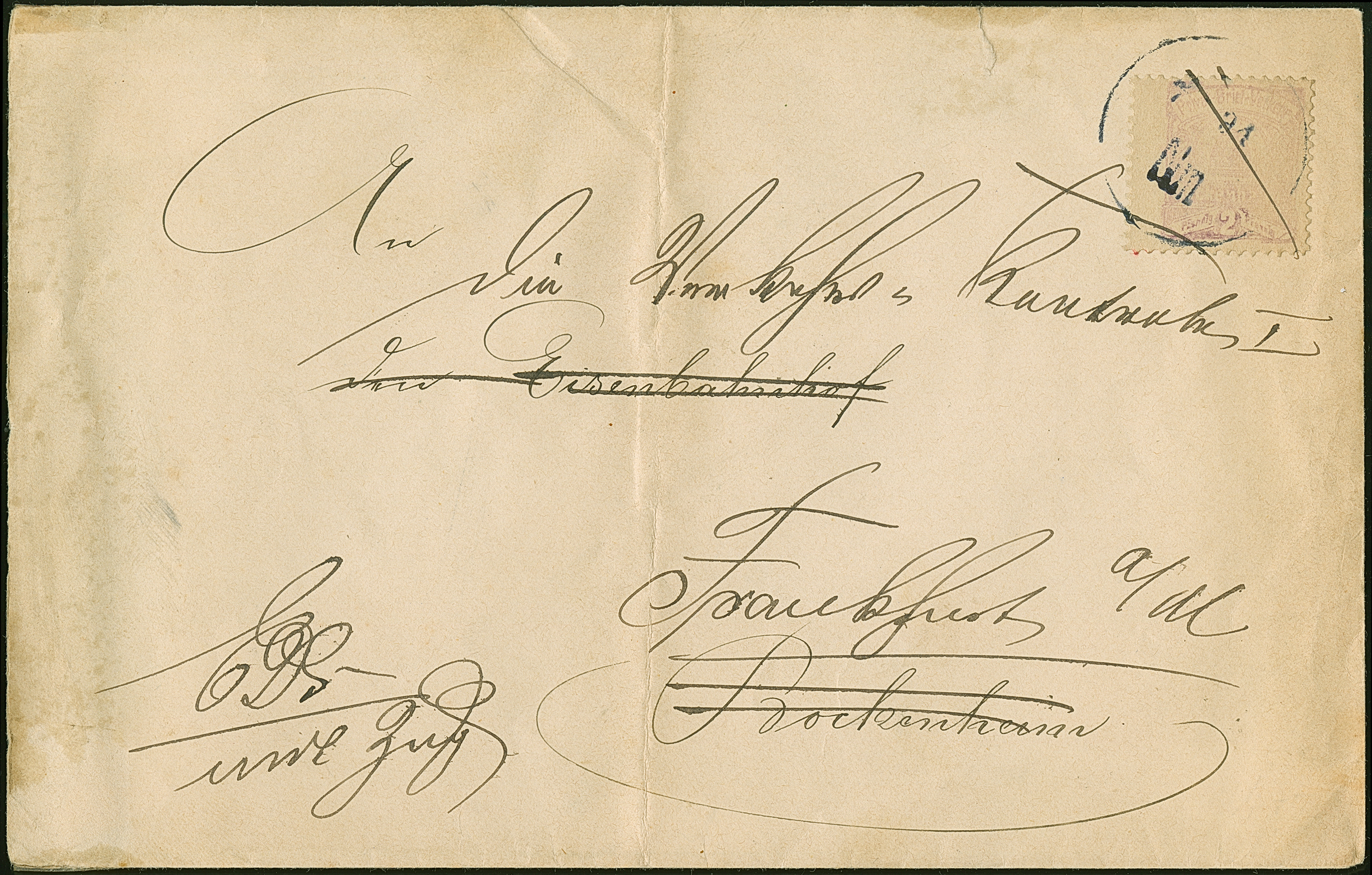 Bockenheim-Privat-Briefverkehr: 1892, 2 Pfg. violett (stark verblasst) mit Stempel “7 91 Nm” auf Brief mit Nachsendung an eine Adresse in Frankfurt. Der Umschlag mit senkrechter Faltung und Beförderungsspuren und rückseitig mit Tesa links verstärkt, sonst in guter Erhaltung, selten