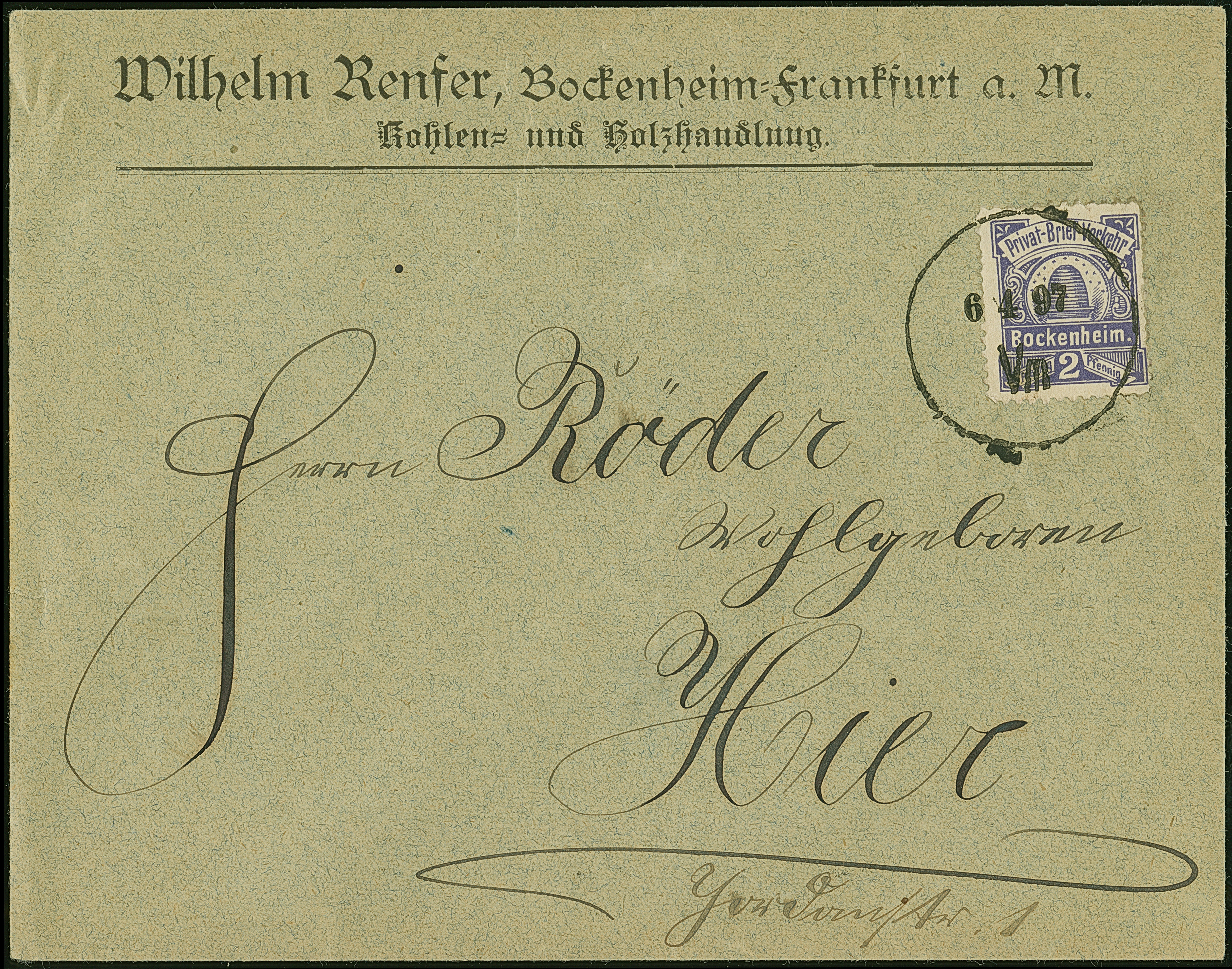 Bockenheim-Privat-Briefverkehr: 1896, 2 Pfg. lebhaftviolett mit Stempel “6.4.97 Vm” auf Vordruckbrief “Wilhelm Rnser, Bockenheim-Frankfurt a. M. Kohlen- und Holzhandlung” im Ortsverkehr, leichte Randspuren